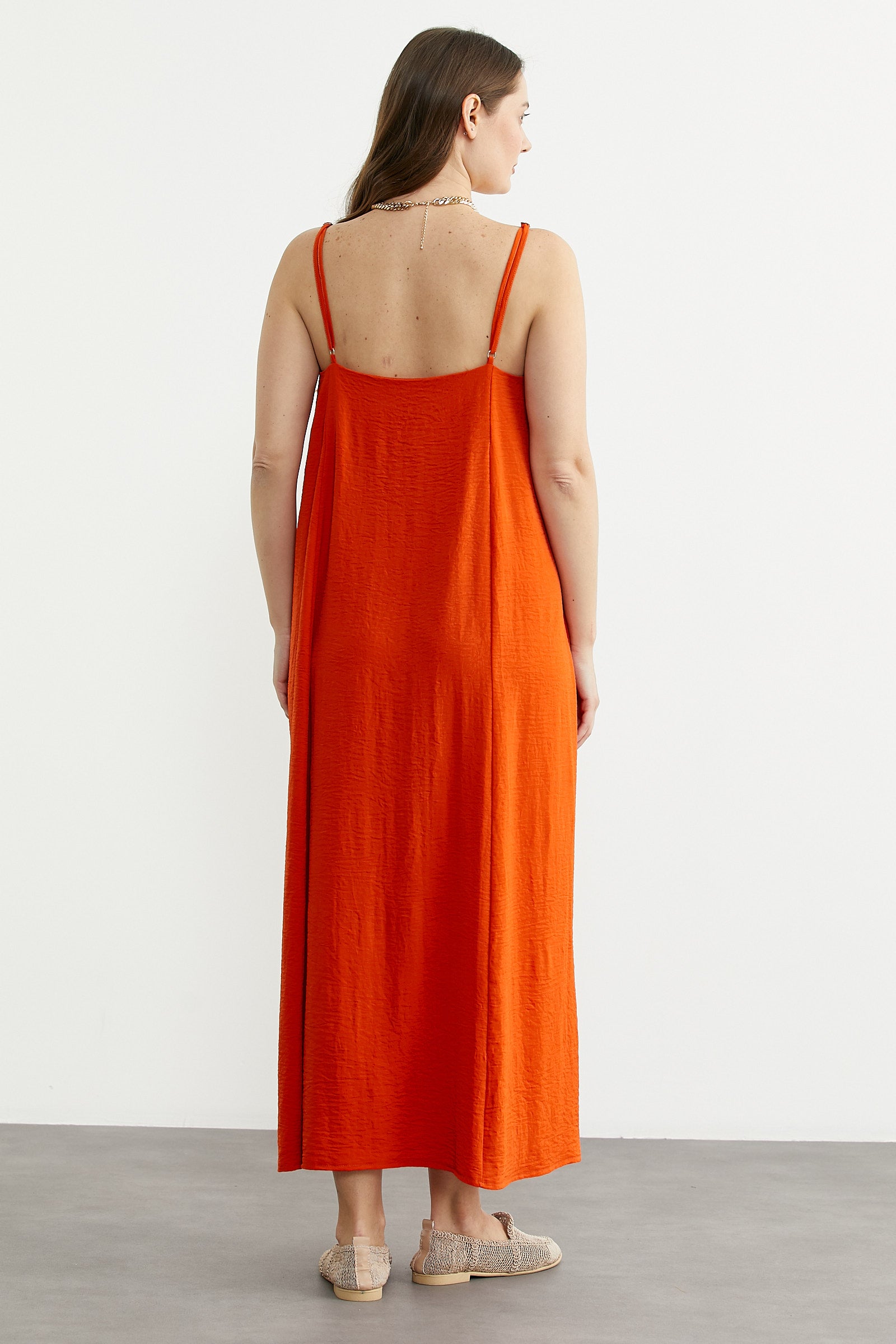 Ayarlanabilir ip askılı uzun elbise rahat kalıptır. Zarif ve şık görünüm sunar.