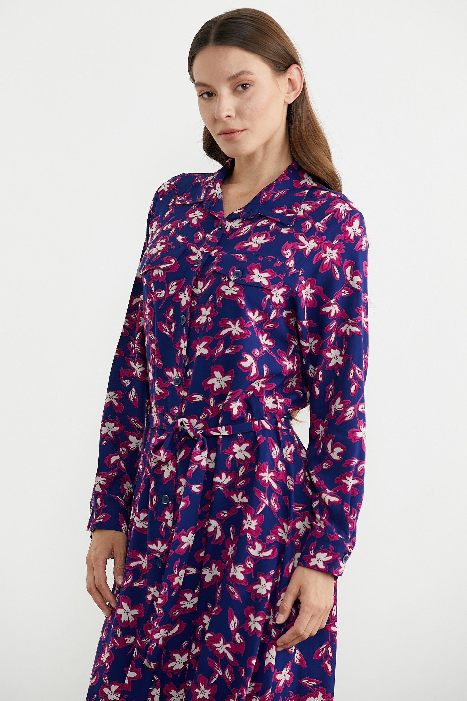 Uzun kol, kuşaklı, düğme kapamalı gömlek elbise. Süs ceplidir. Rahat kalıp, midi boy.