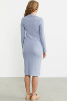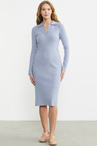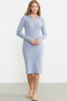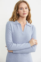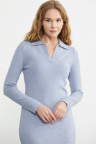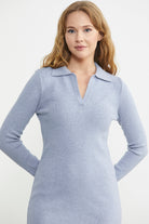 Polo Neck Basic Knitwear Dress with Placket - Blue
