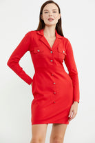 The jacket collar, metal button detailed knit dress attracts all the attention with its elegant details.