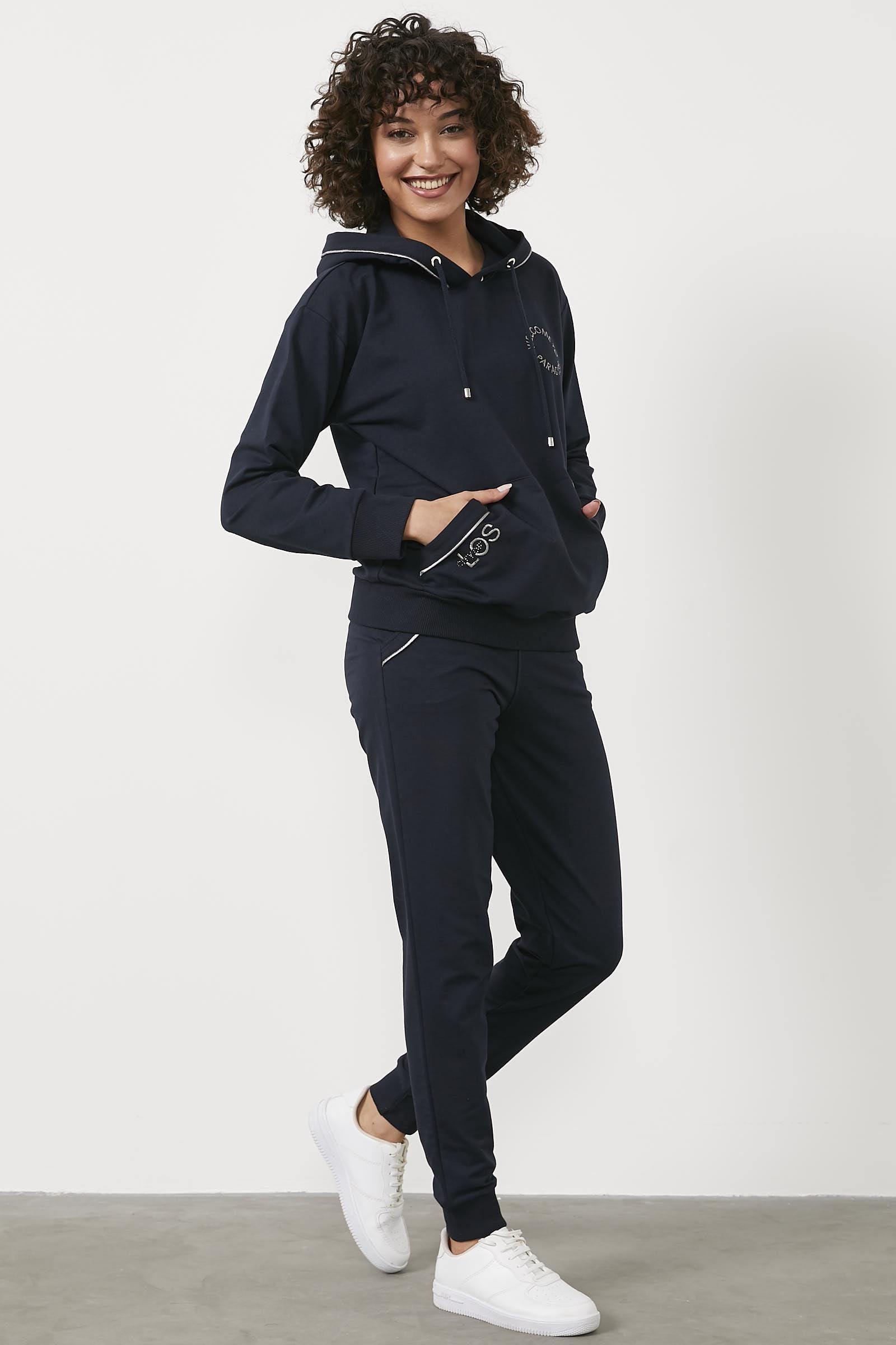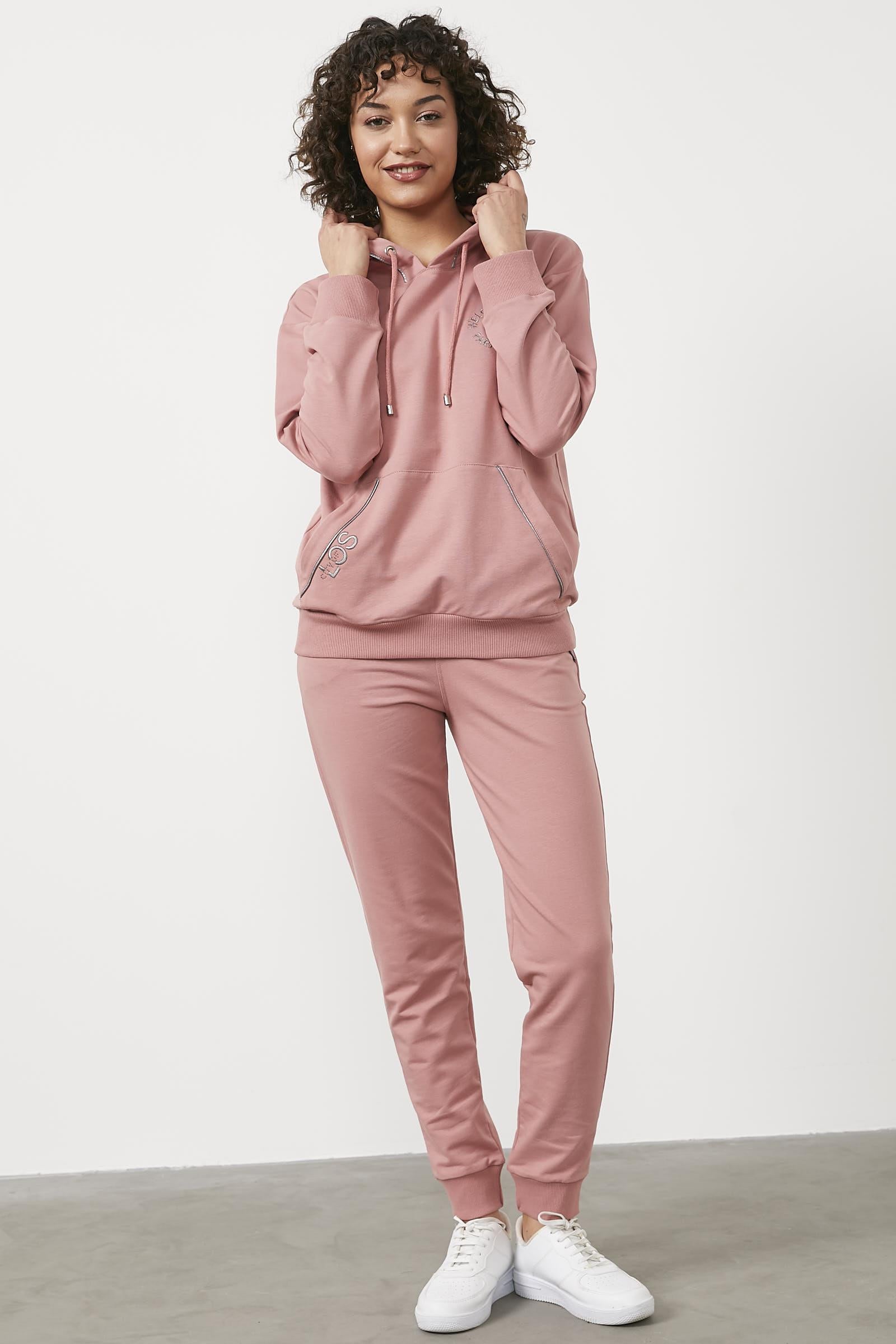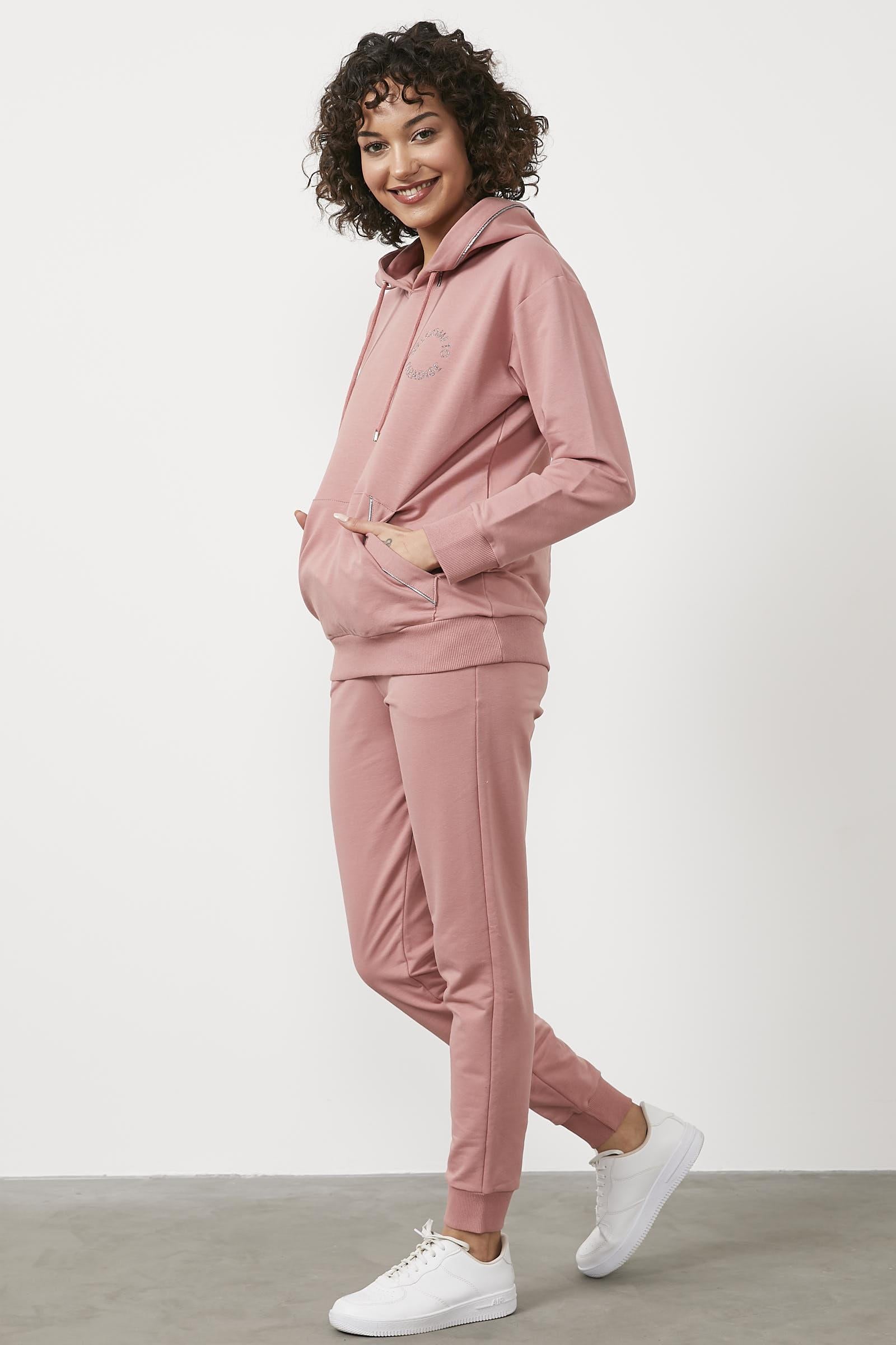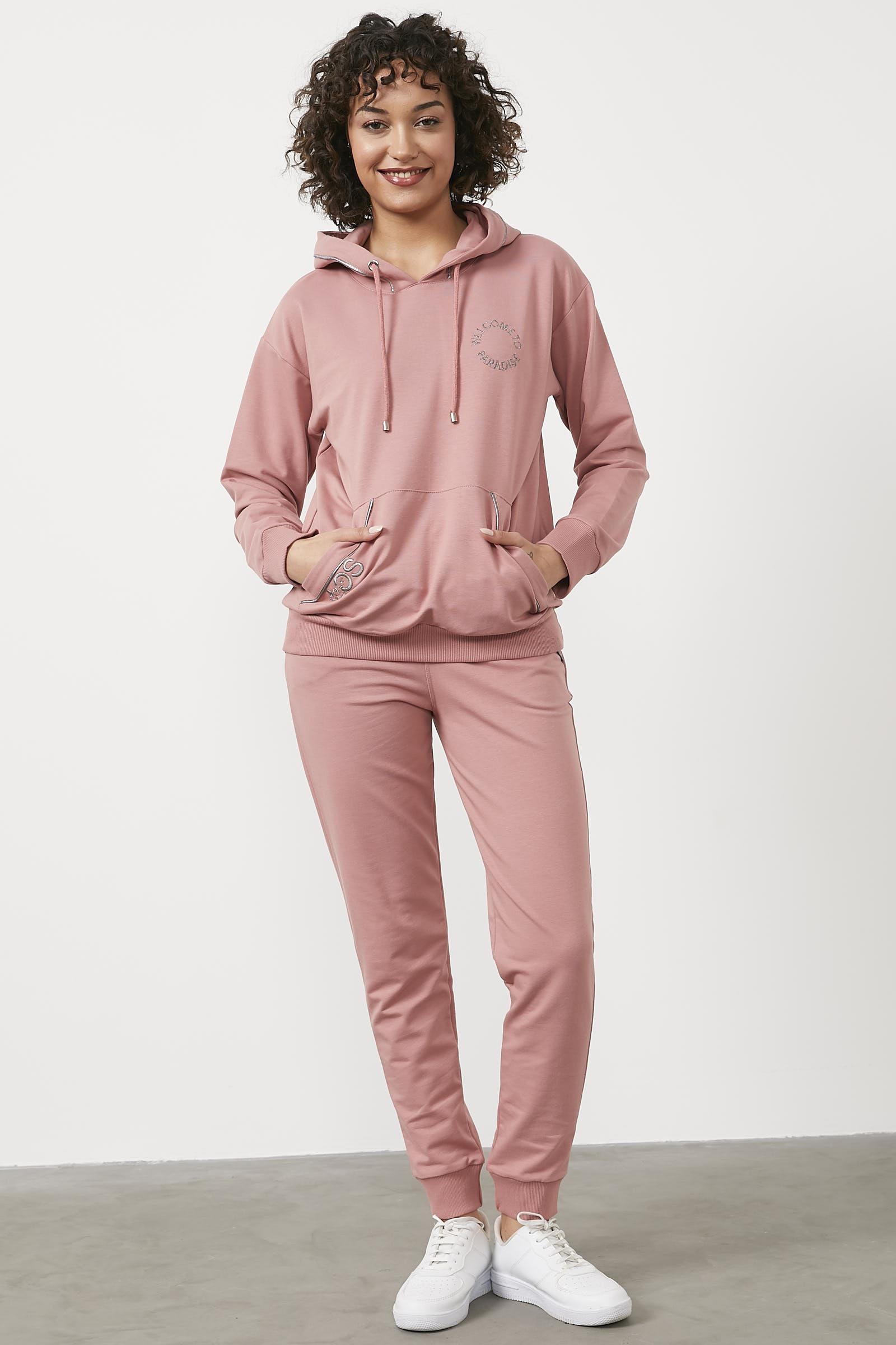 Standing out with its hooded form, the sweatshirt helps you stand out by offering an eye-catching style with its kangaroo pocket detail. Elastic drawstring trousers keep you warm and comfortable with its soft structure.