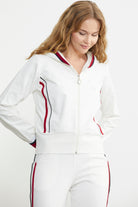 The hooded tracksuit with stripe colored piping detail is designed as a crop top and a jogger bottom. Ideal for sports and comfort.