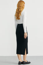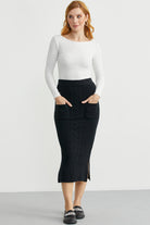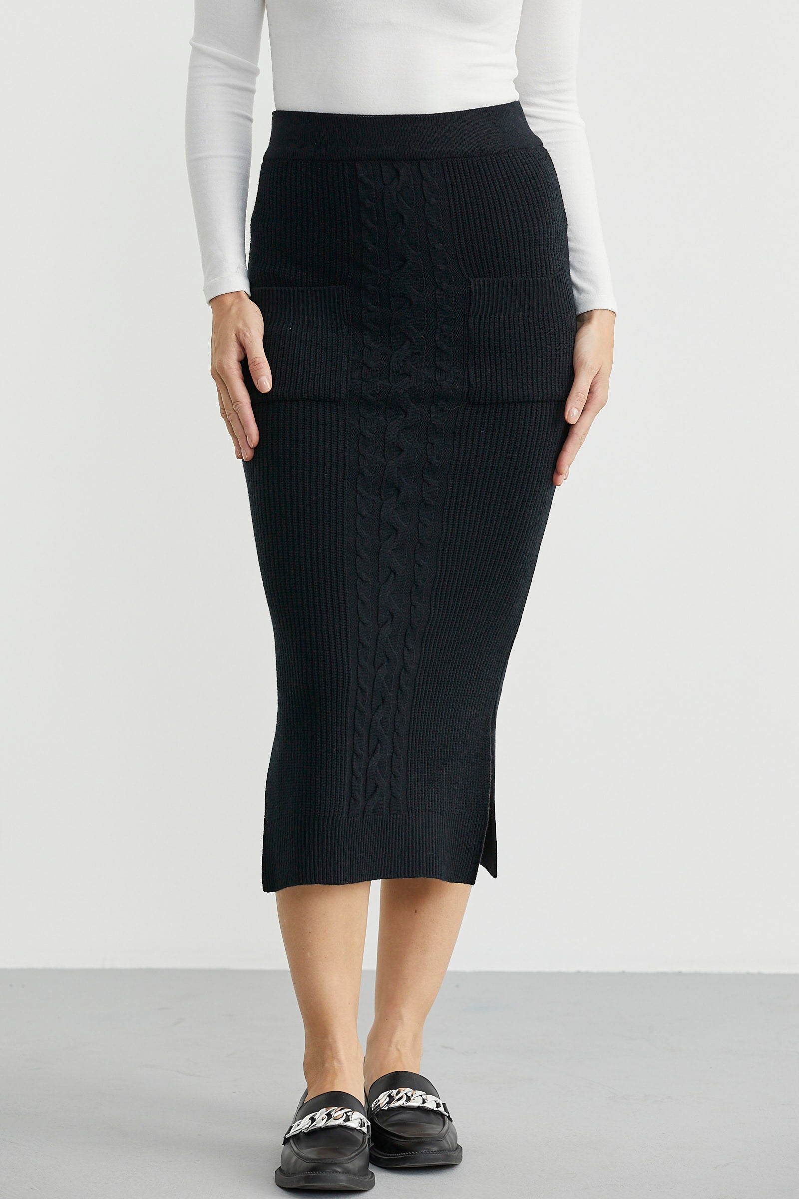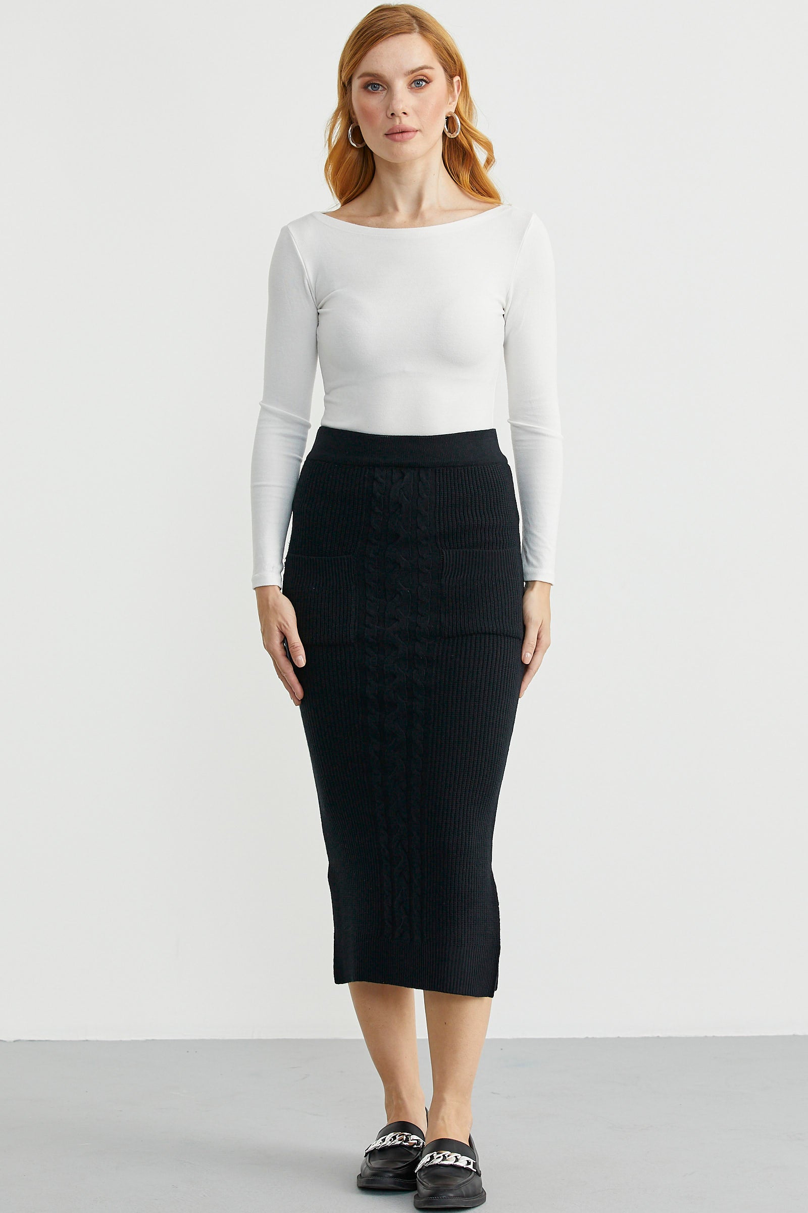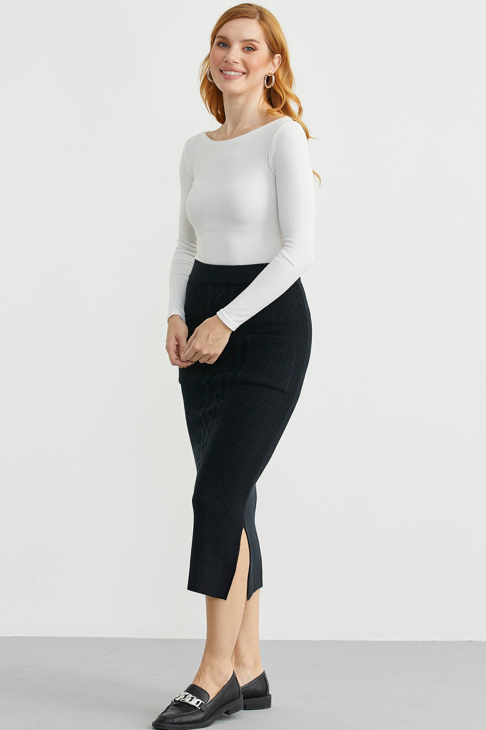 Kalın, beli gizli lastikli, yanı ufak yırtmaçlı triko kalem etek. Desenli ve cep detaylı.