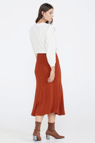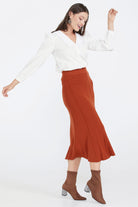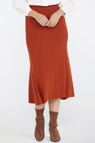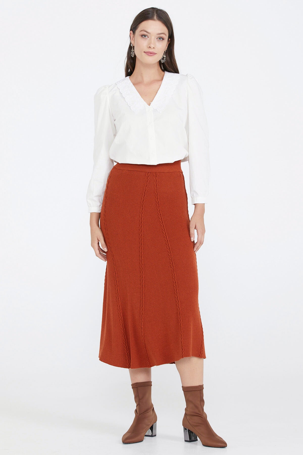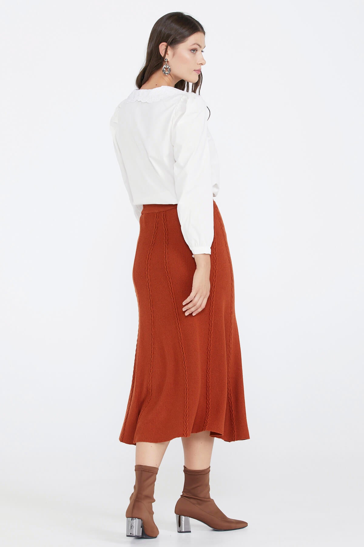 High waist, elastic waist, midi-length, bell-cut knit skirt made from viscose-blend yarn.