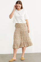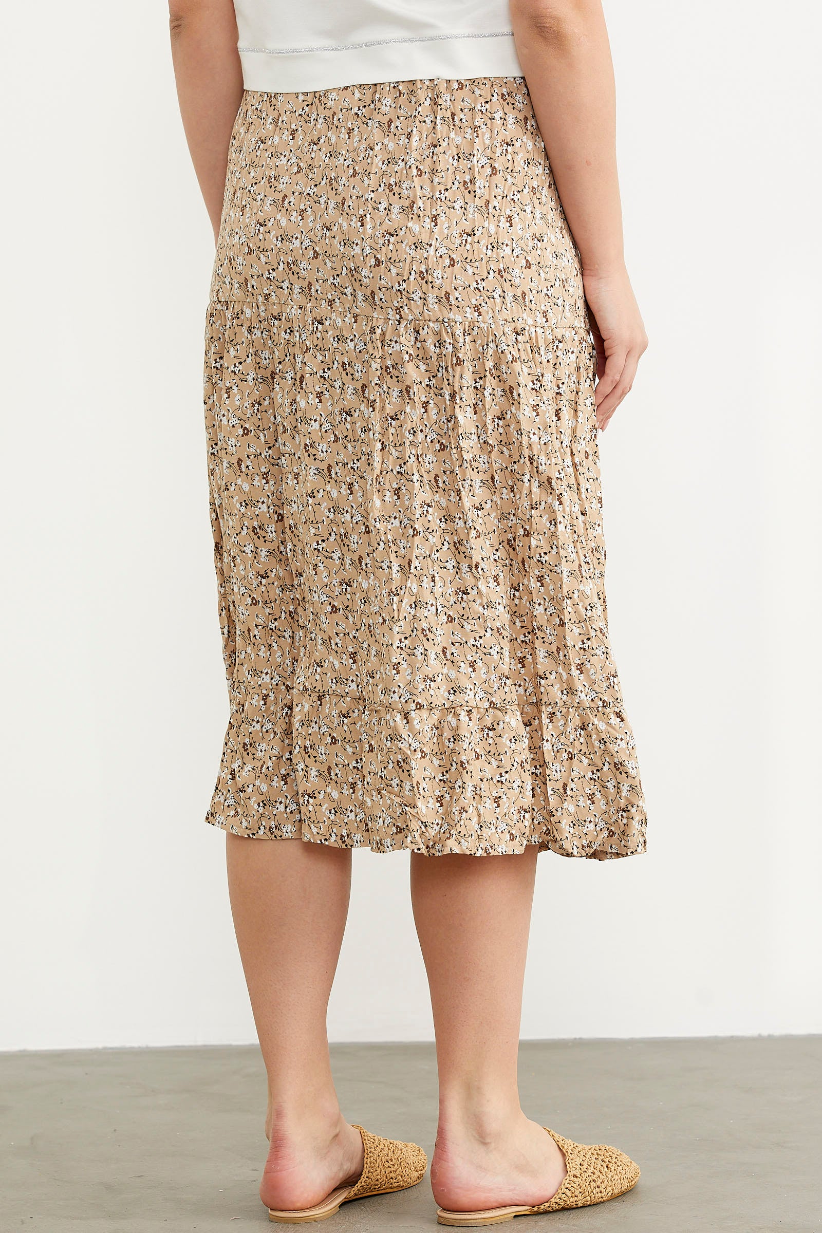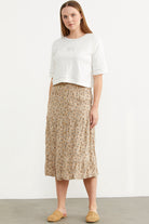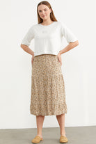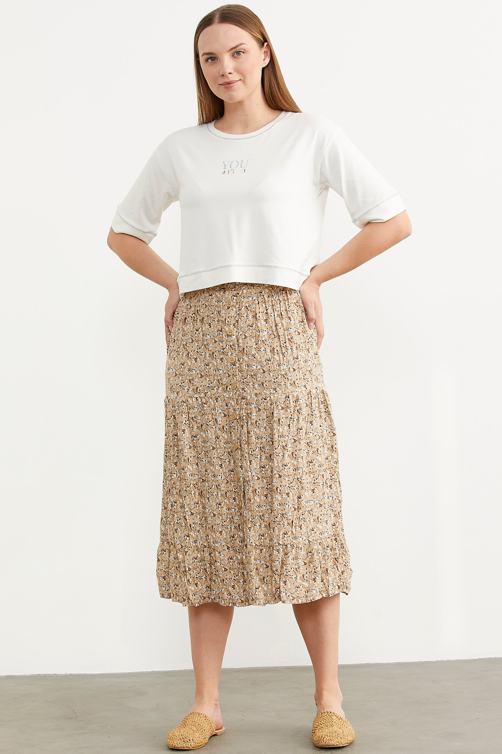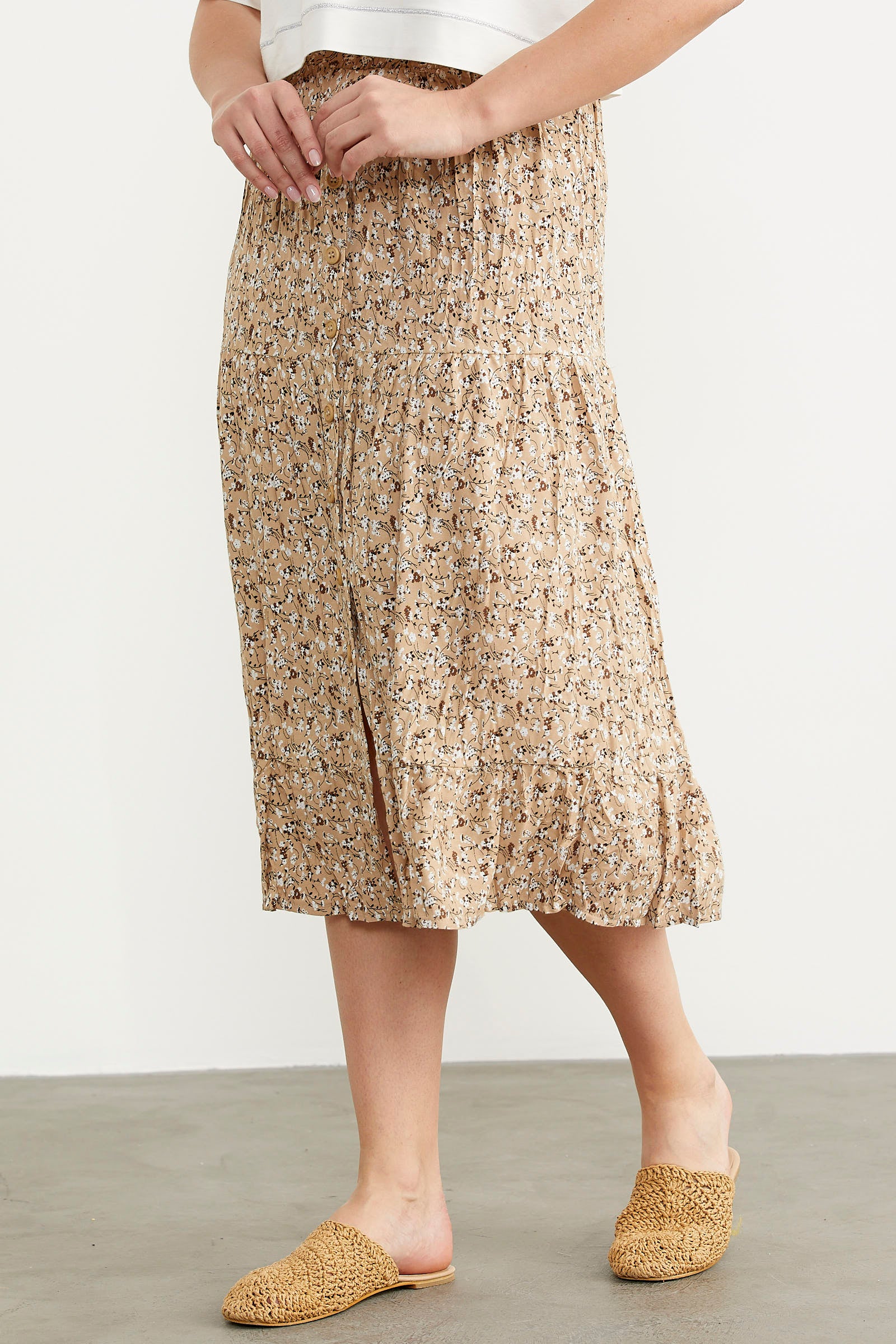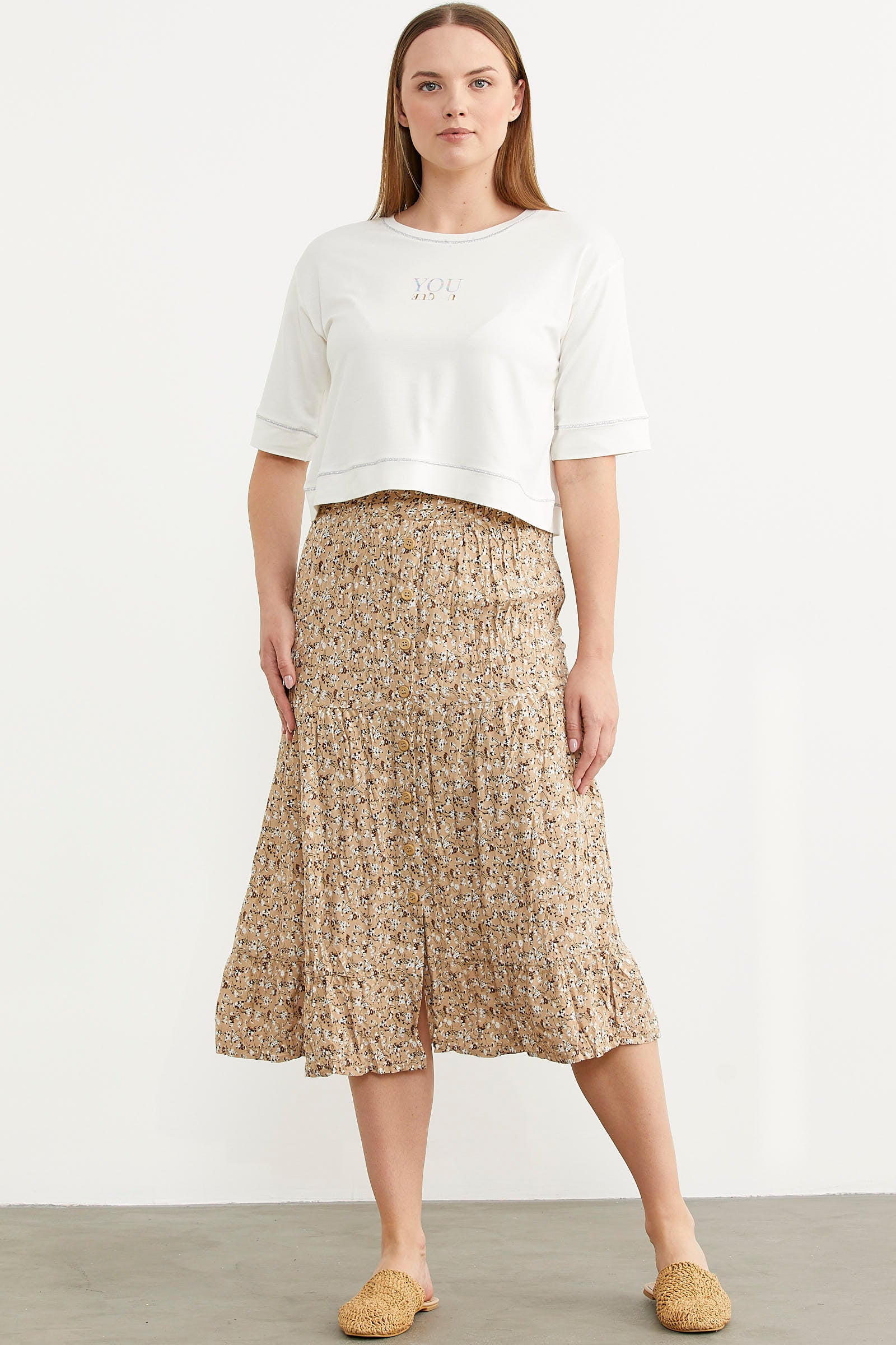 Midi length, lively patterned button-down skirts will be indispensable for the summer with their light fabric texture.