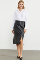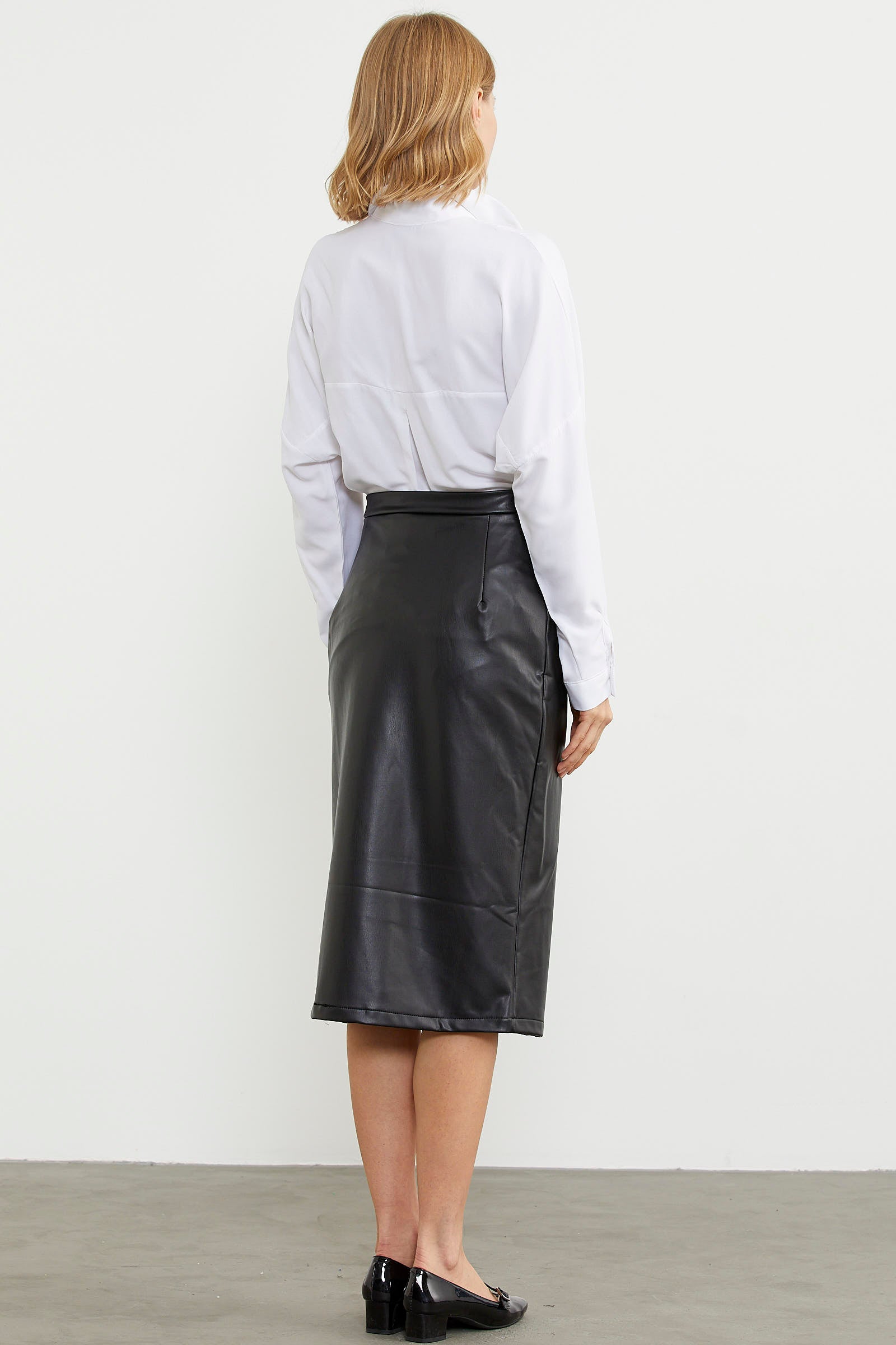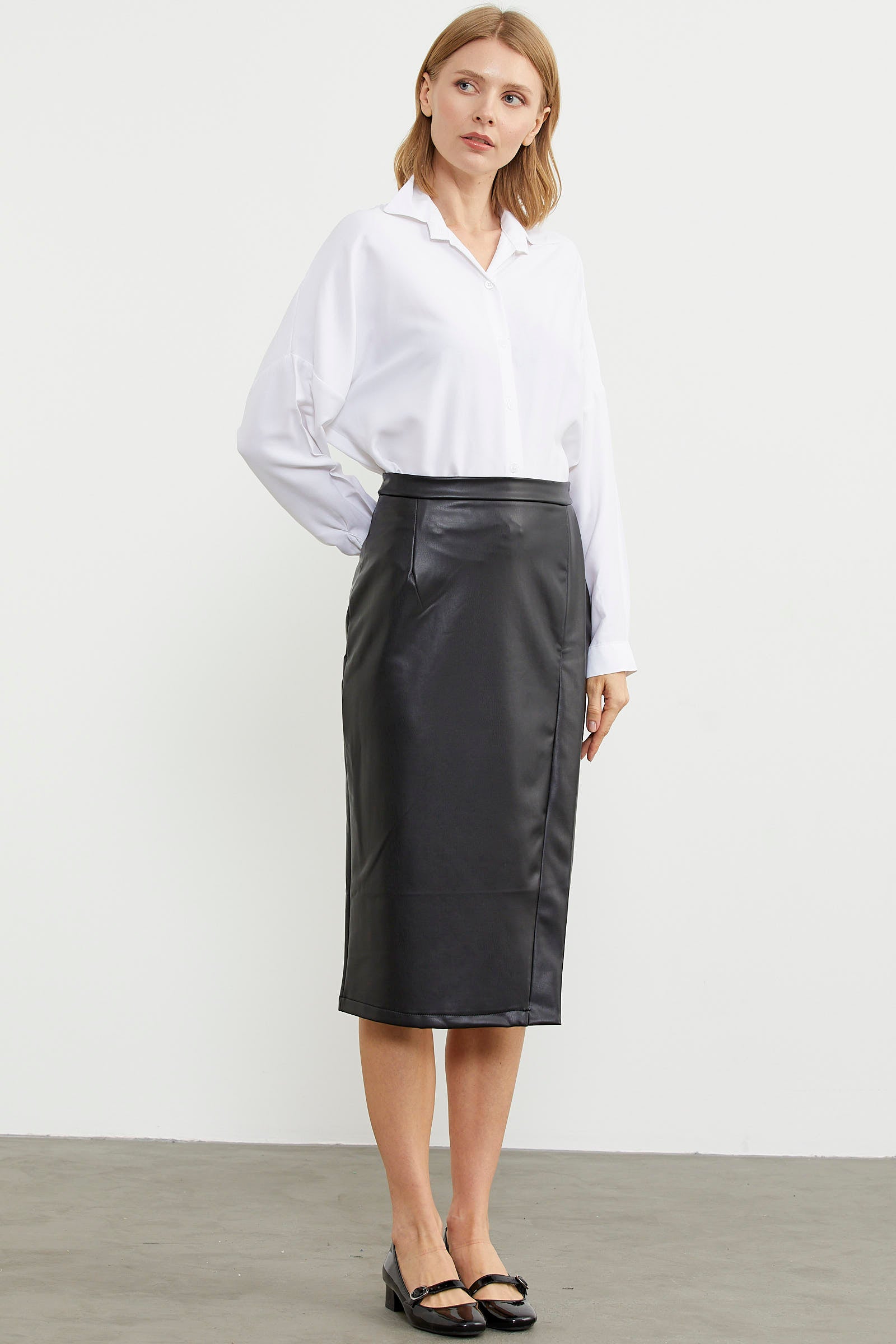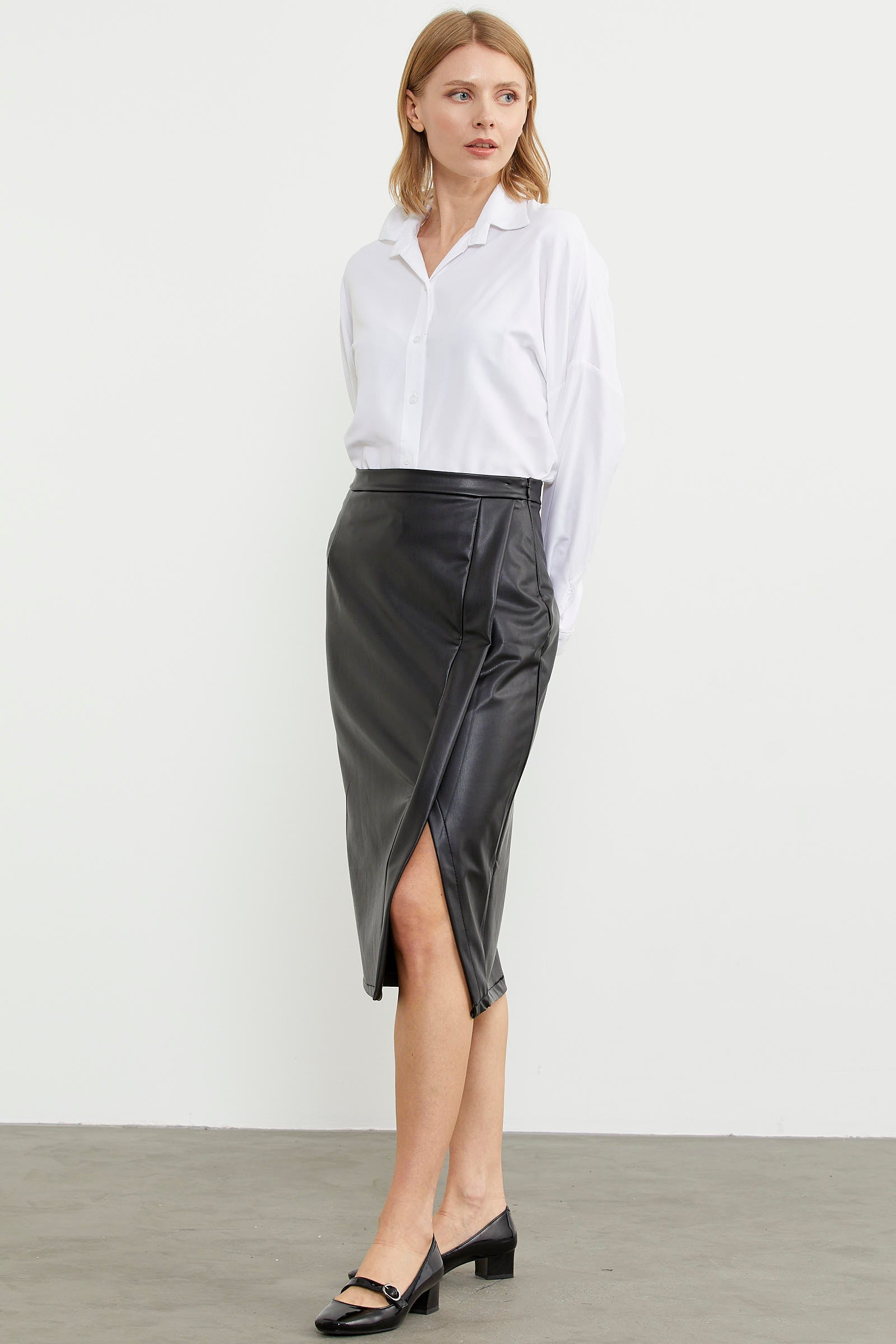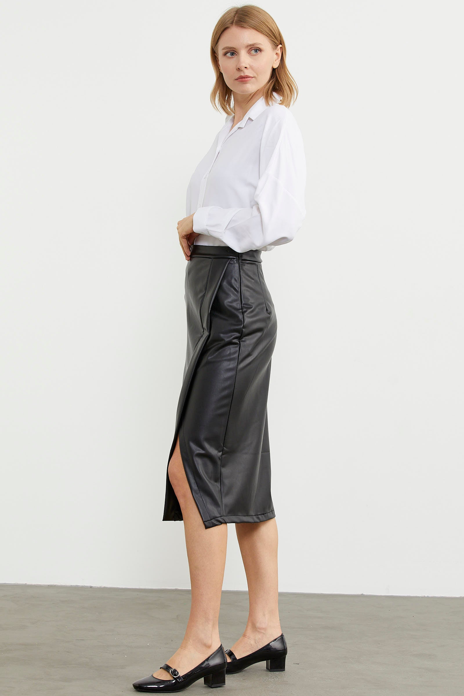 You can manage your day and night outfits at the same time with the knee-length faux leather skirt that will attract the eyes with its slit detail. You will have a stylish look with its pattern that fits your body perfectly.