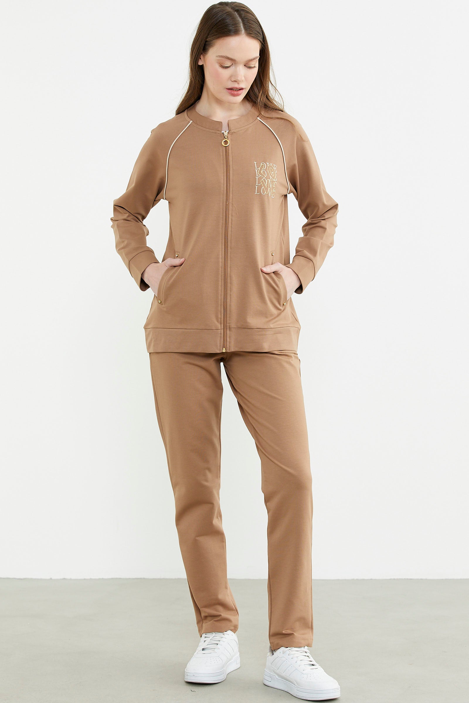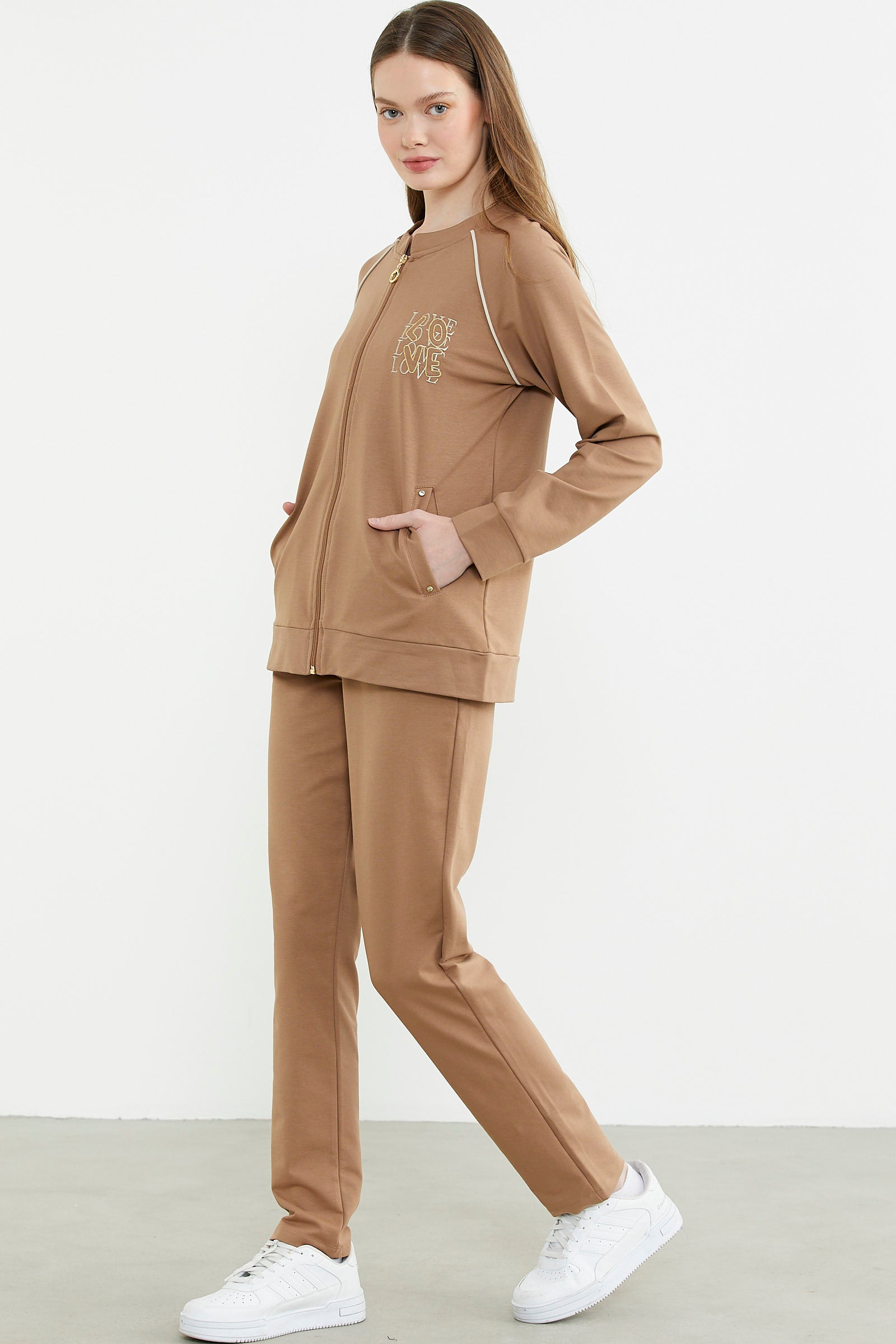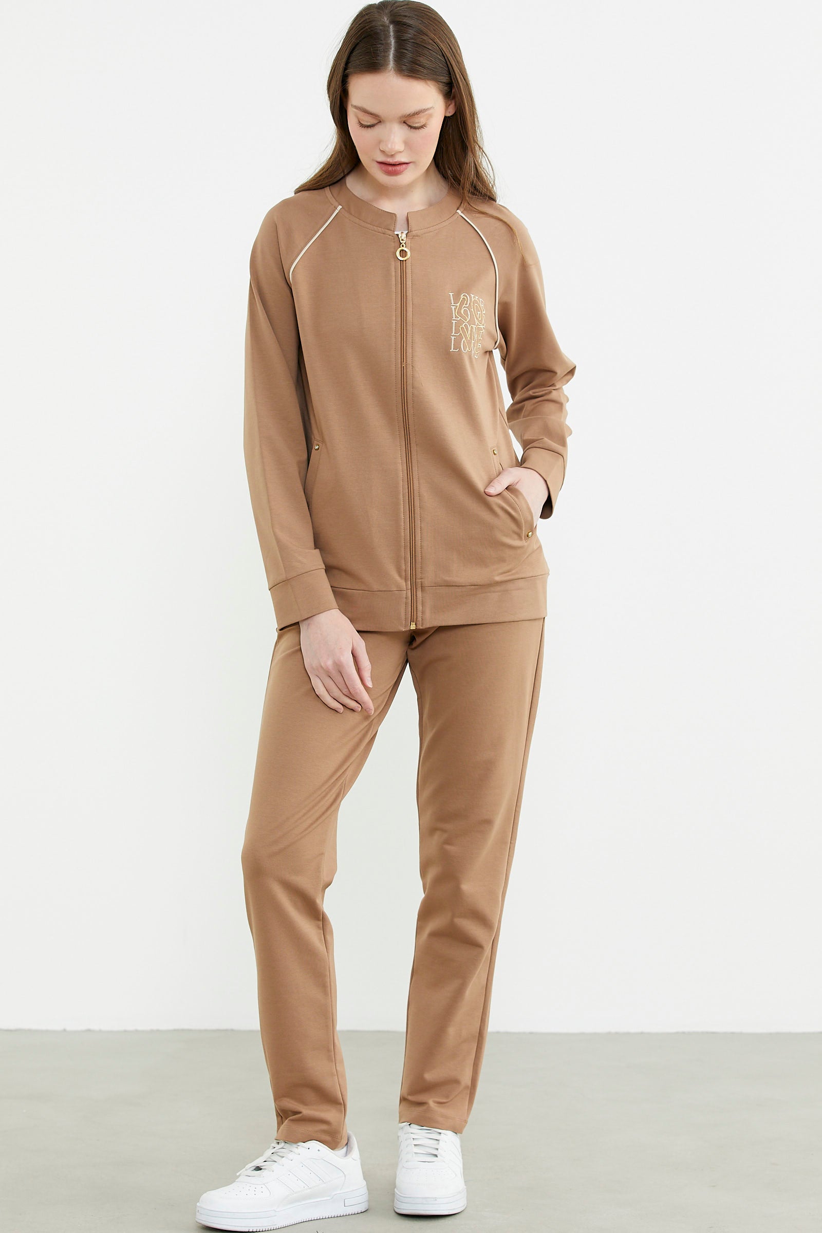 Biye Detaylı Fermuarlı Eşofman Takım - Kamel