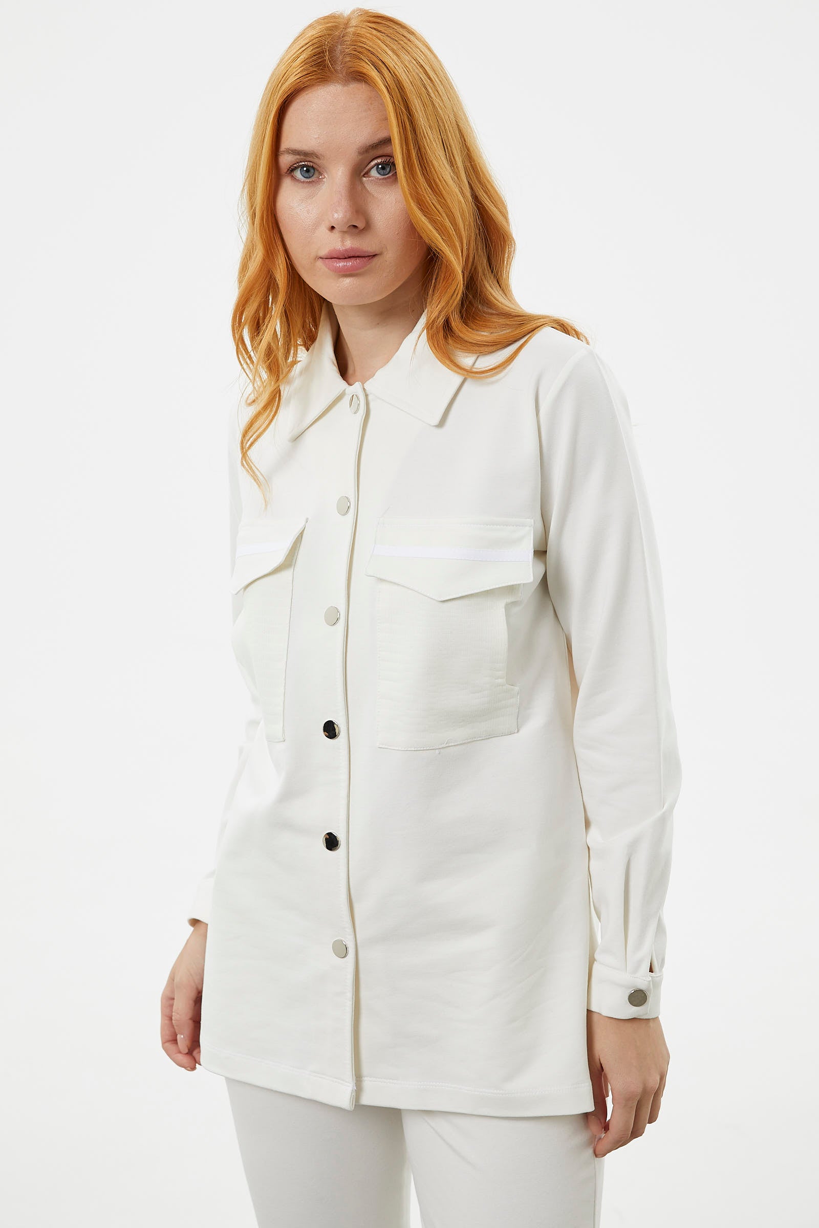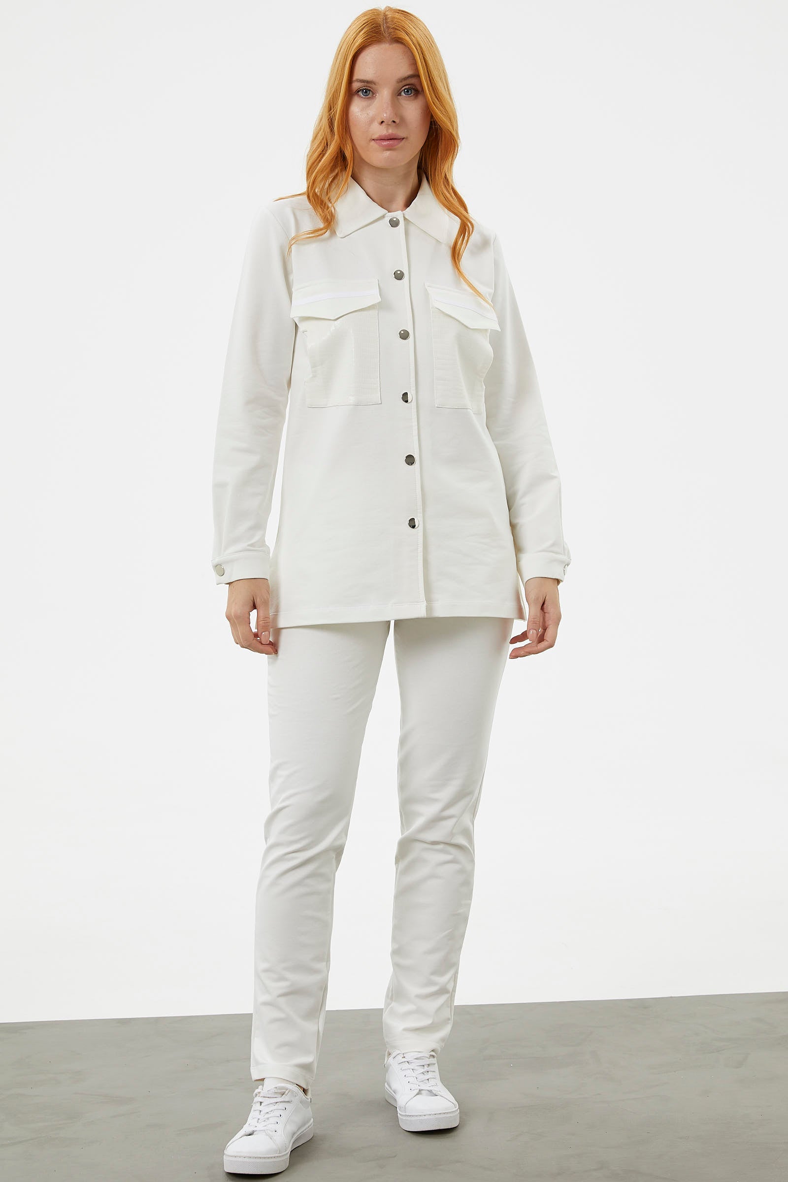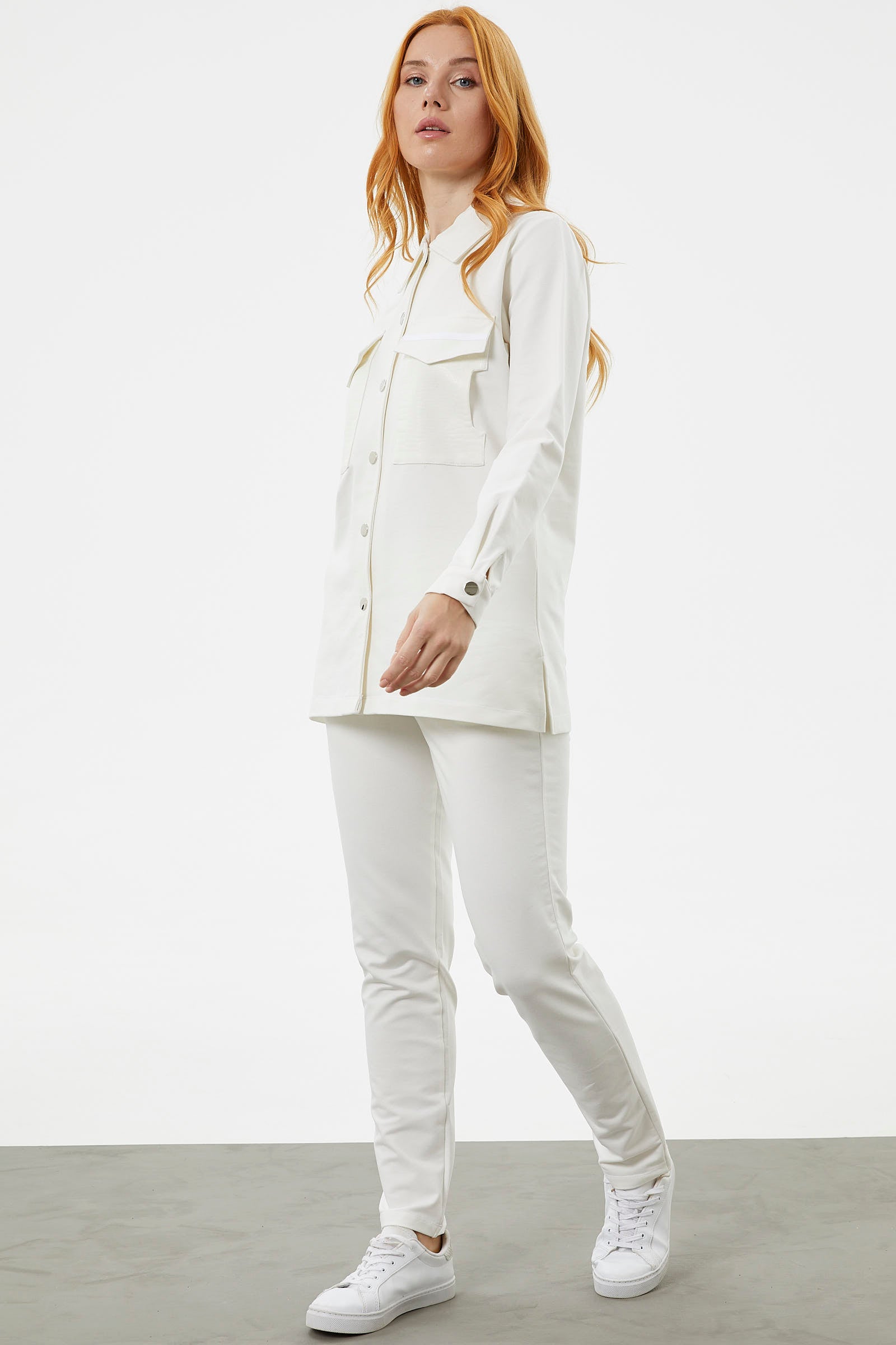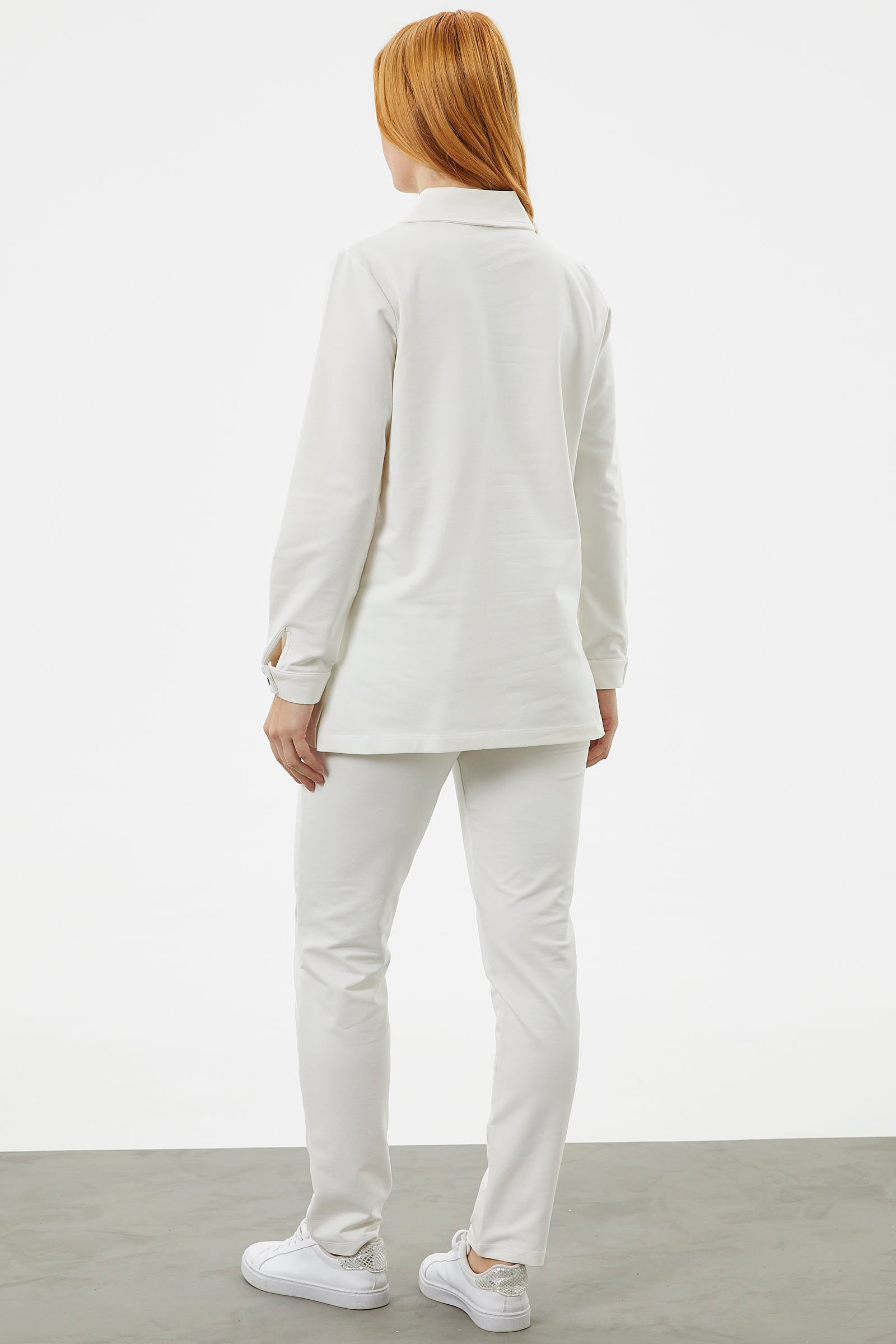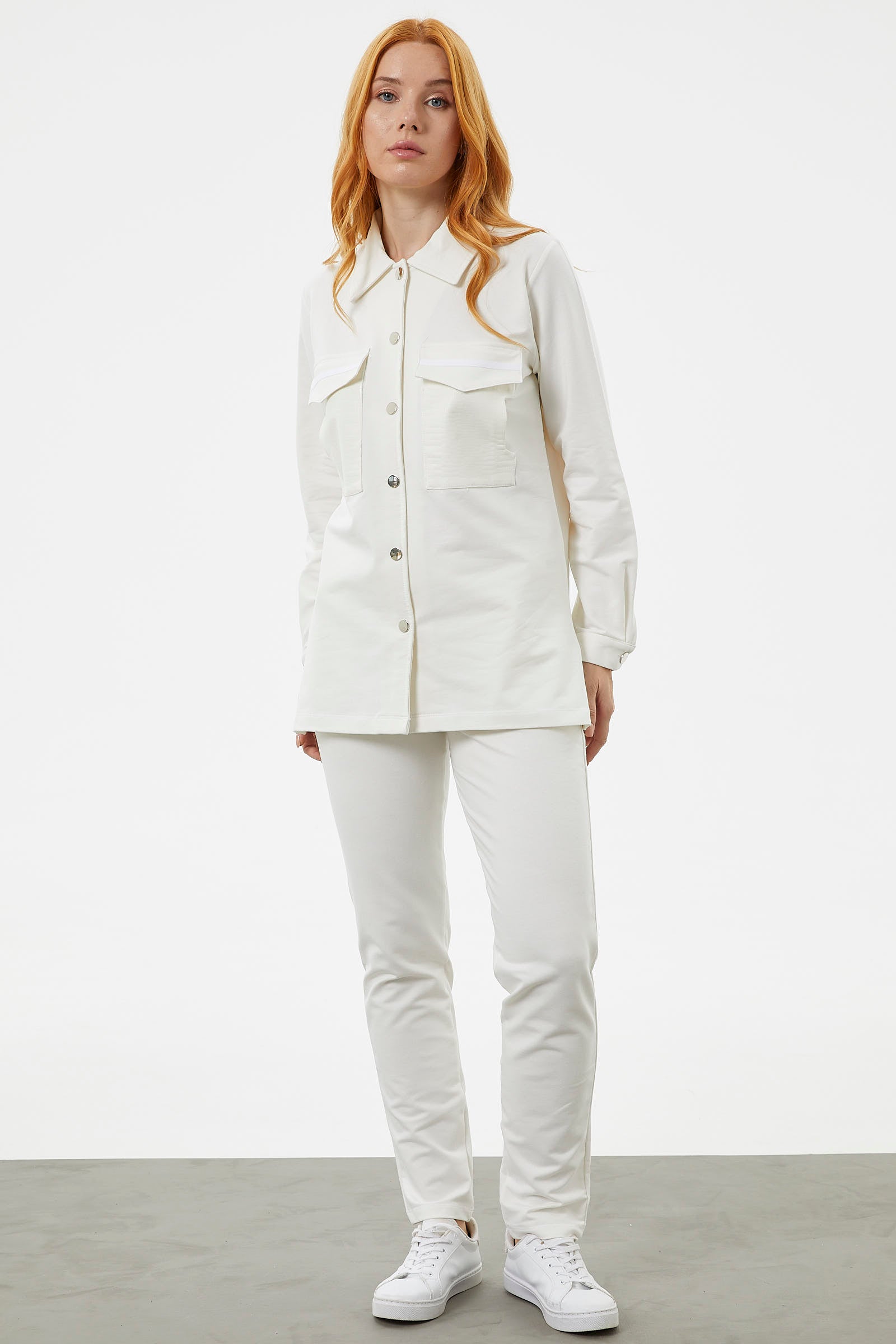 It's time to make a difference with this two-piece tracksuit made of viscose fabric, consisting of a tunic top with sleeve details, snap buttons down the length, and a slim-leg plain bottom with two faux leather front pockets.
