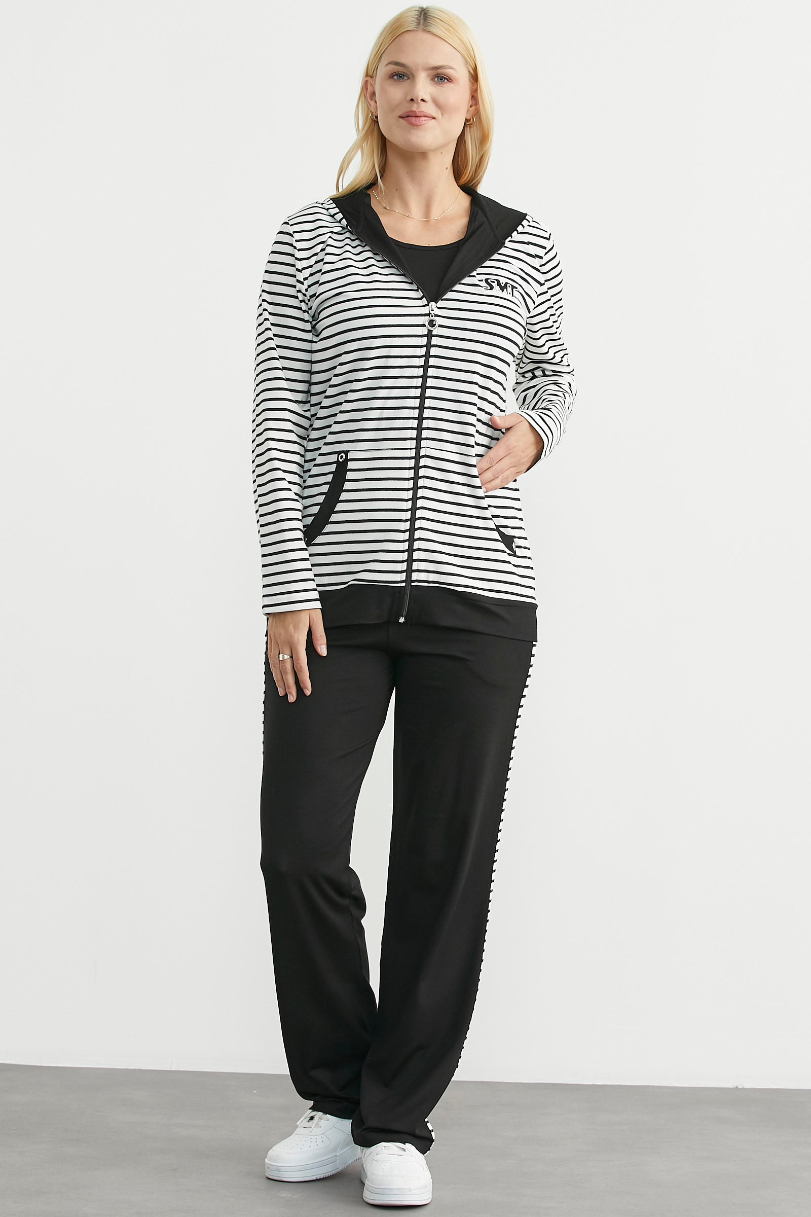 Çizgili marin fermuarlı üst, kombin detaylı yan biyeli alt ve askılı atletten oluşan üçlü takım.