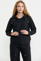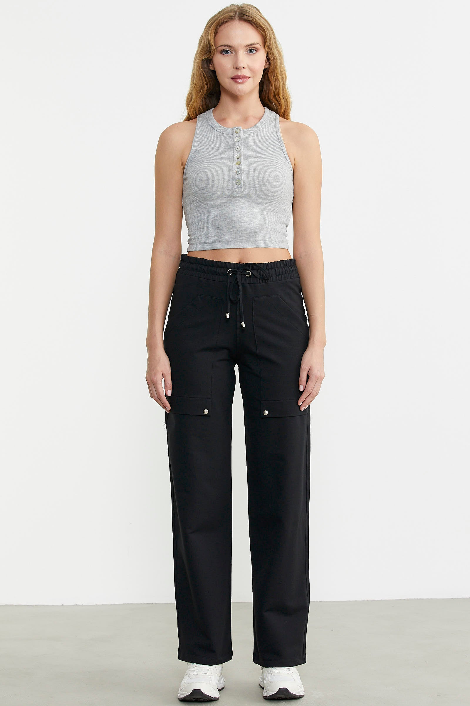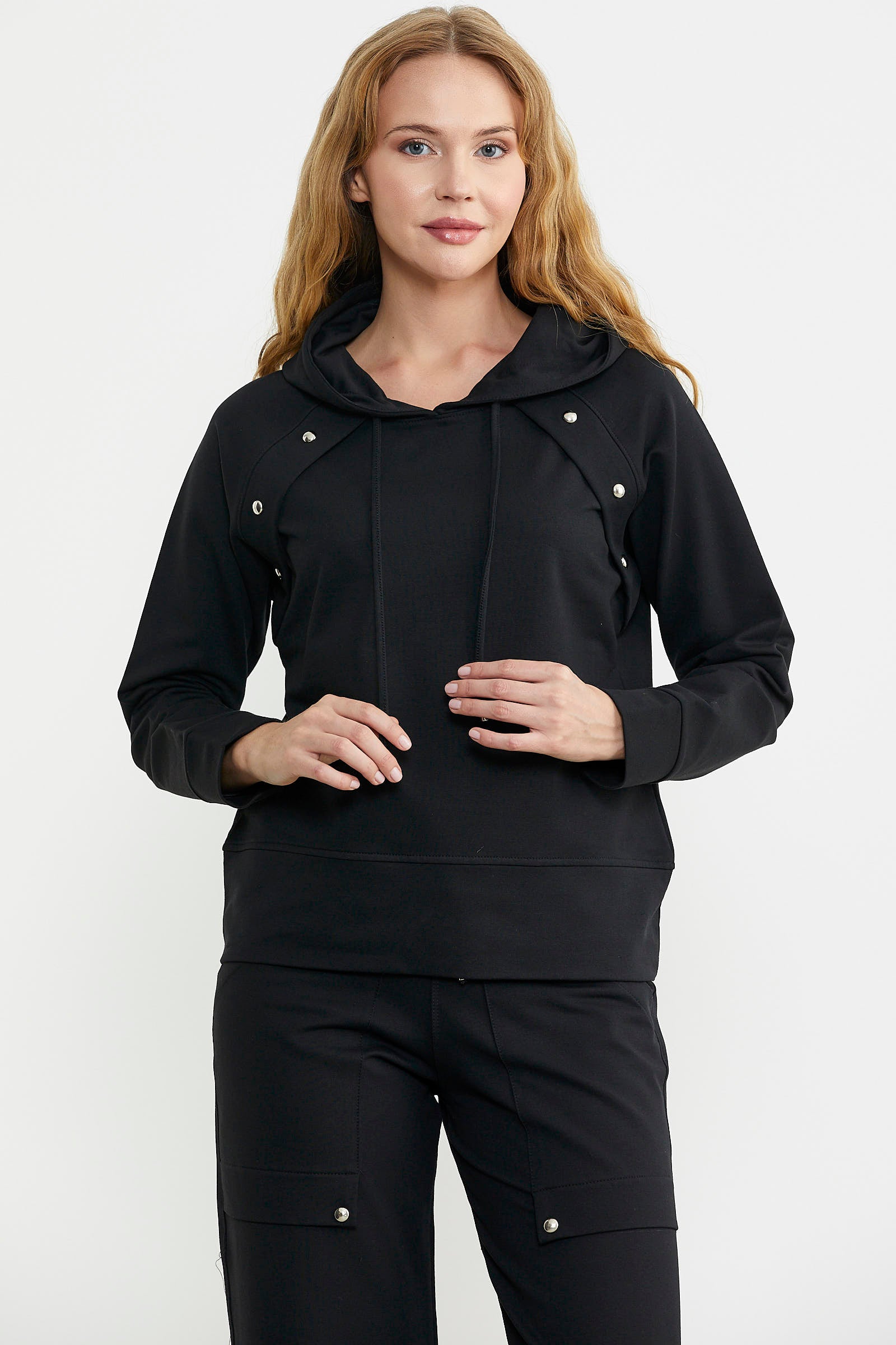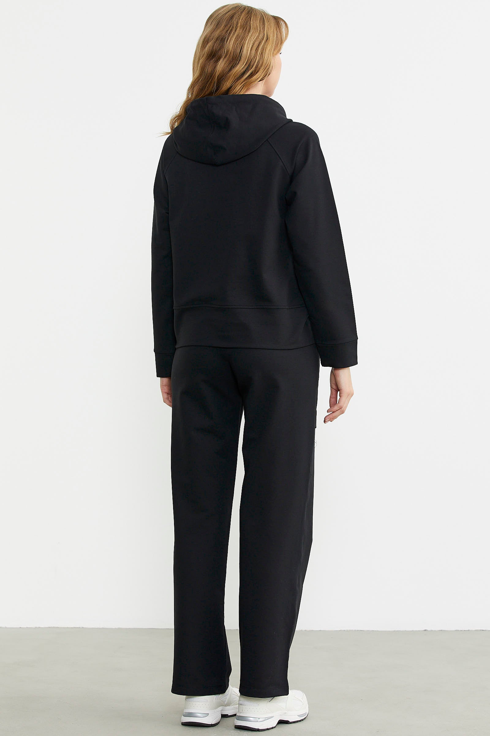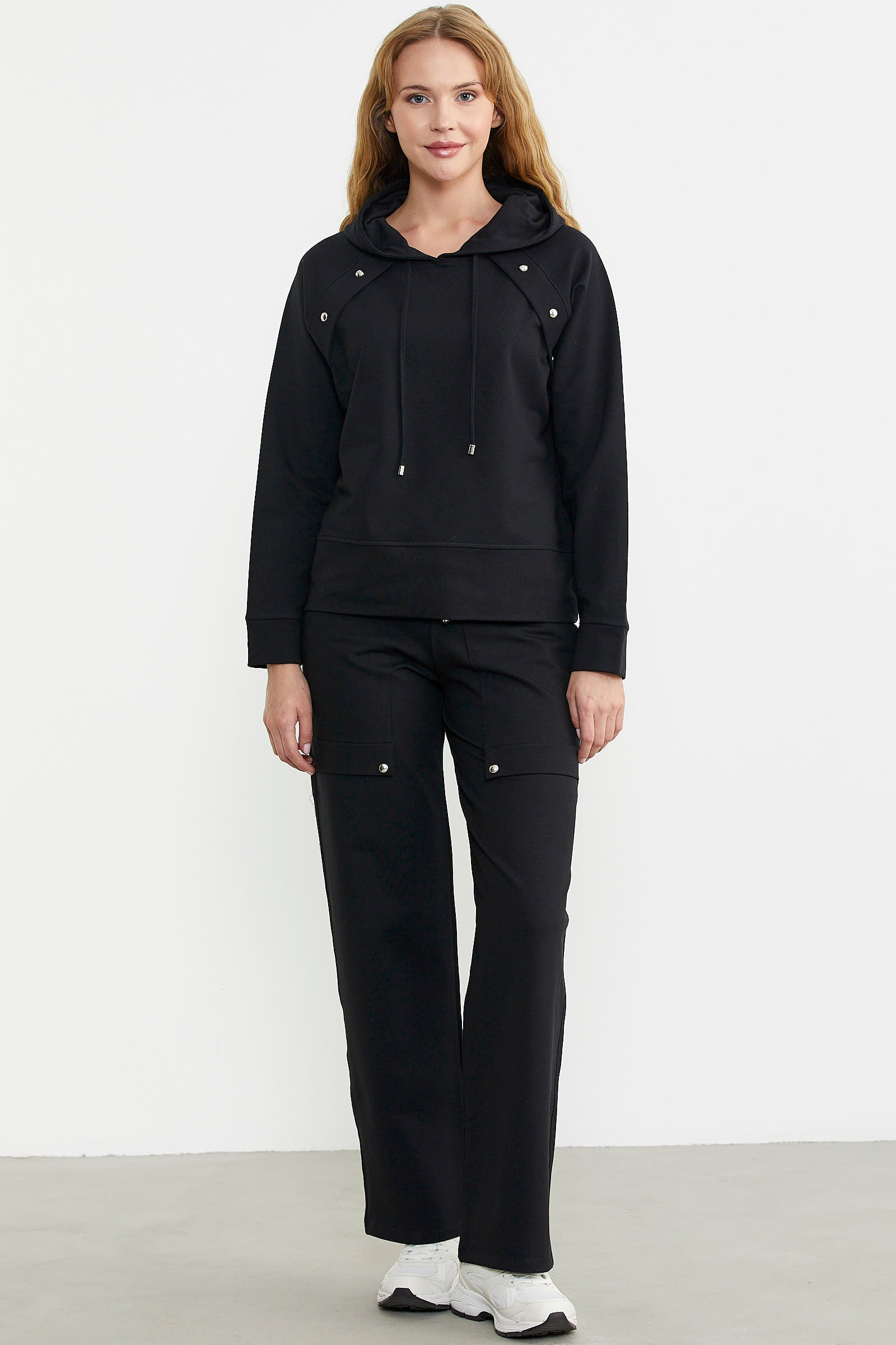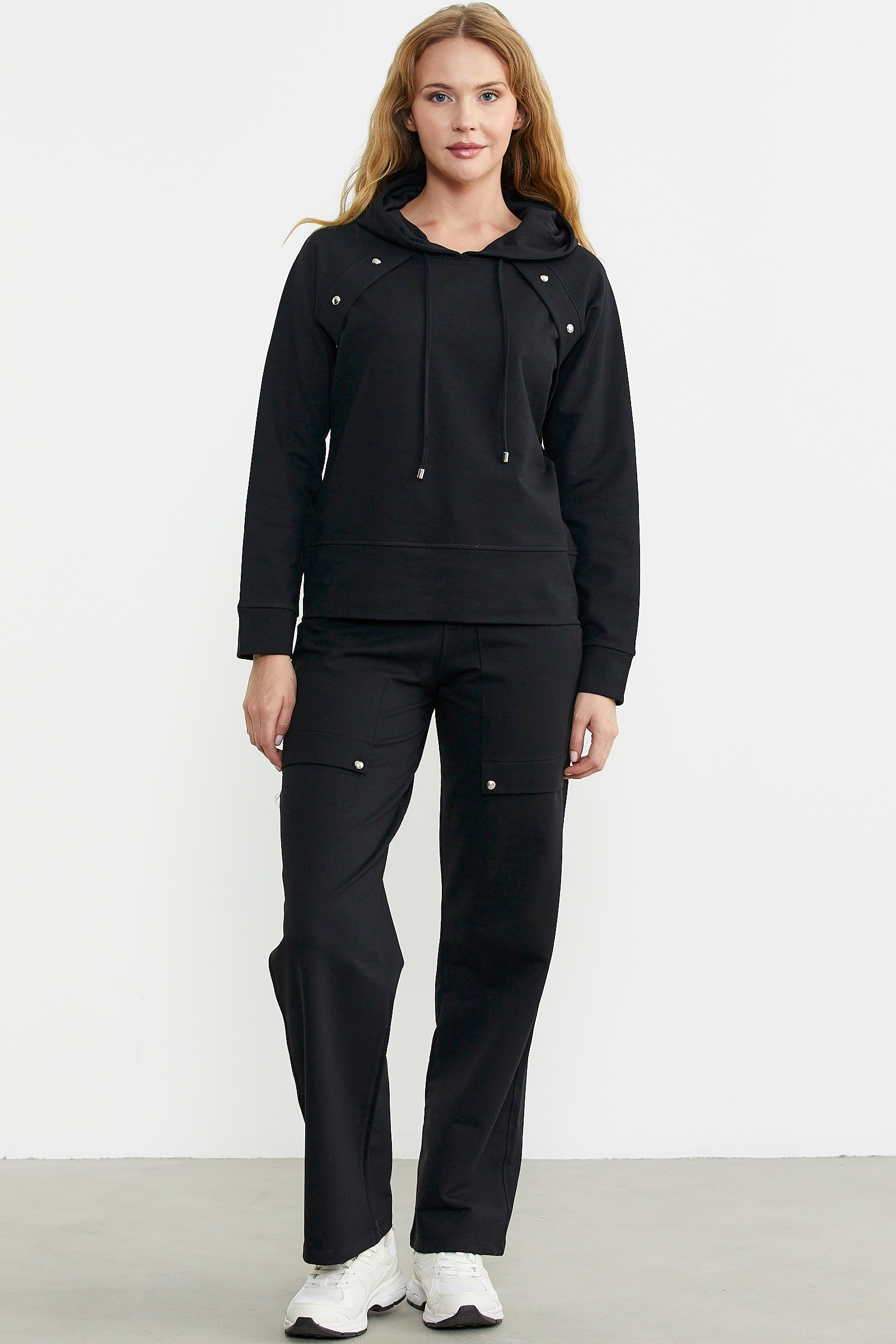 Two-piece tracksuit set consisting of high-waist, wide-leg sweatpants and a hooded, studded top.