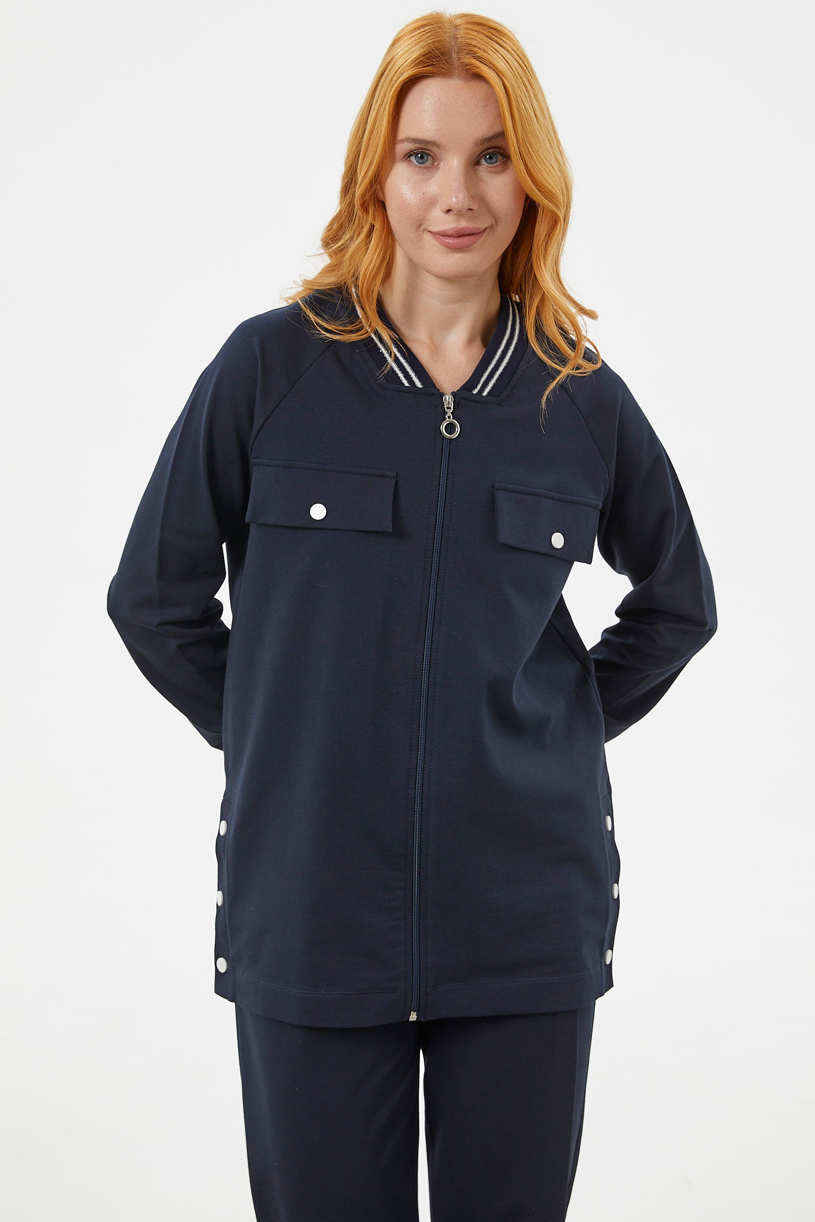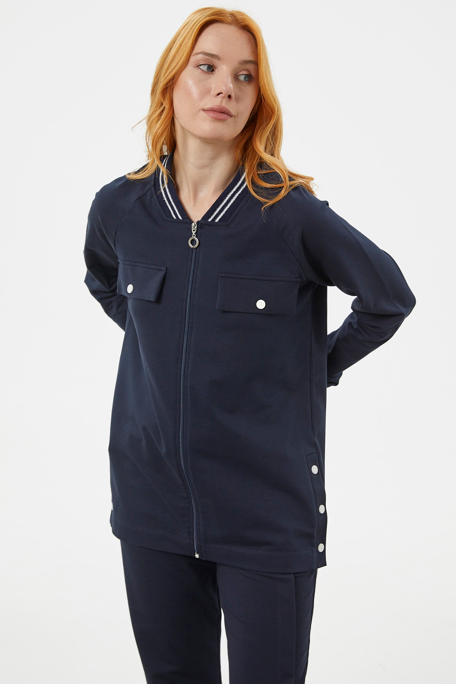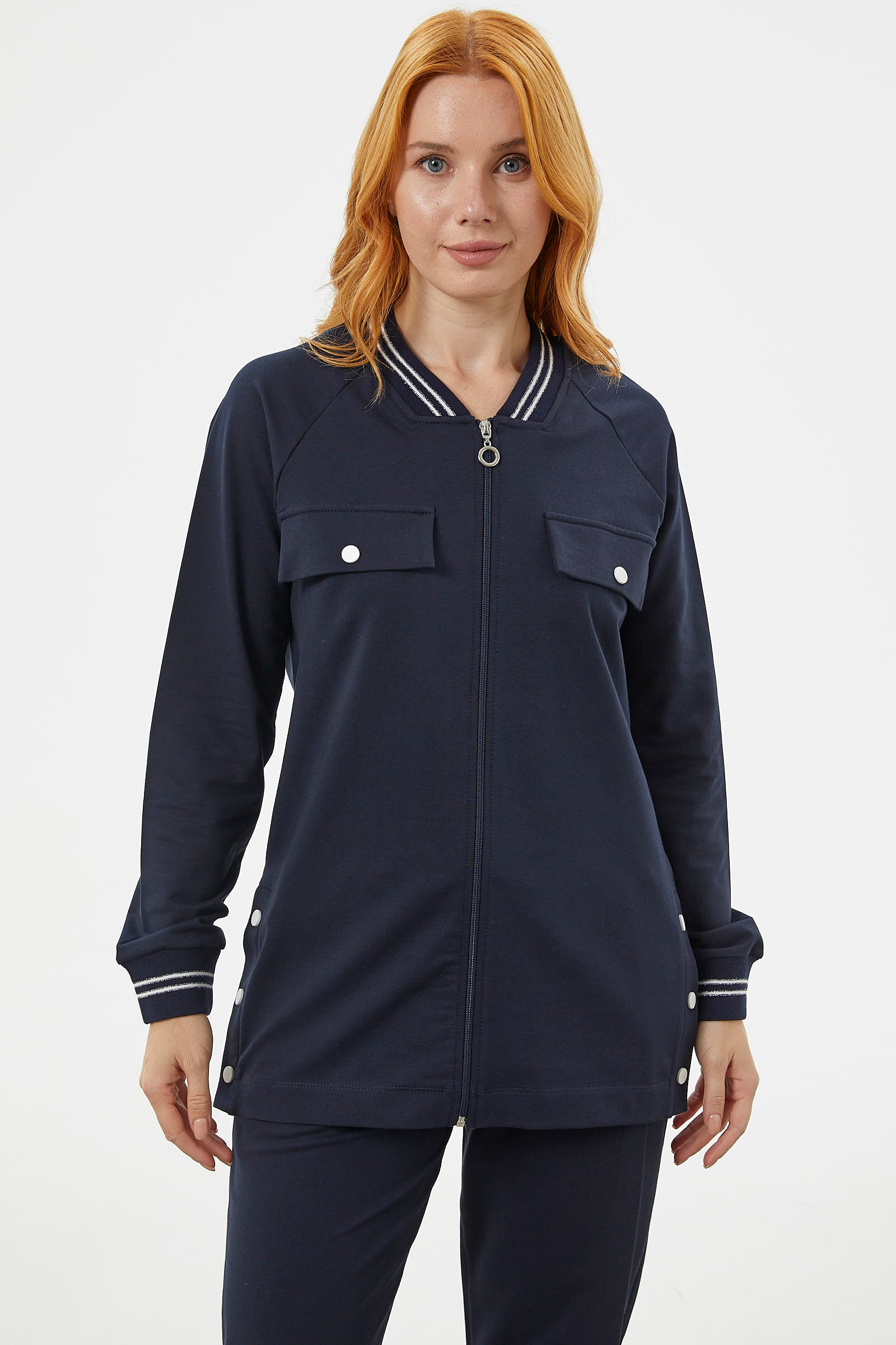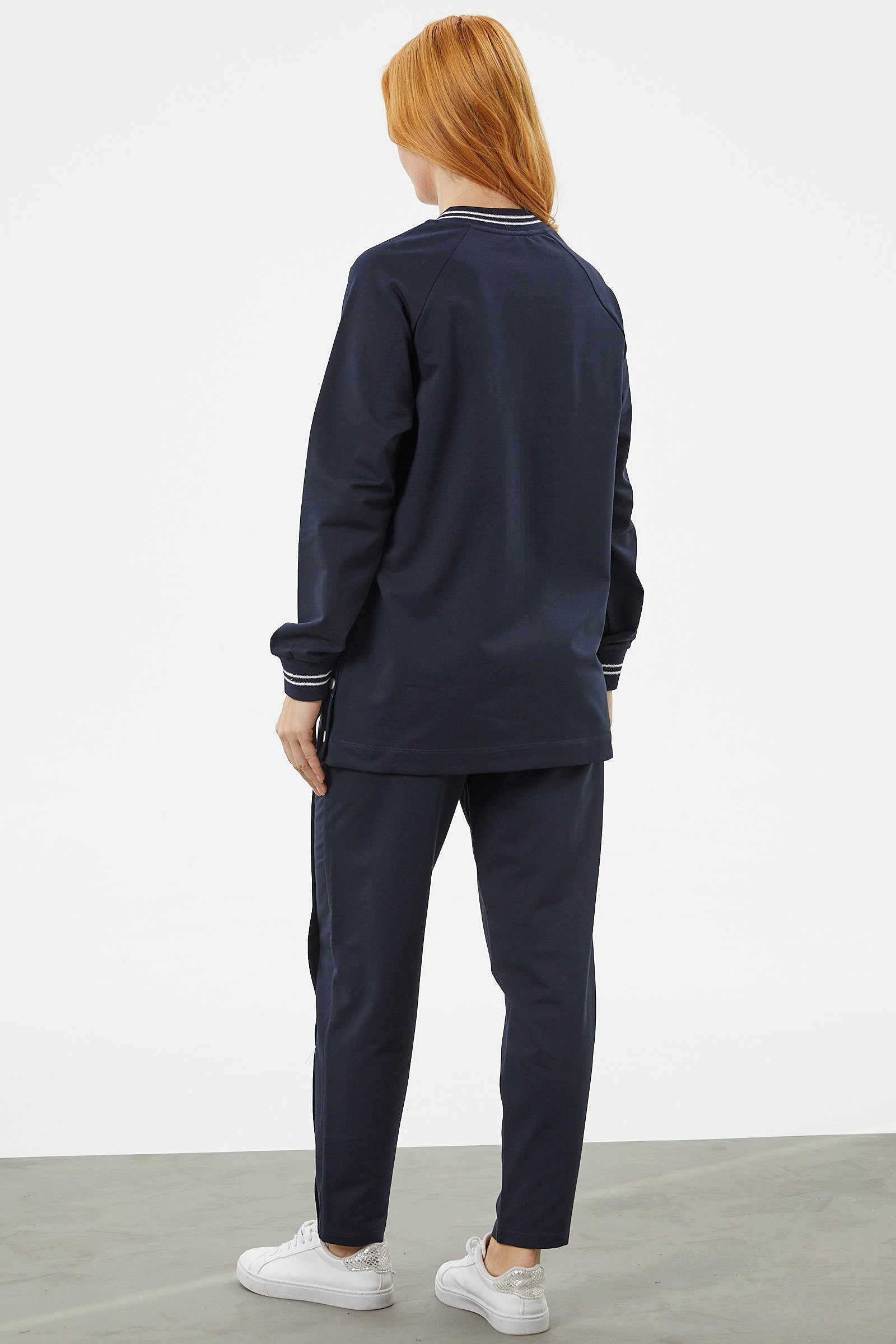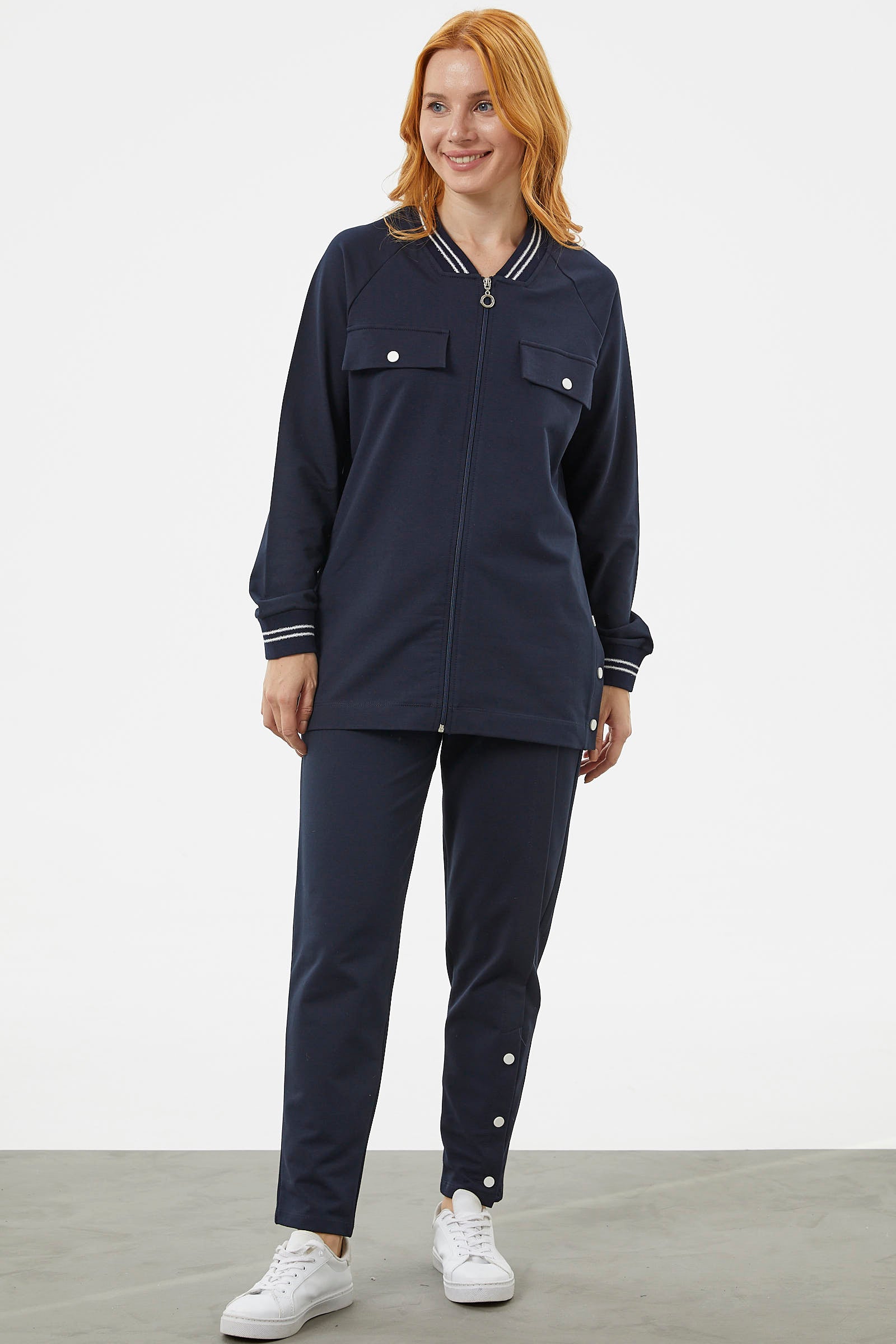 Knitted Collar Zippered Tunic Tracksuit Set - Navy Blue