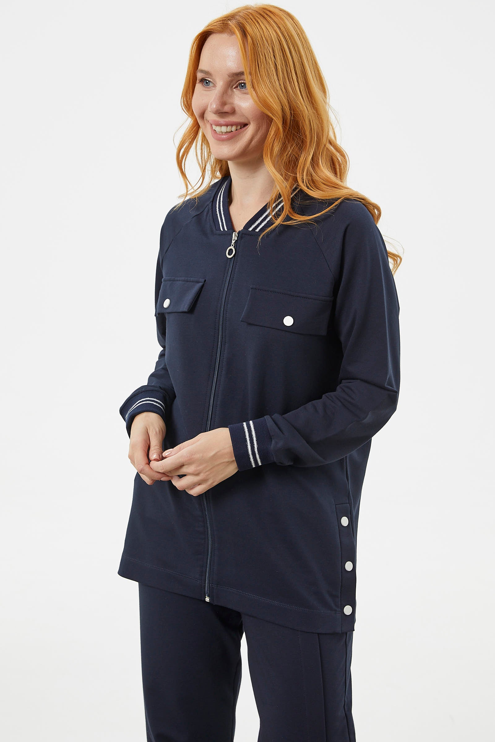 Designed with knitted glitter details on the collar and sleeves, zippered pockets throughout, and buttoned hems, this two-piece tracksuit set consisting of a tunic and bottoms brings comfort to your home with its soft texture.