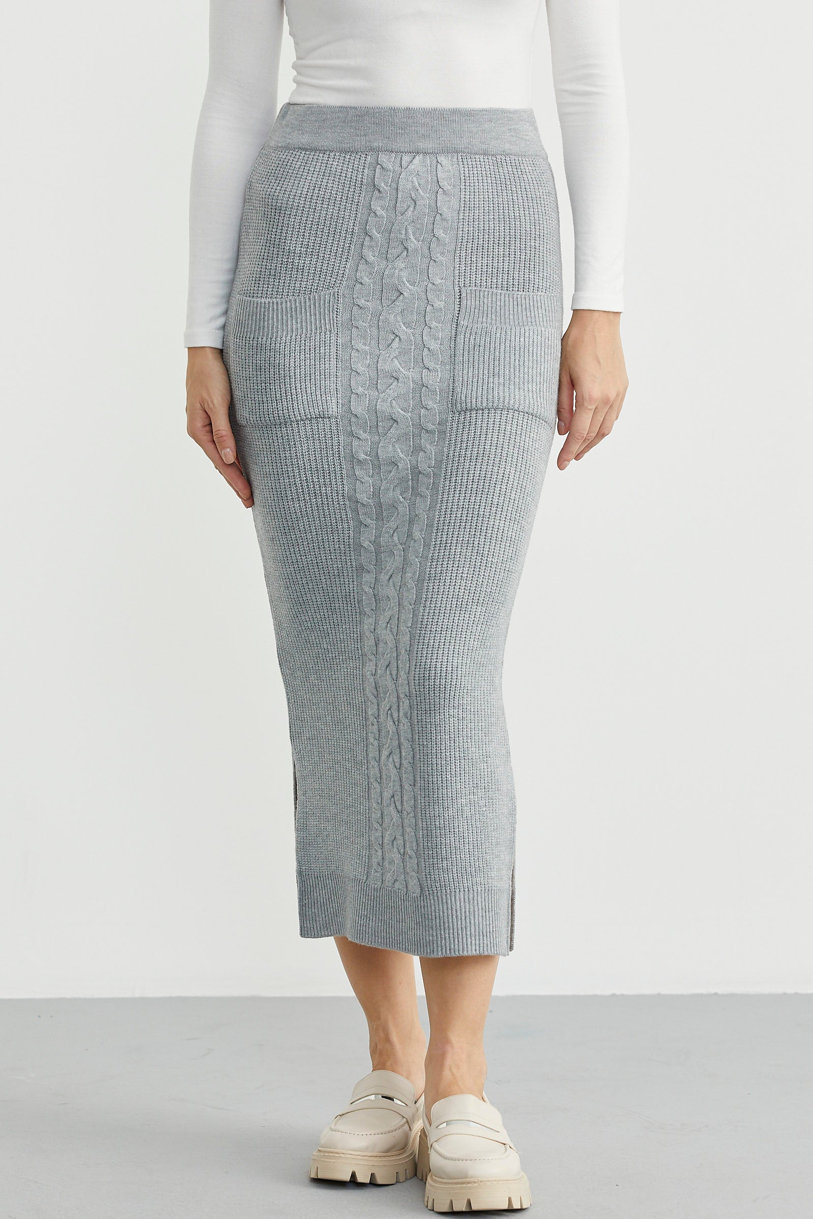 Thick, knitted pencil skirt with a hidden elastic waistband and small side slits. Patterned and with pocket details.