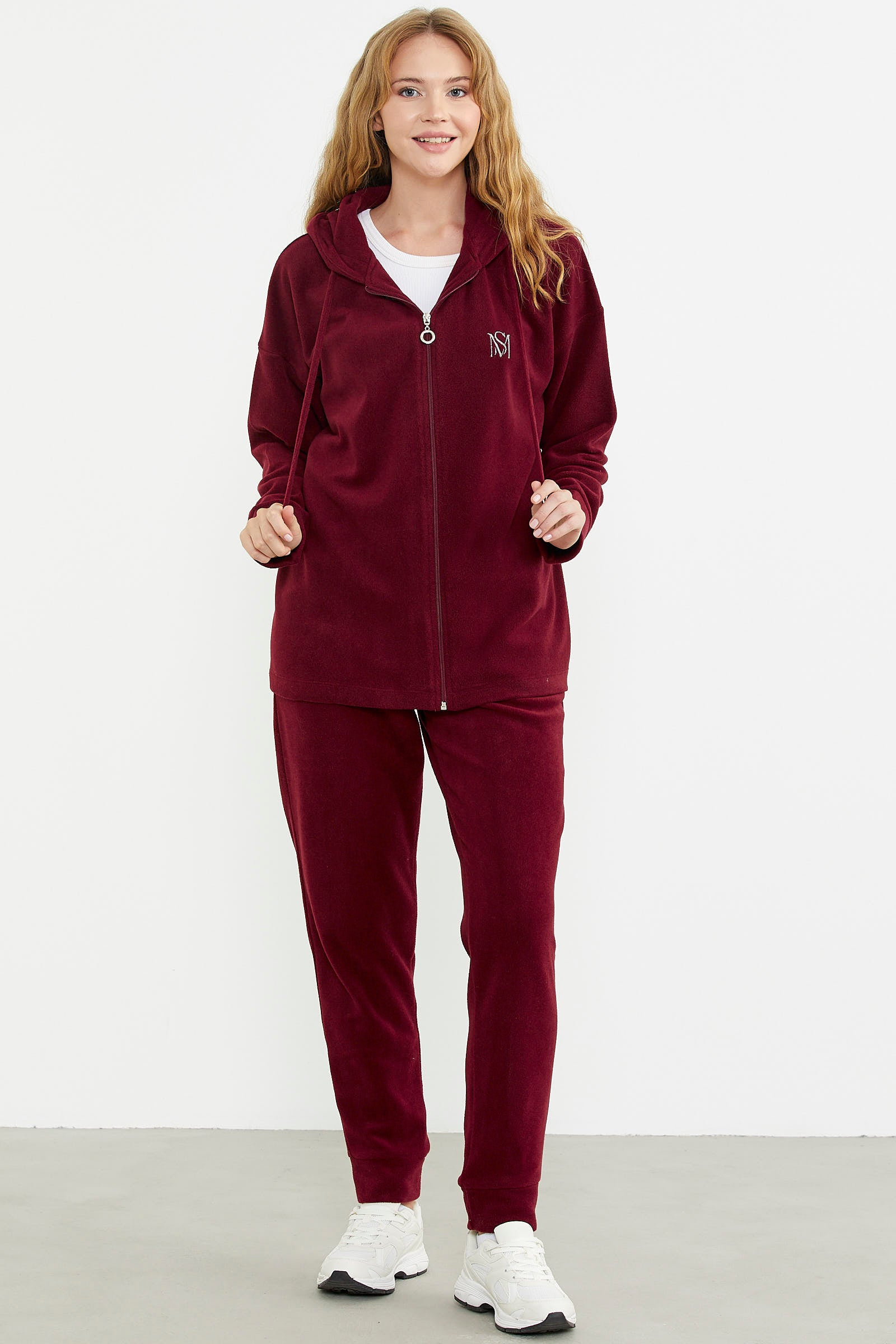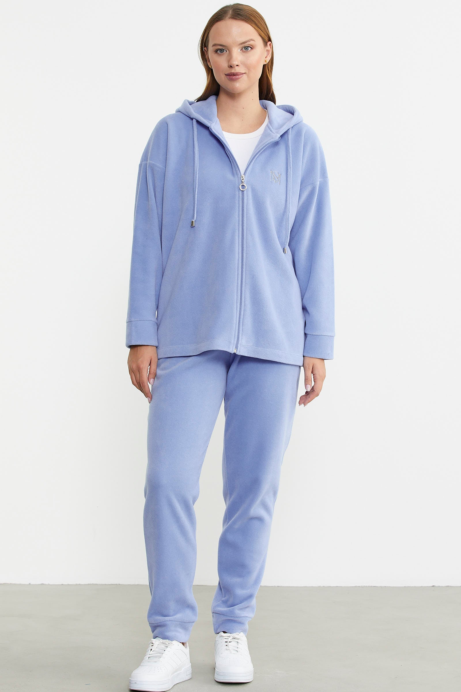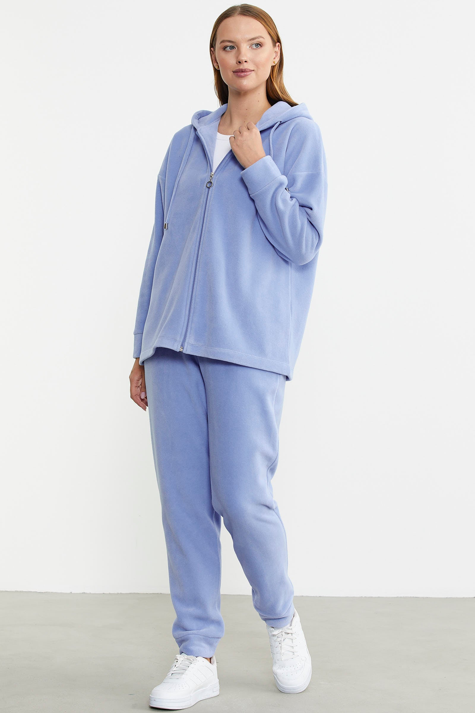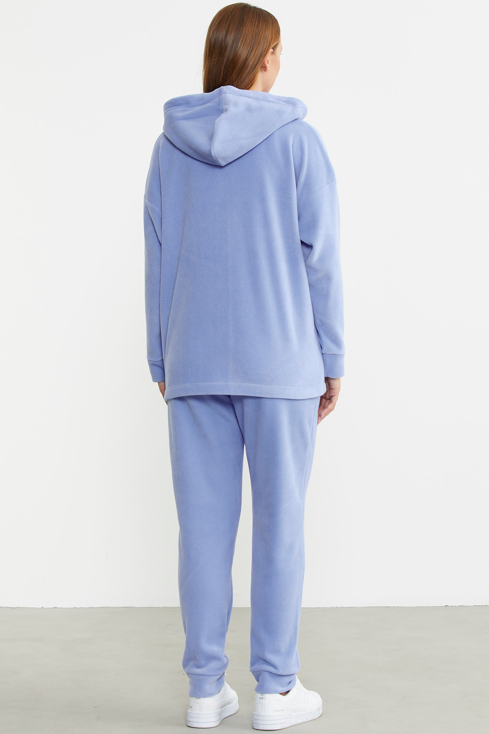 Oversize polar fleece tracksuit with hood provides warm and comfortable use on cold winter days.