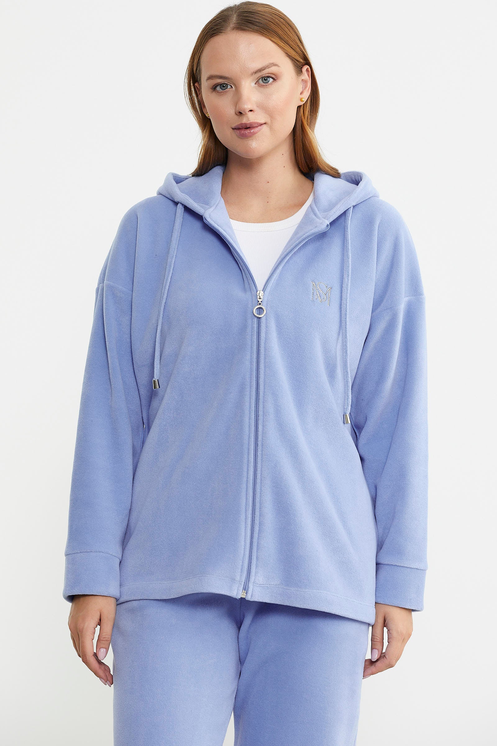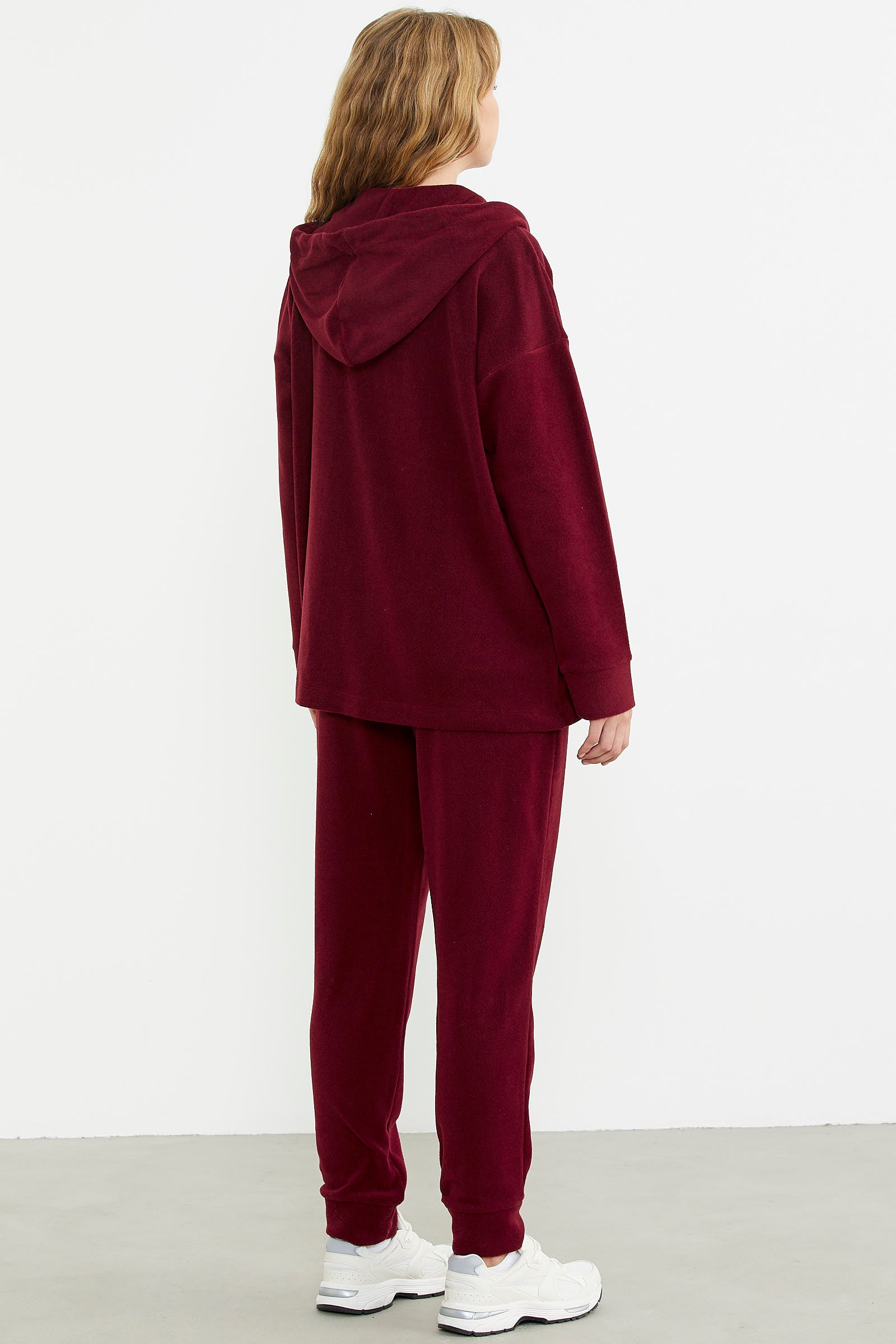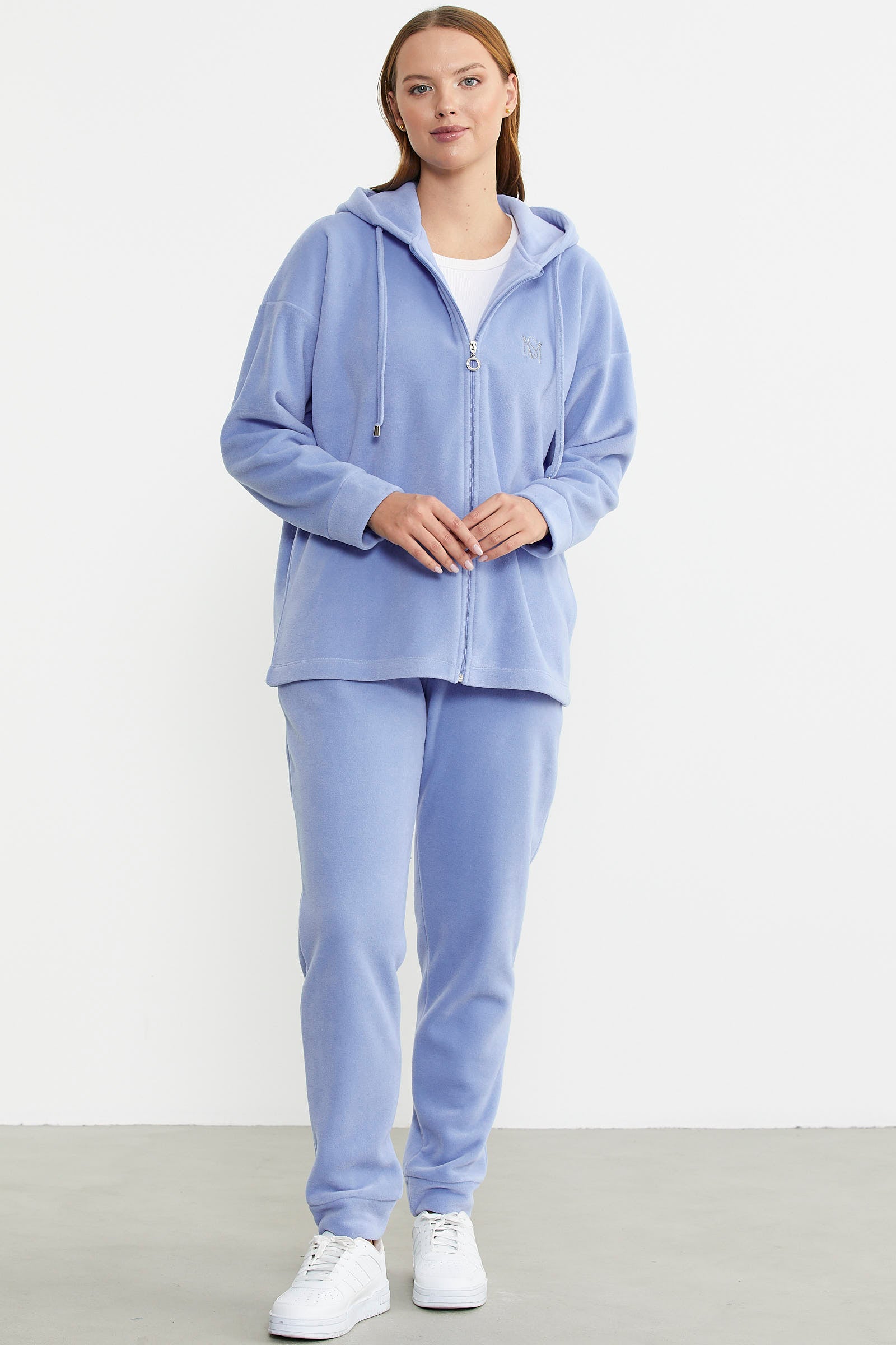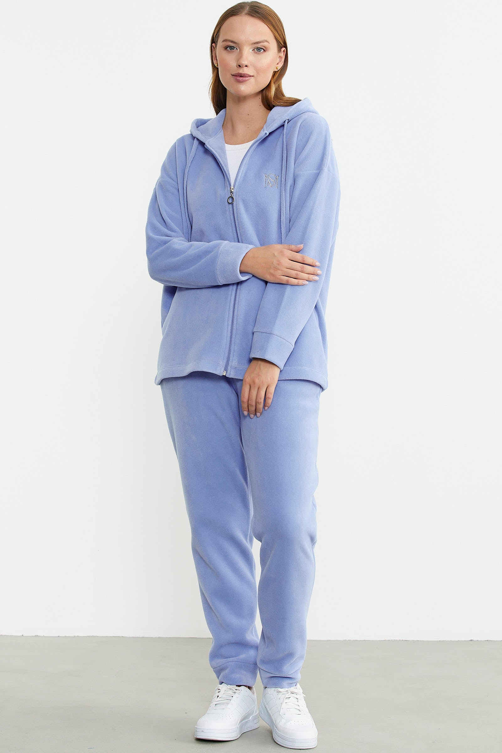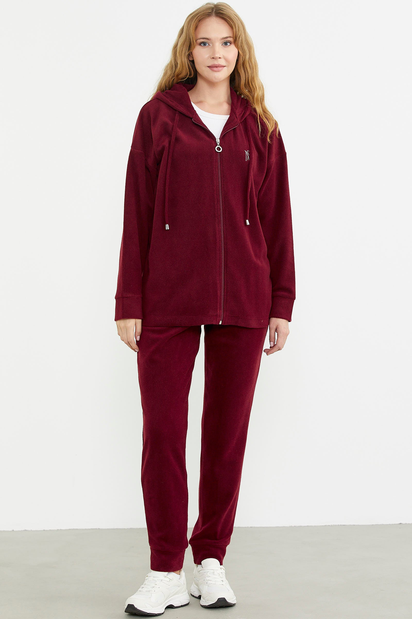Oversize polar fleece tracksuit with hood provides warm and comfortable use on cold winter days.
