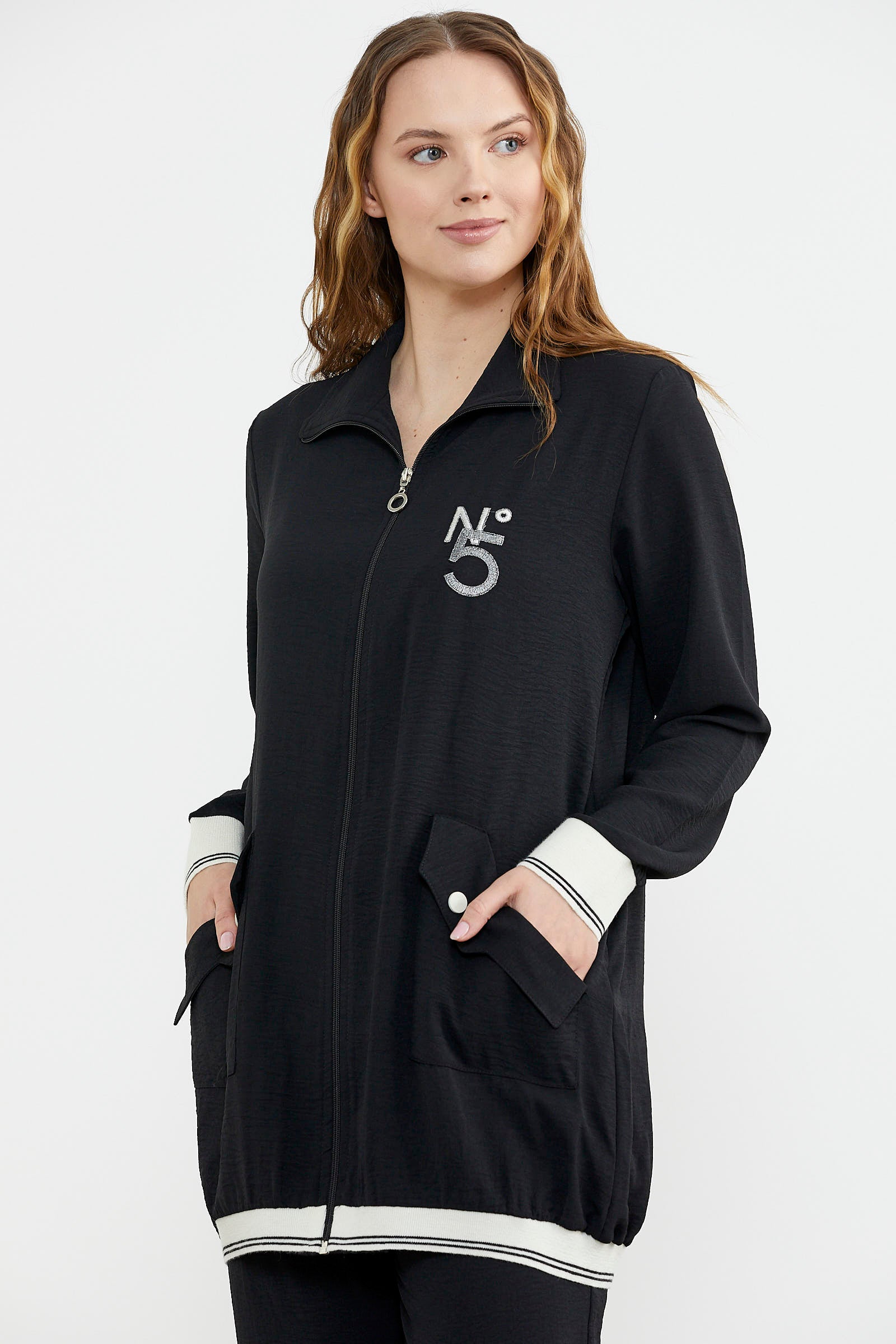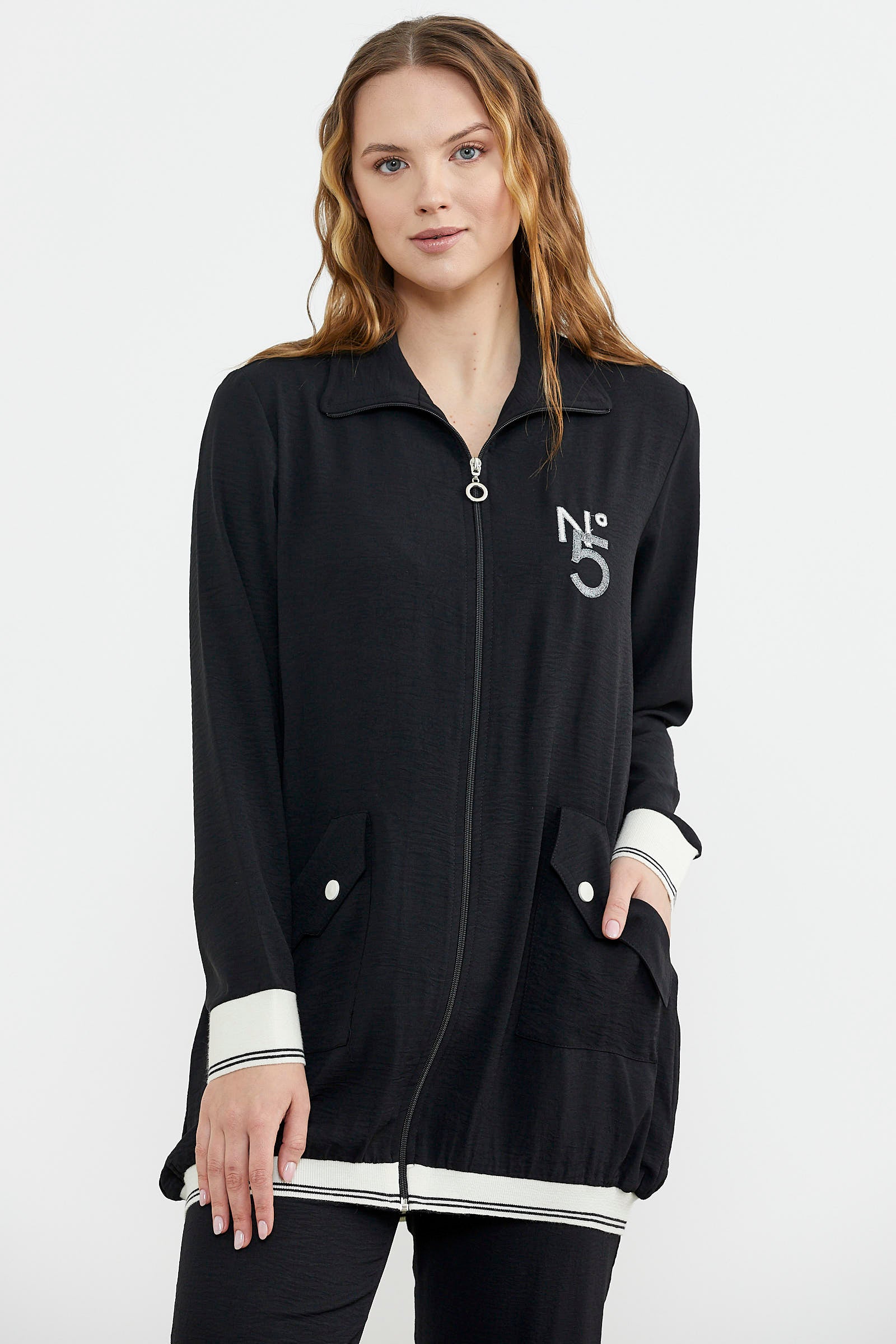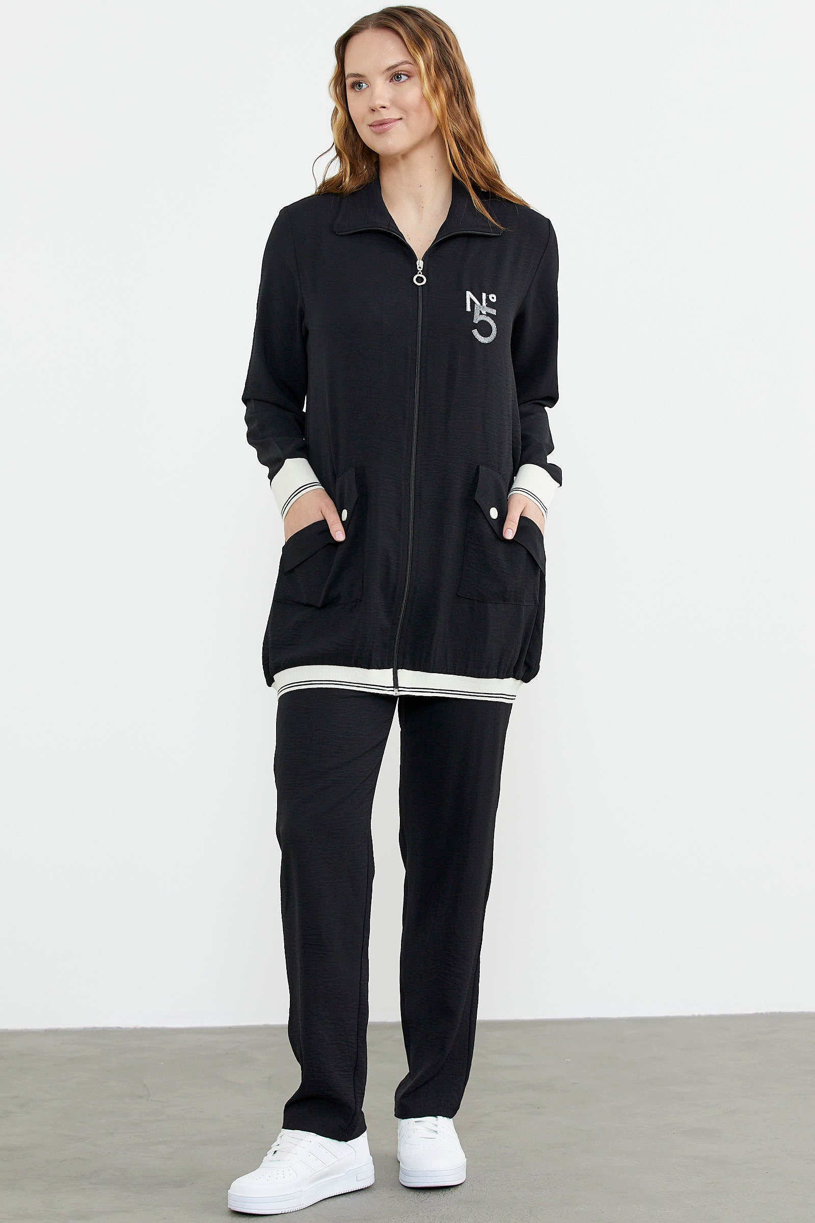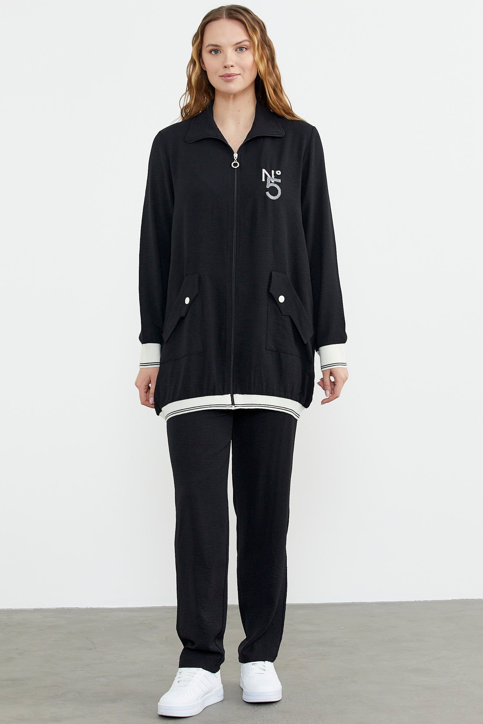 The front body is enlivened with large pocket details and the sleeve and hem details are completed. It is a team with pipe leg trousers.