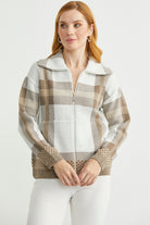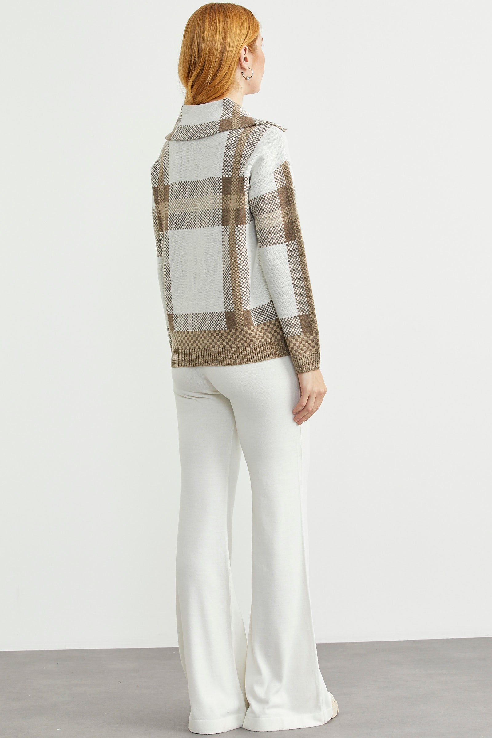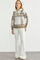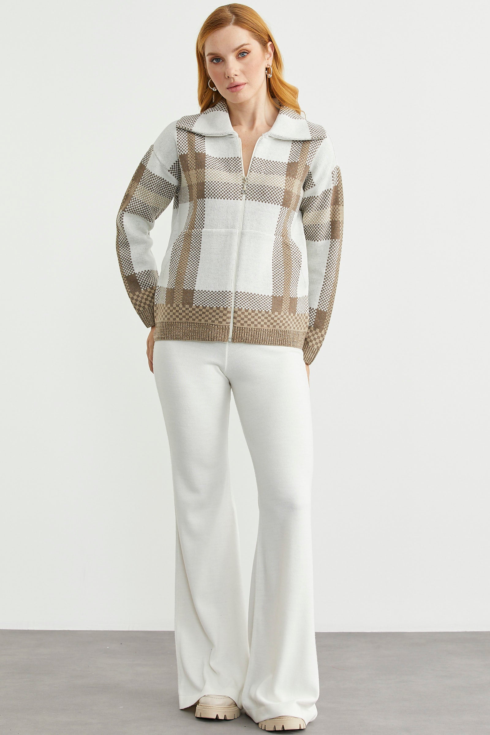 Ekose Blok Geçişli Yünlü Triko Hırka - Bej