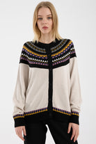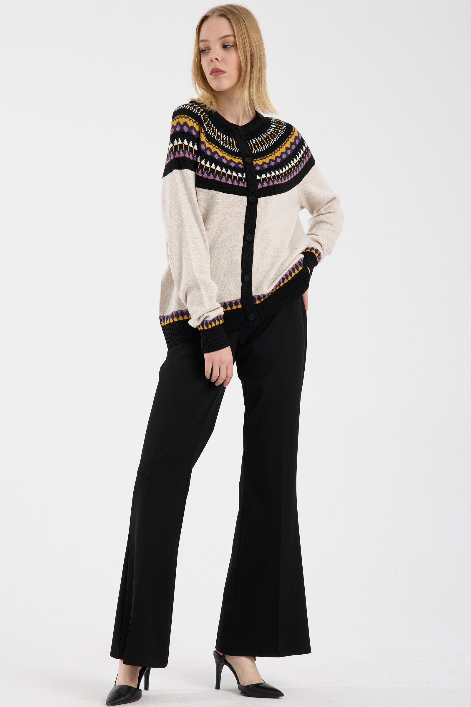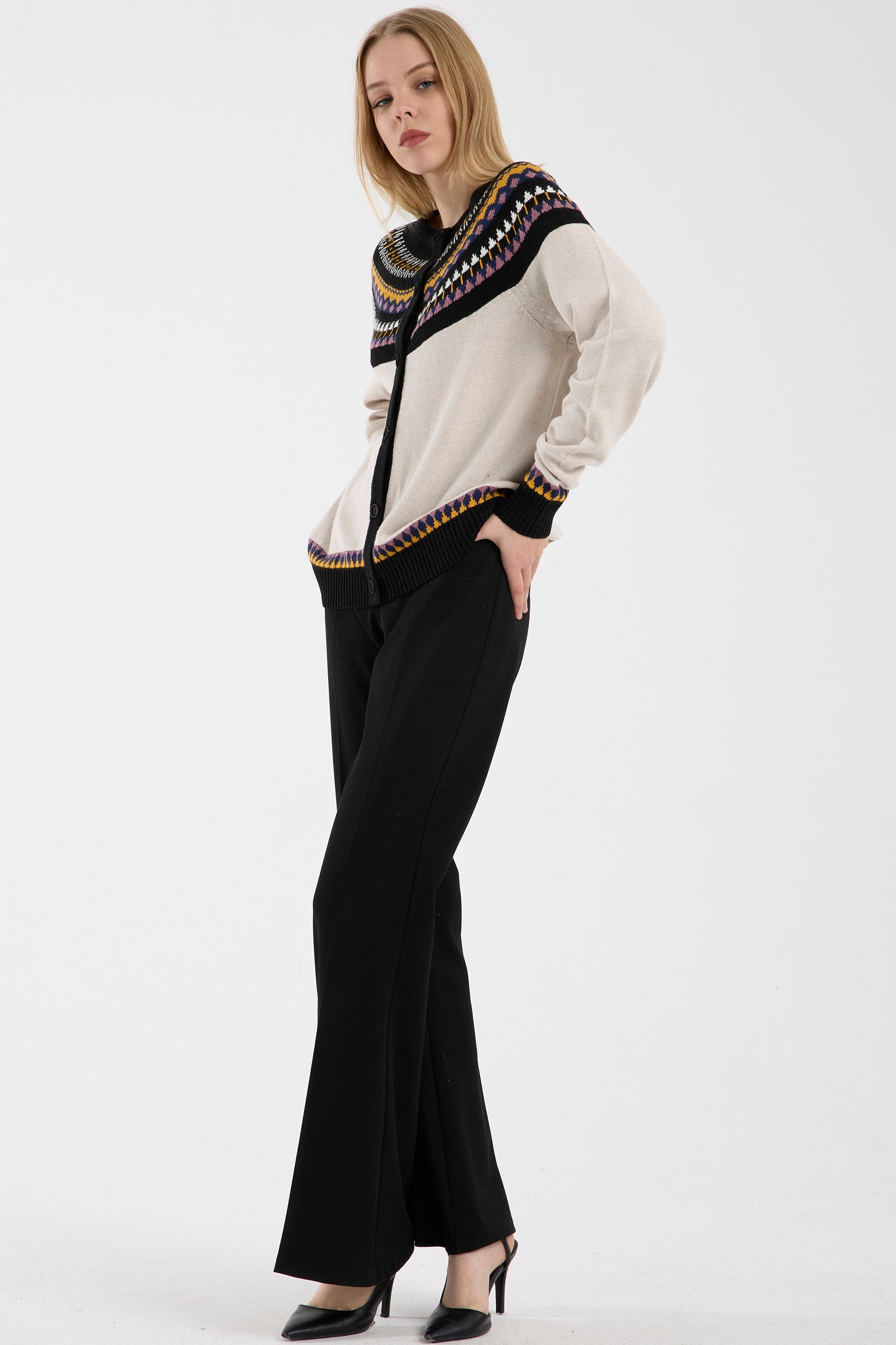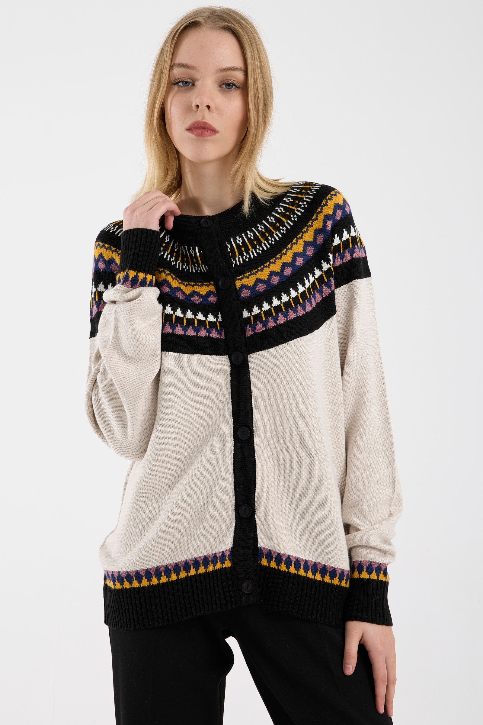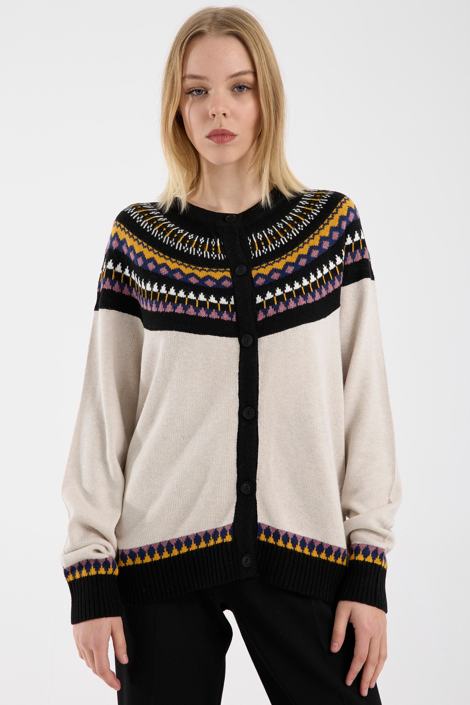 Etnik Motifli Yünlü Triko Hırka - Taş