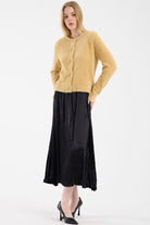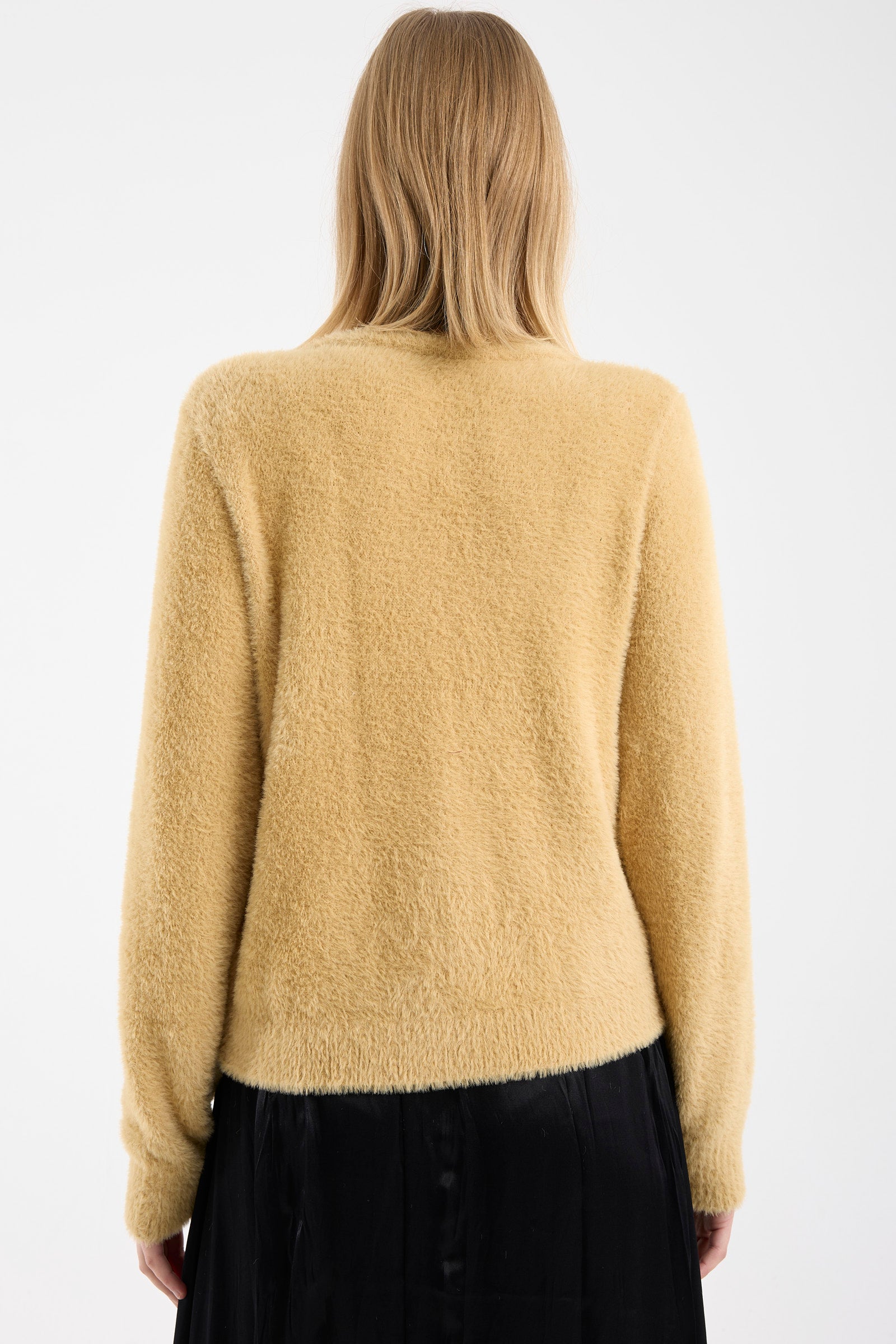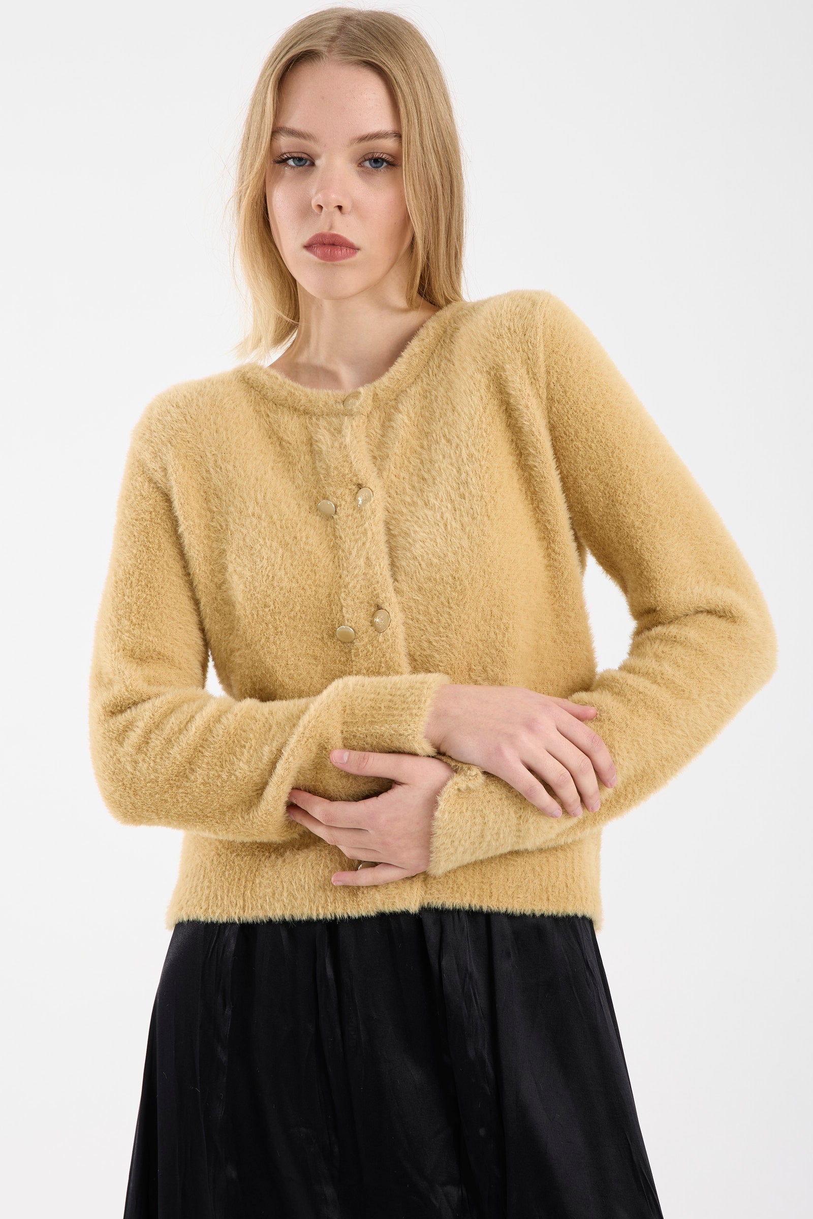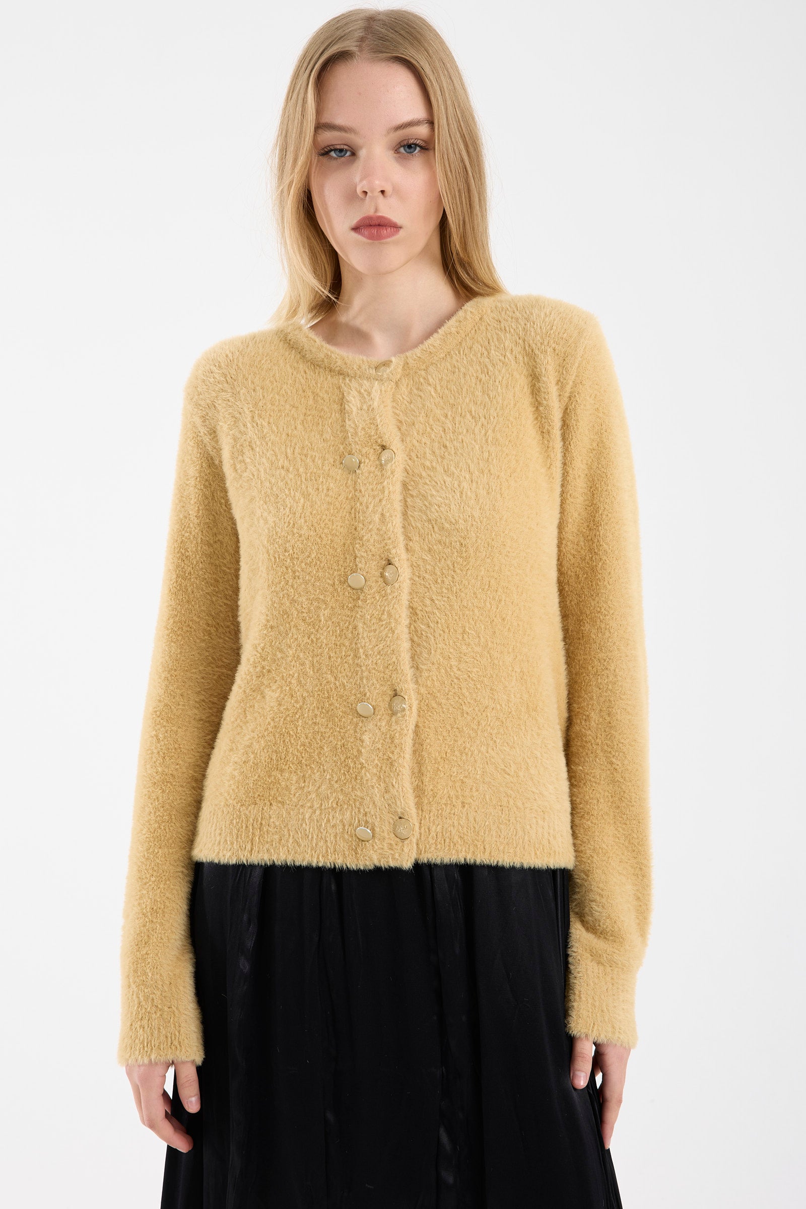 Metal Düğme Detaylı Sakallı Triko Hırka - Bej