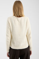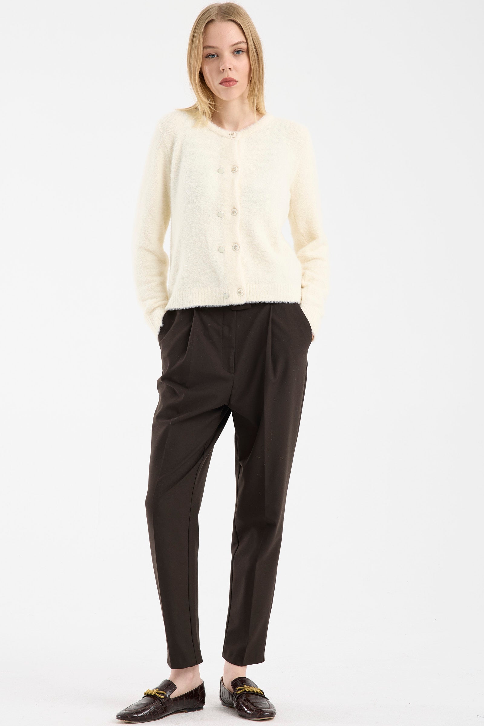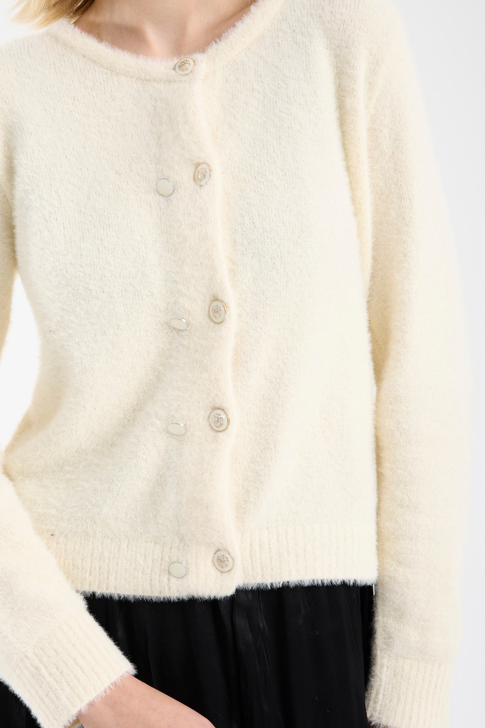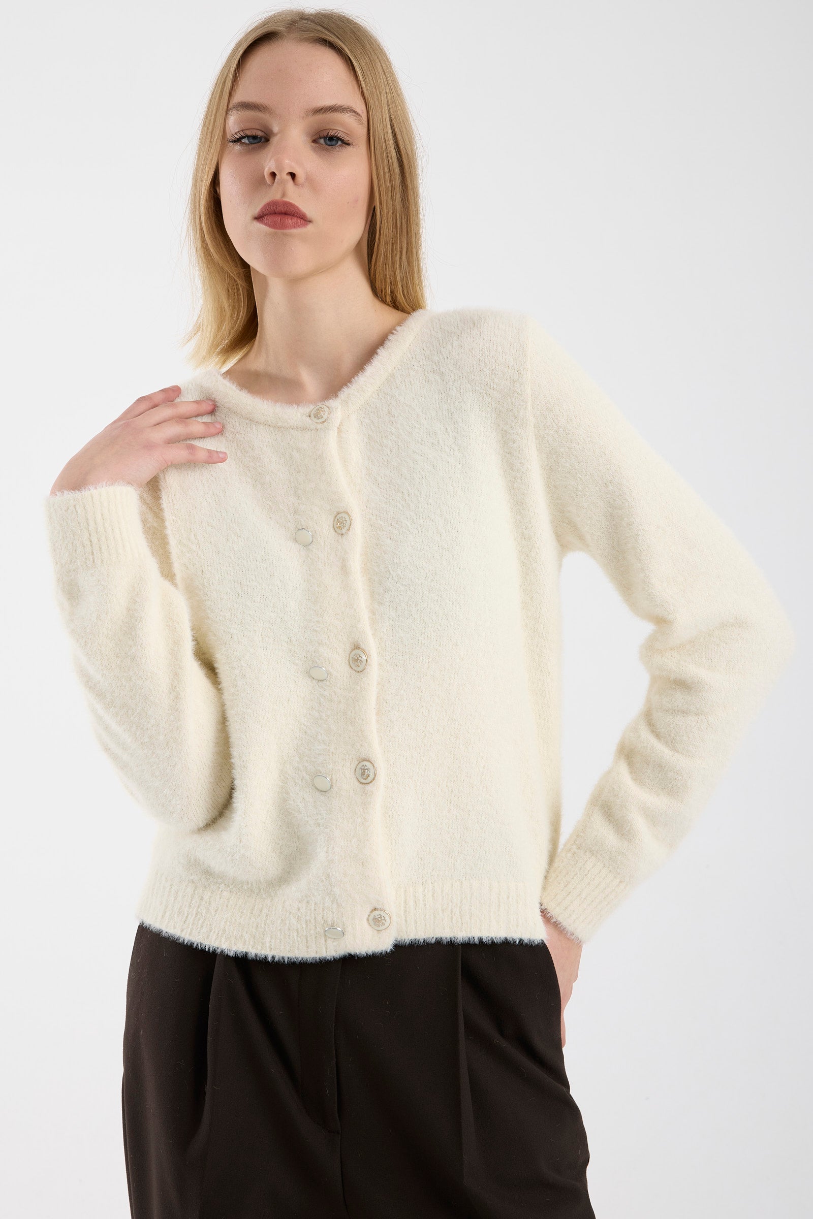 Metal Düğme Detaylı Sakallı Triko Hırka - Kemik