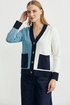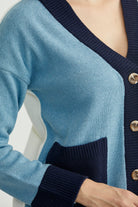 V yakalı, yün oranı yüksek, yumuşak triko hırka. Düşük omuzlu, bol kesimli, cepli. Renk kombinlidir.