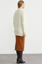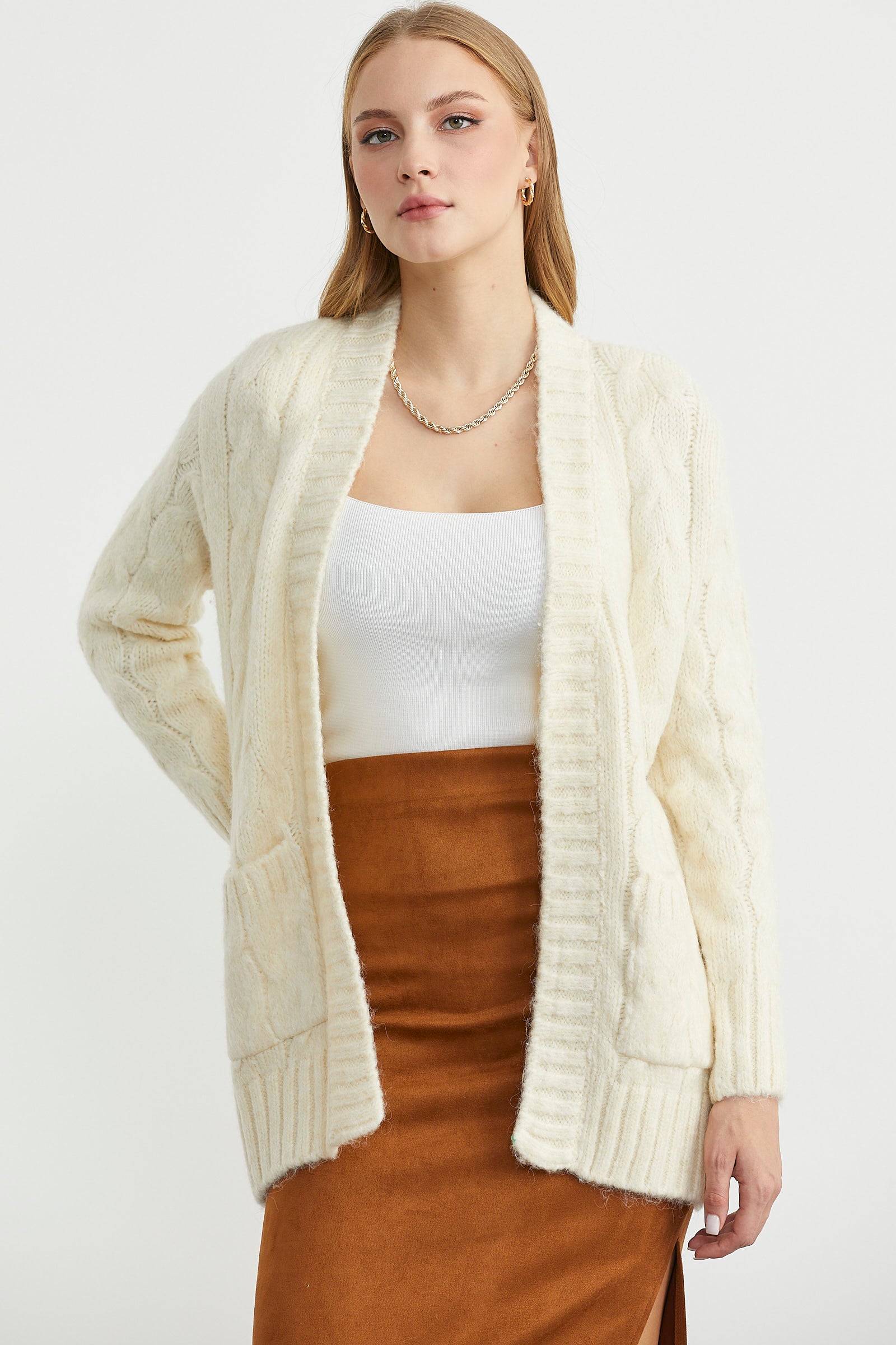 Saç Örgü Motifli Cepli Triko Hırka - Kemik