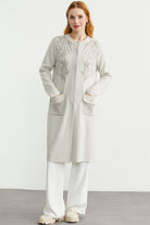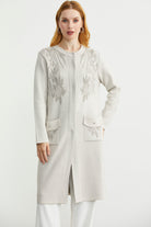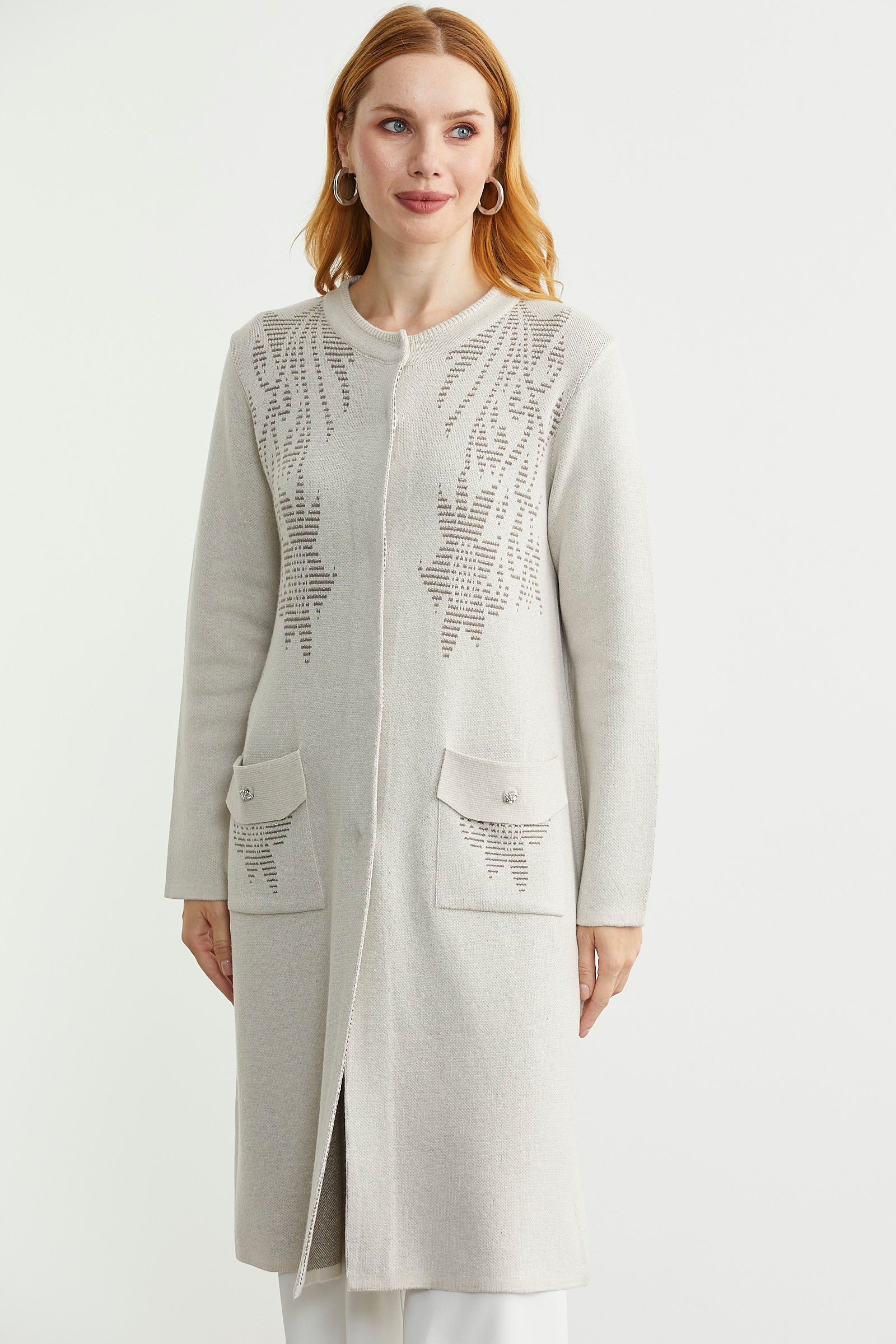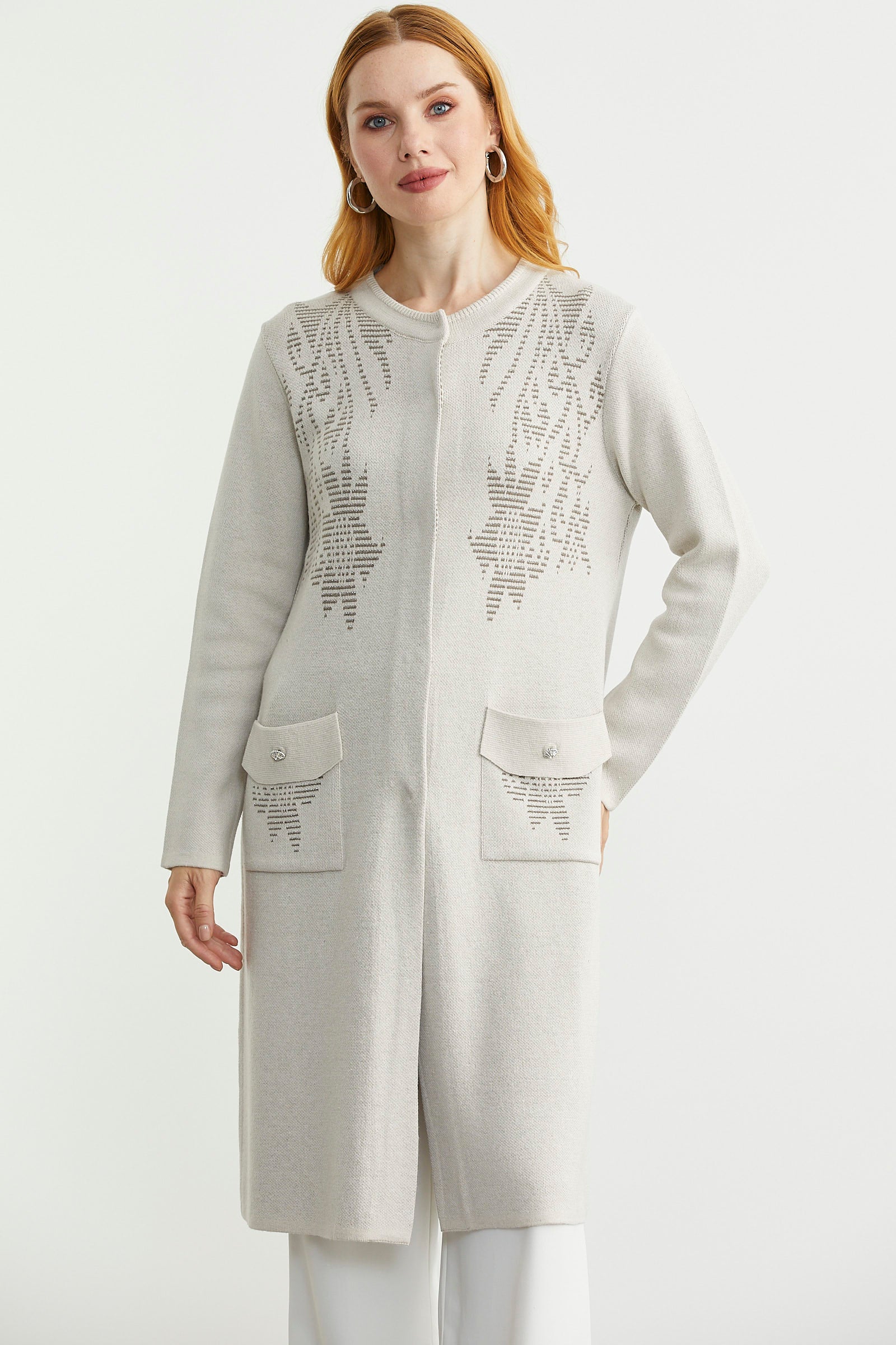 Yüksek oranda yün içeren triko ceket uzun boy olarak üretilmiştir. Desenli ve ceplidir.