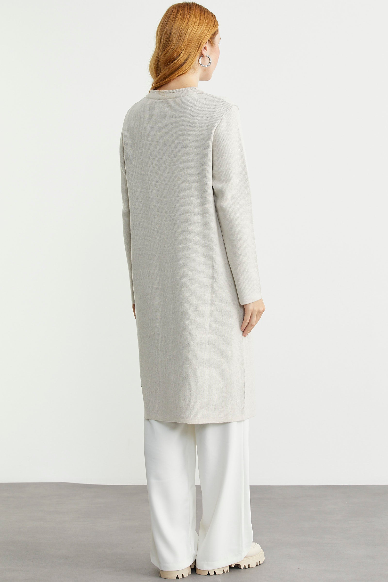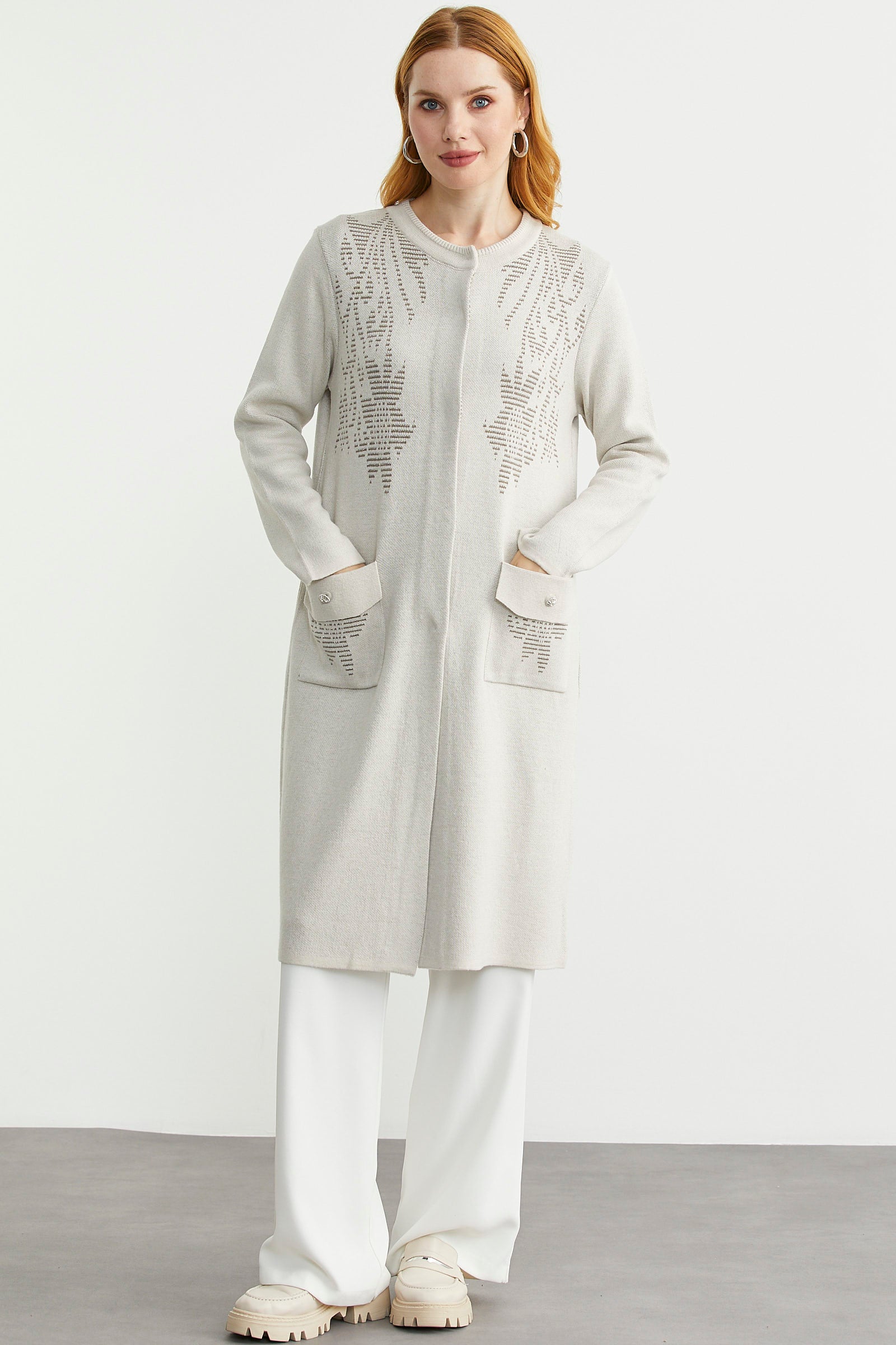 Uzun Cep Detaylı Yünlü Triko Hırka - Taş