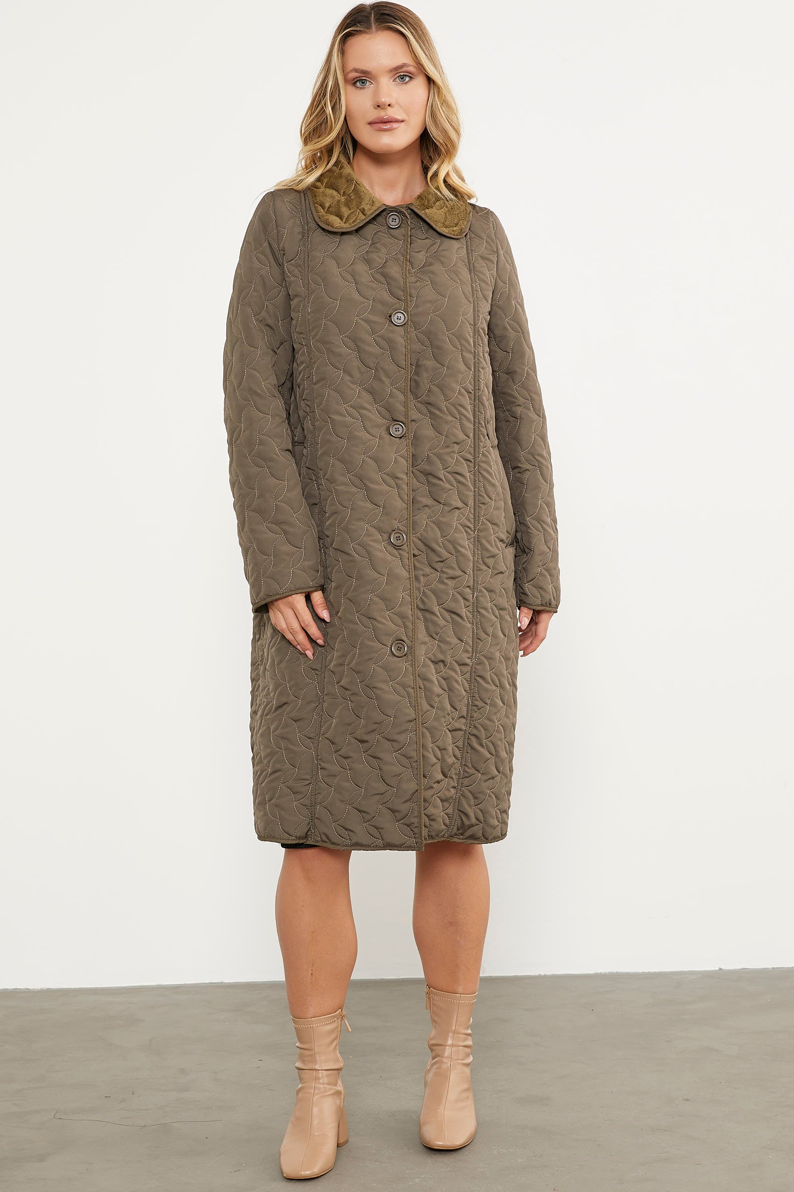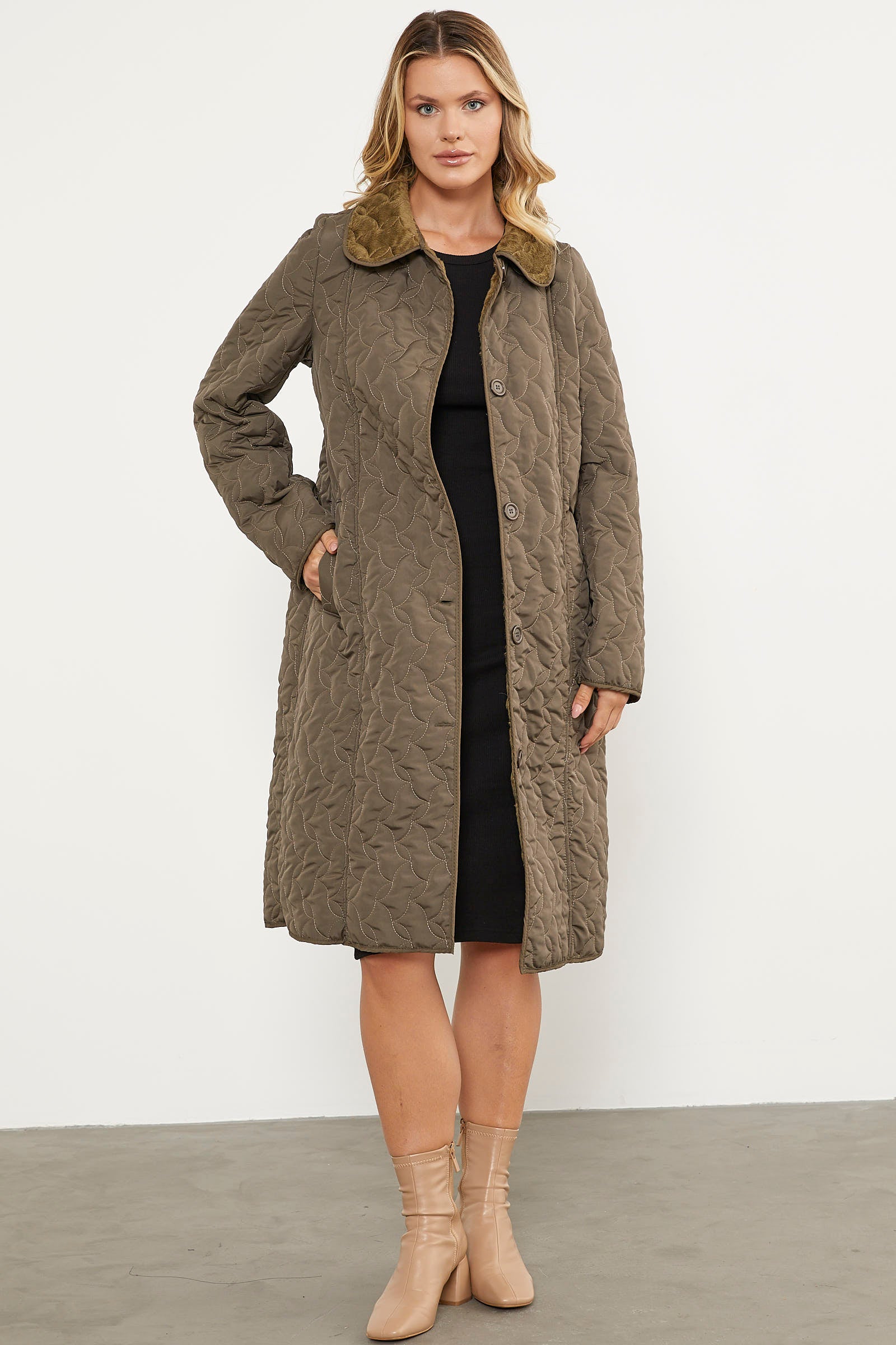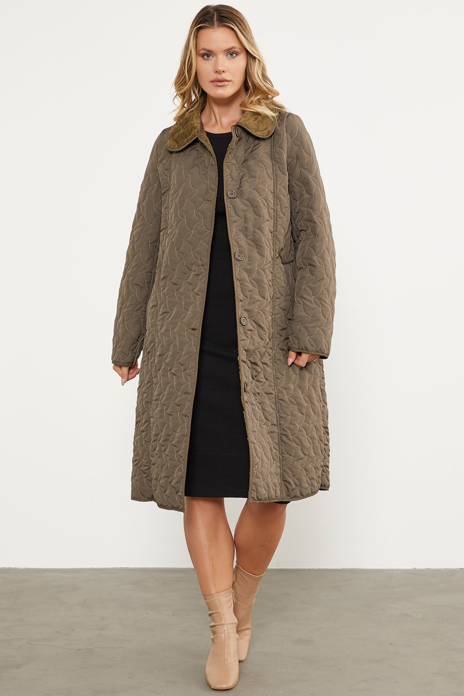 You can feel comfortable in the winter without being affected by the cold with this oversized coat with quilted details, a completely plush interior, and a shearling collar. The product has two side pockets and provides ease of use .