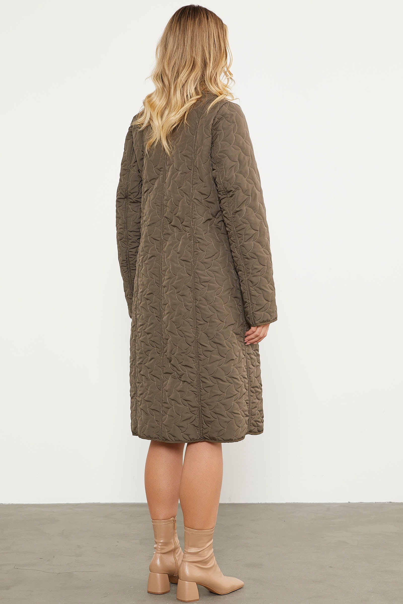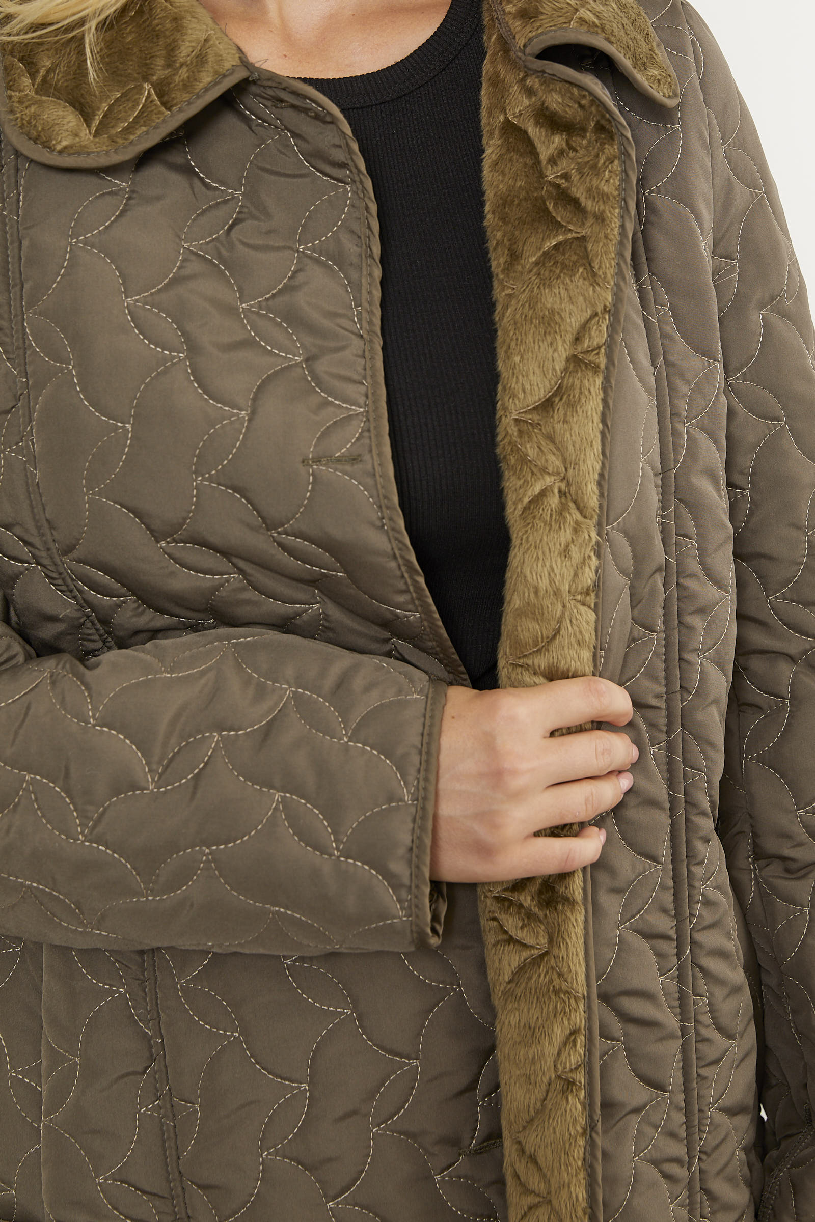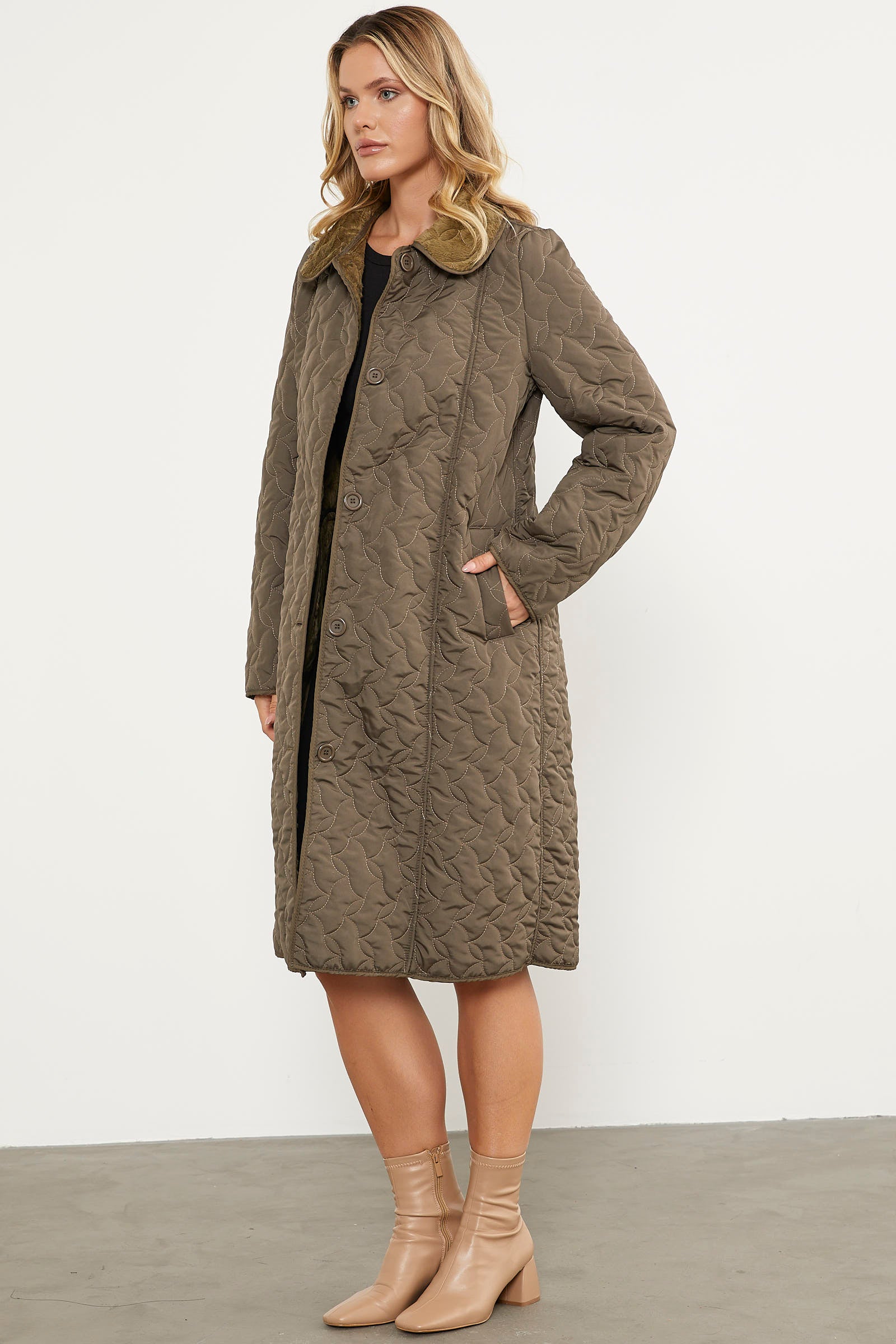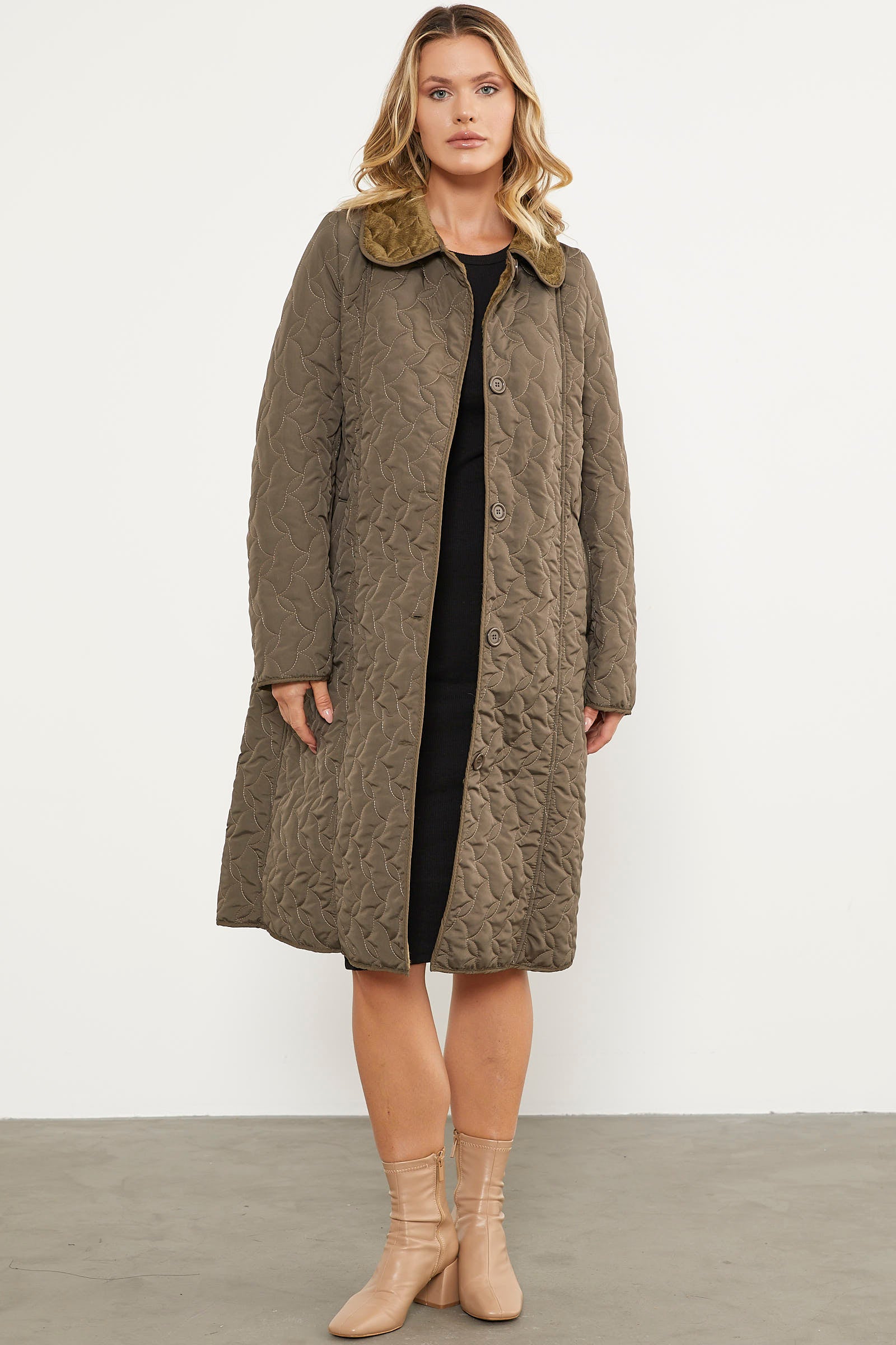 You can feel comfortable in the winter without being affected by the cold with this oversized coat with quilted details, a completely plush interior, and a shearling collar. The product has two side pockets and provides ease of use .