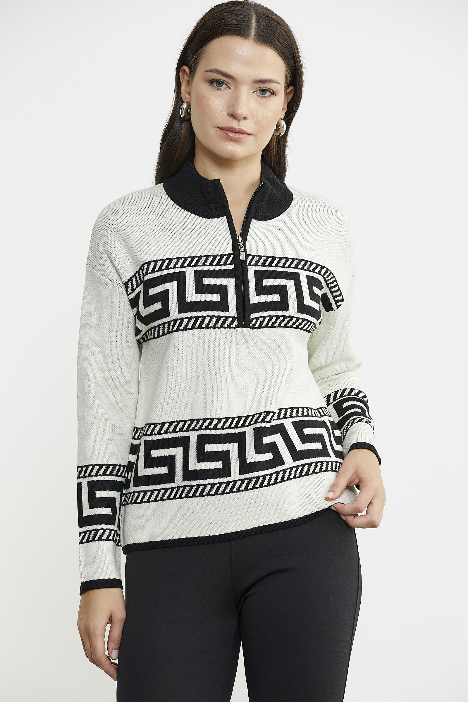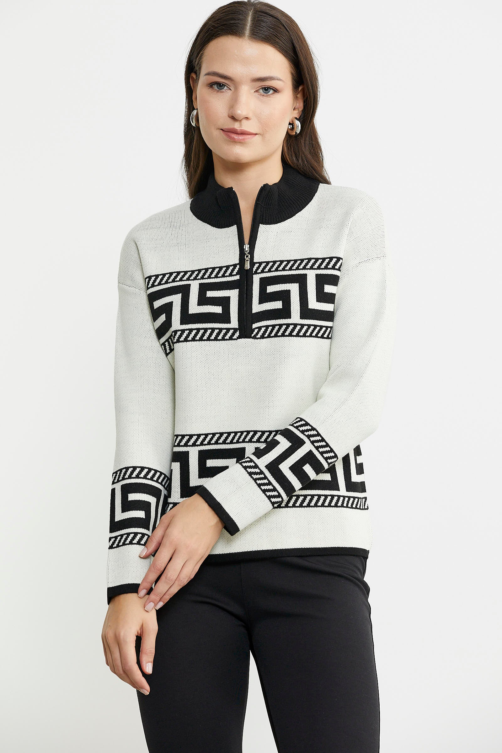 Knitted sweater with a high collar and half zipper closure. Block transitions on the sleeve cuffs and body.