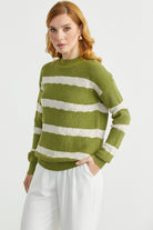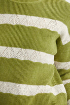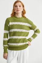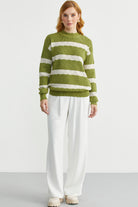 Dik Yaka Çizgili Triko Kazak - Yeşil