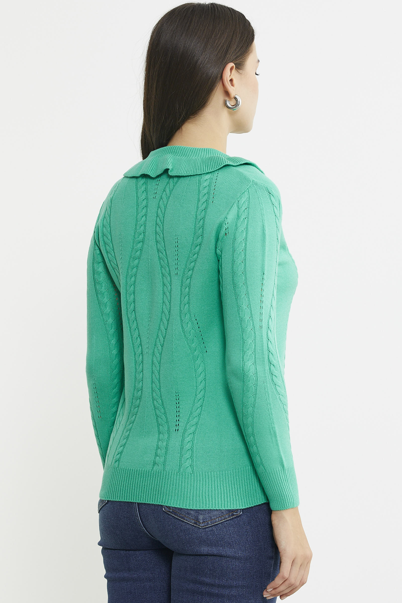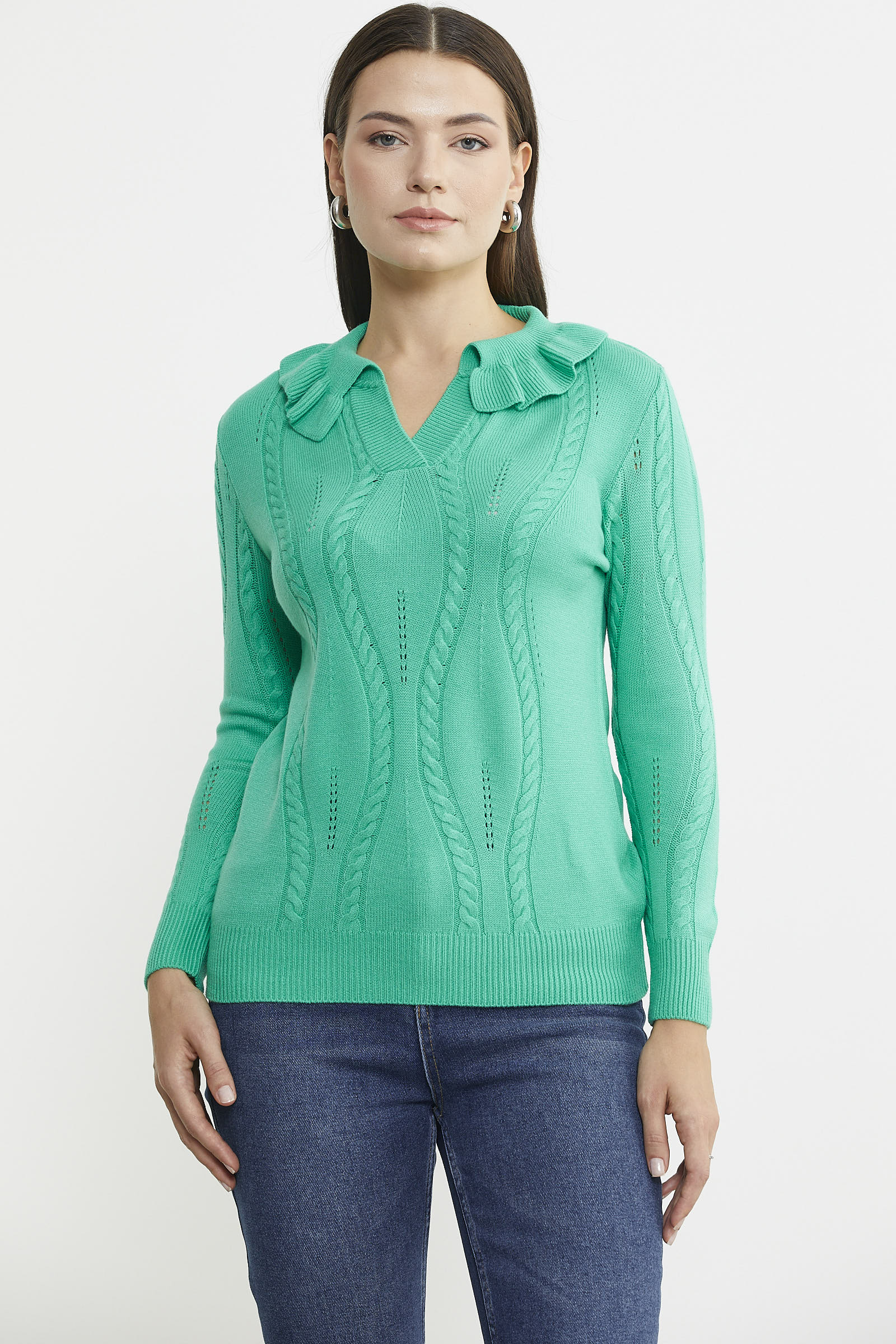 The knitted top, featuring a frilled collar detail, is finished with braided motifs. It has a comfortable fit.
