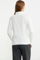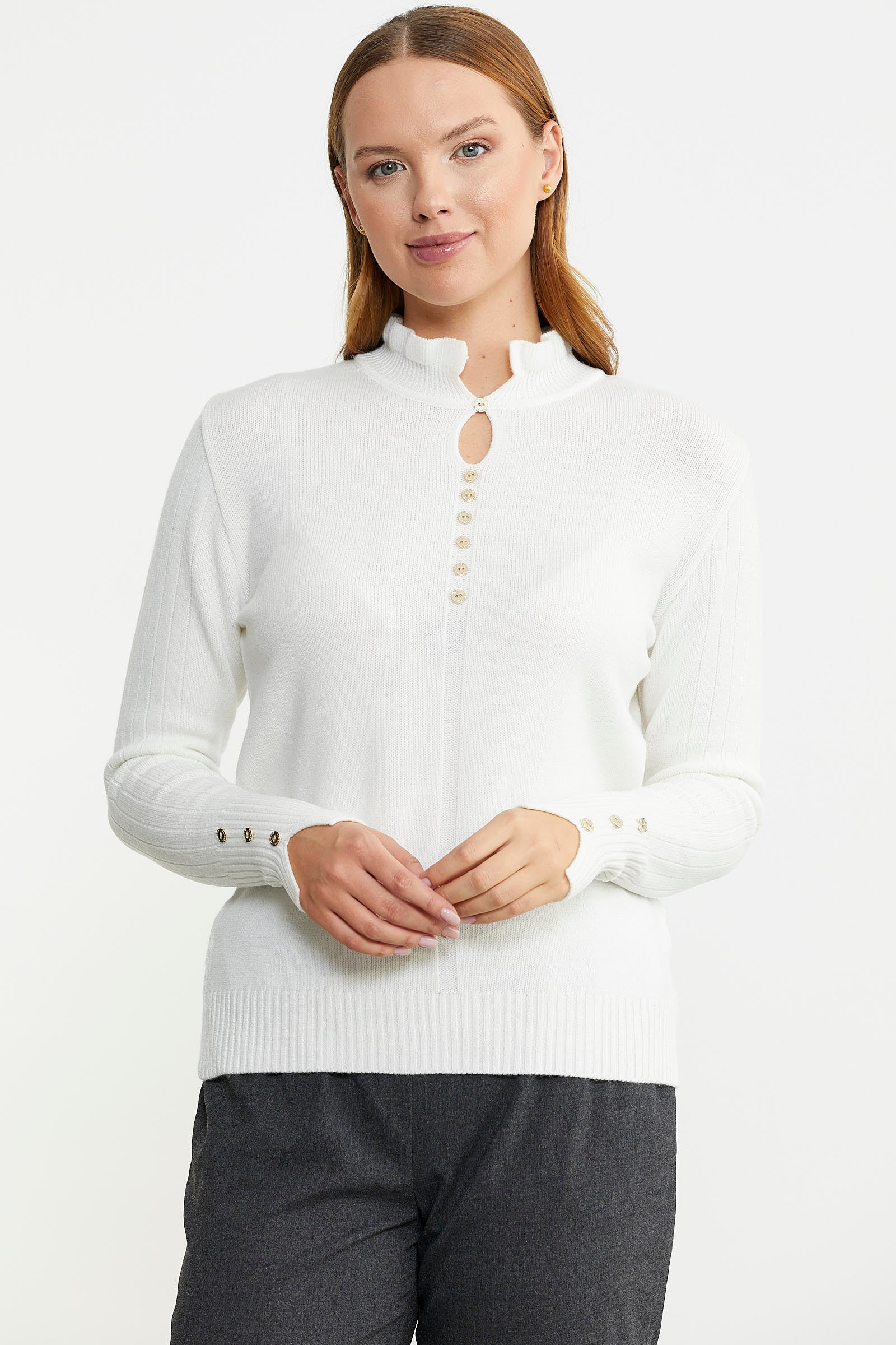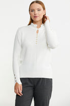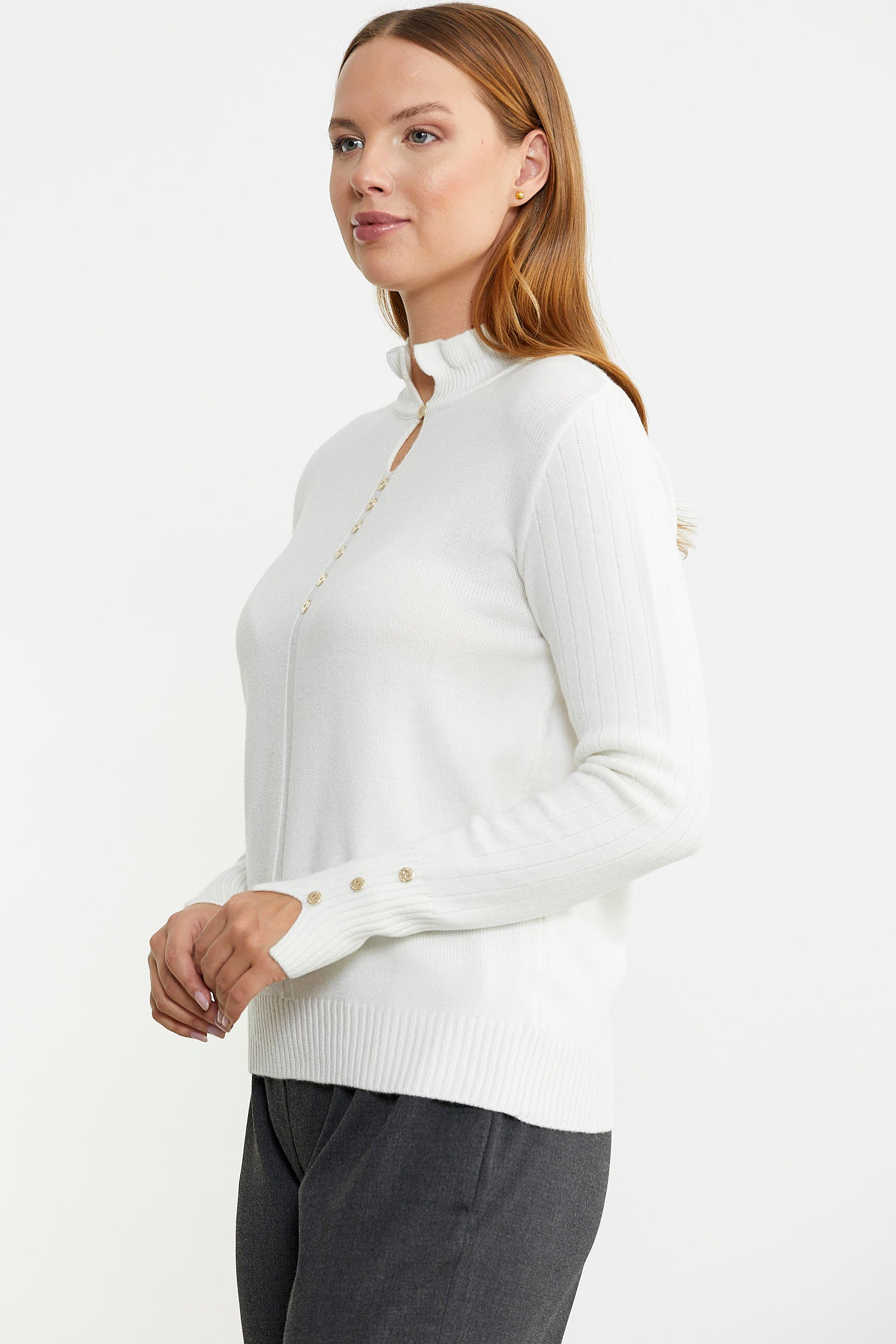 The knitted sweater with a ruffled mandarin collar detail adapts to the body with its flexible structure and soft texture. The button details on the sleeves and collar add movement to the design.