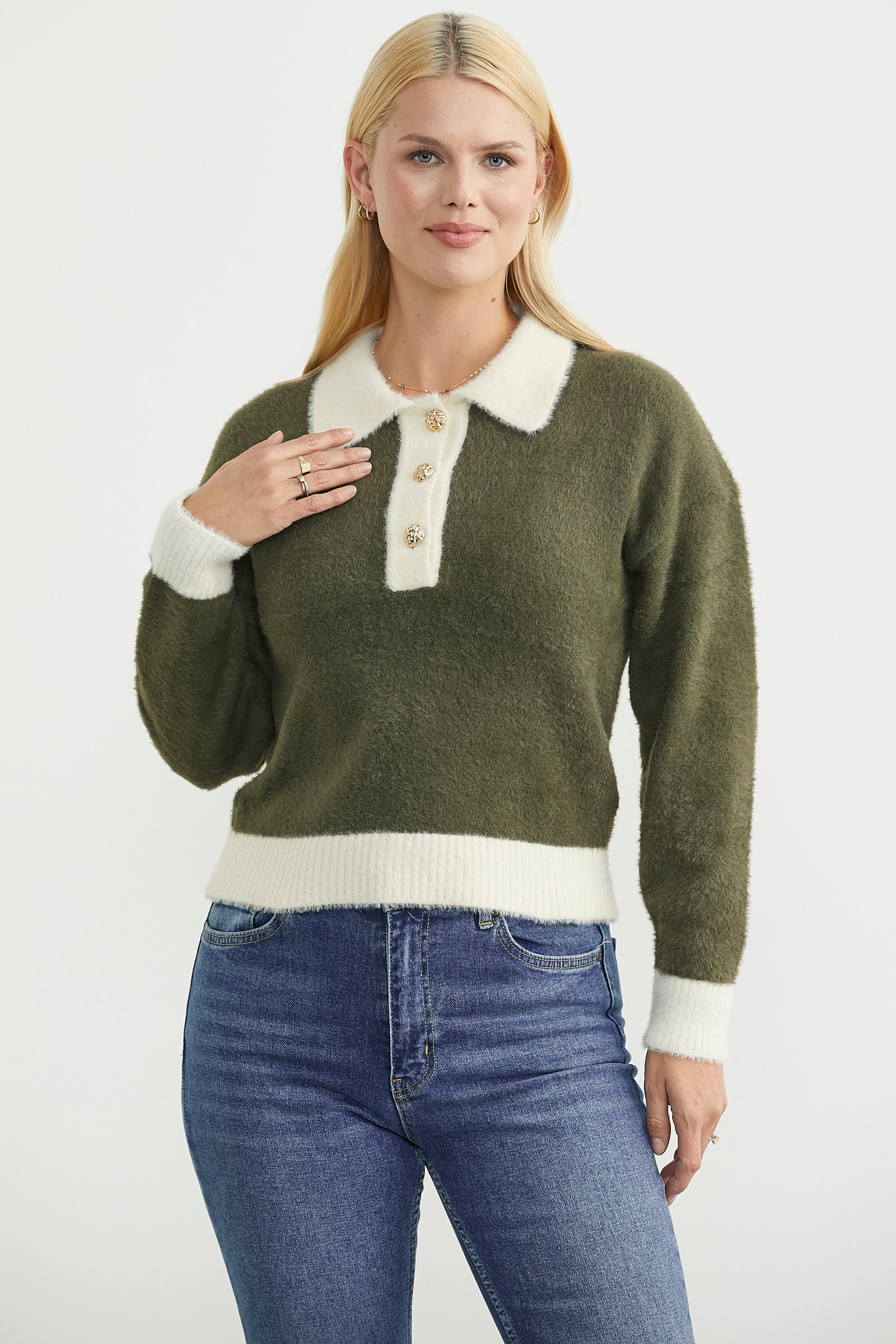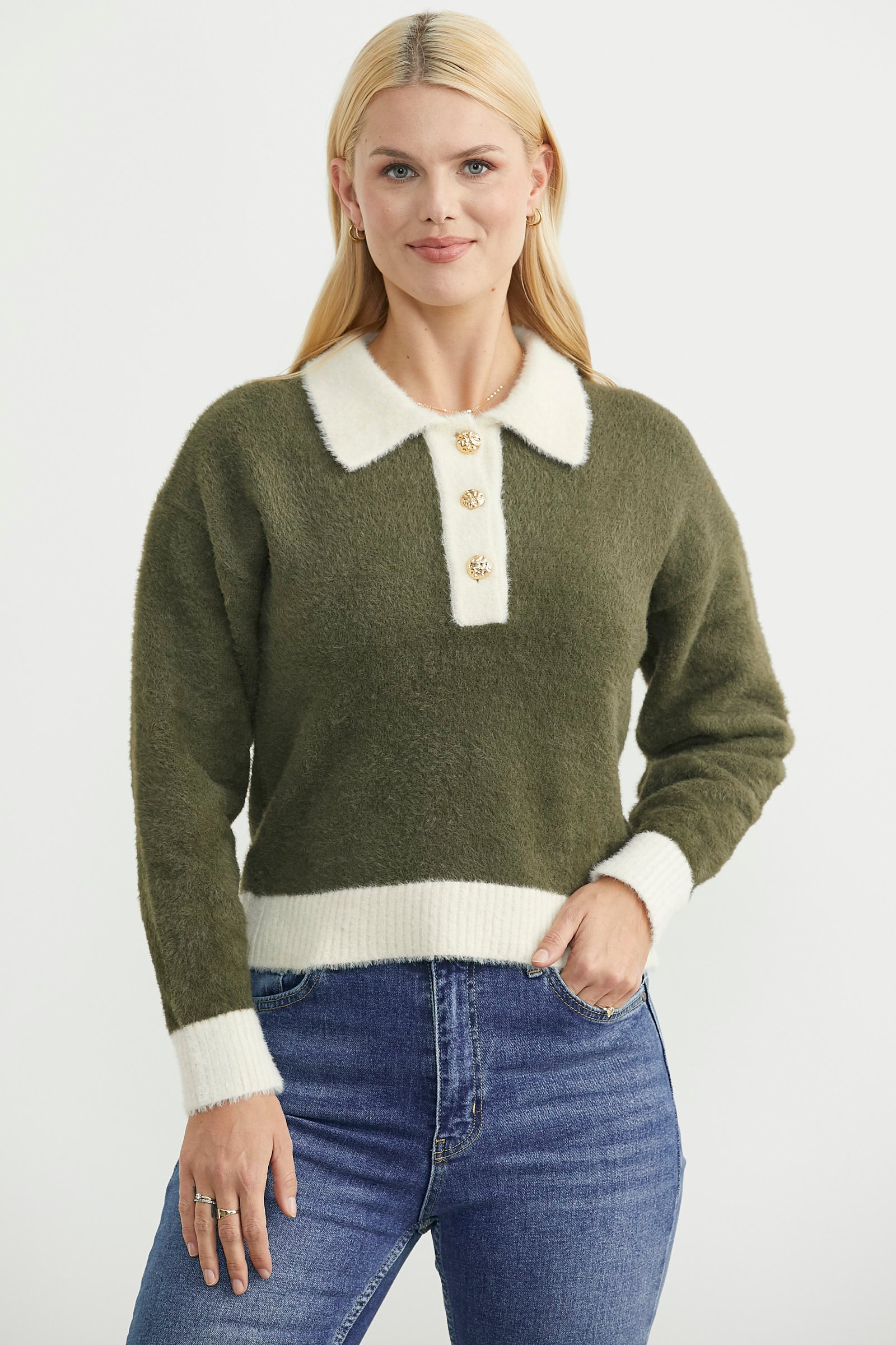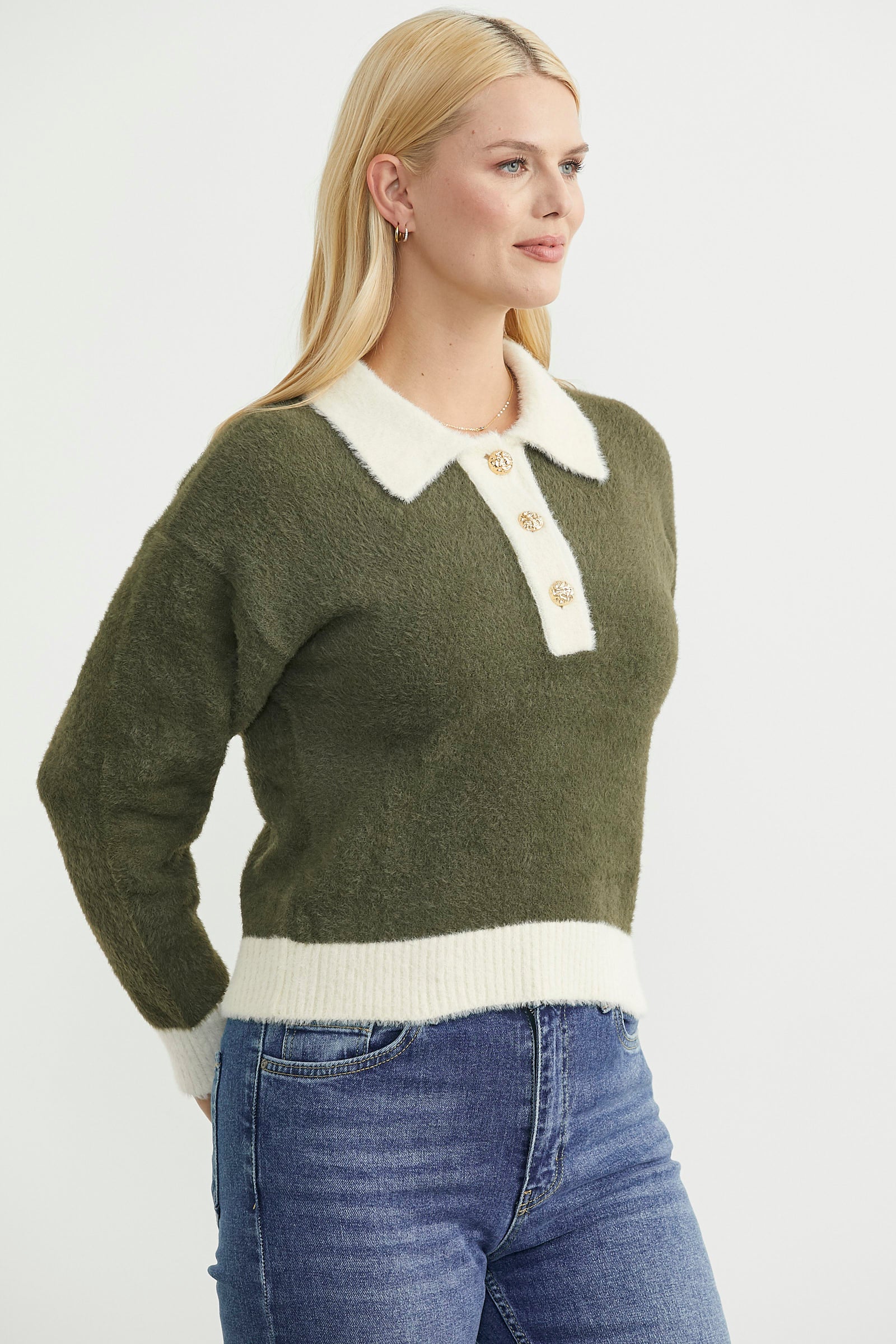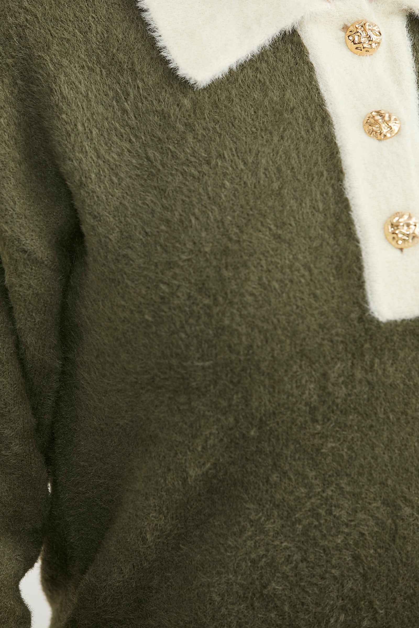 Yumoş, lastik örgülü kısa triko kazak. Kontrast renk yakalı, metal düğmeli, rahat kalıp.