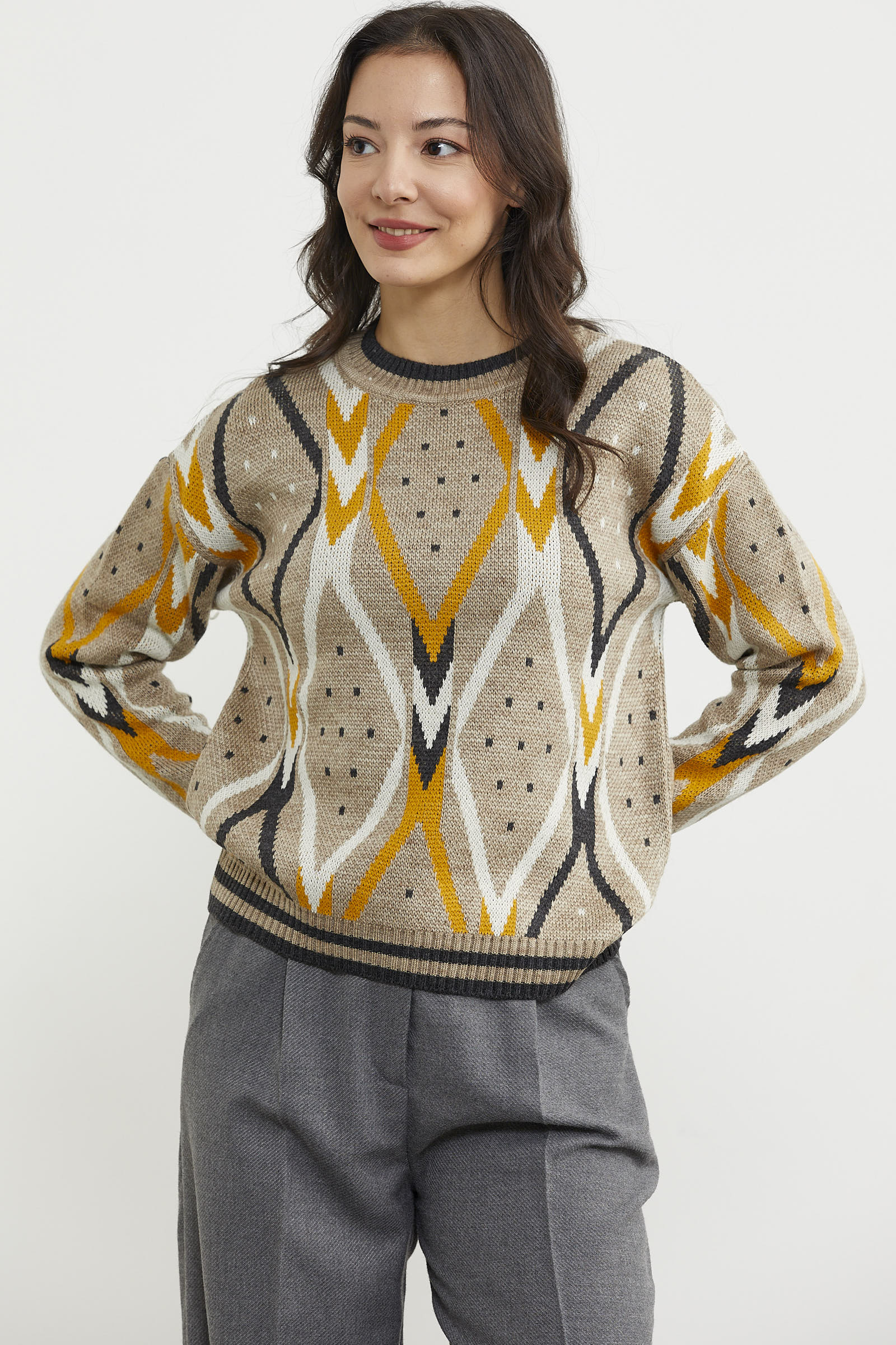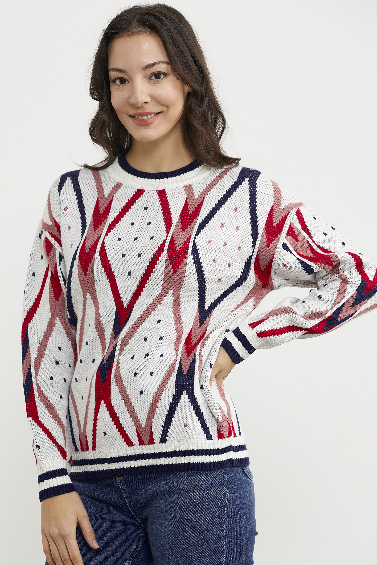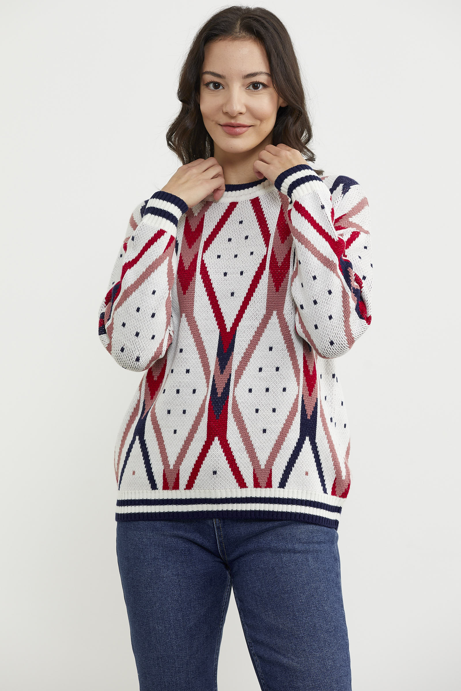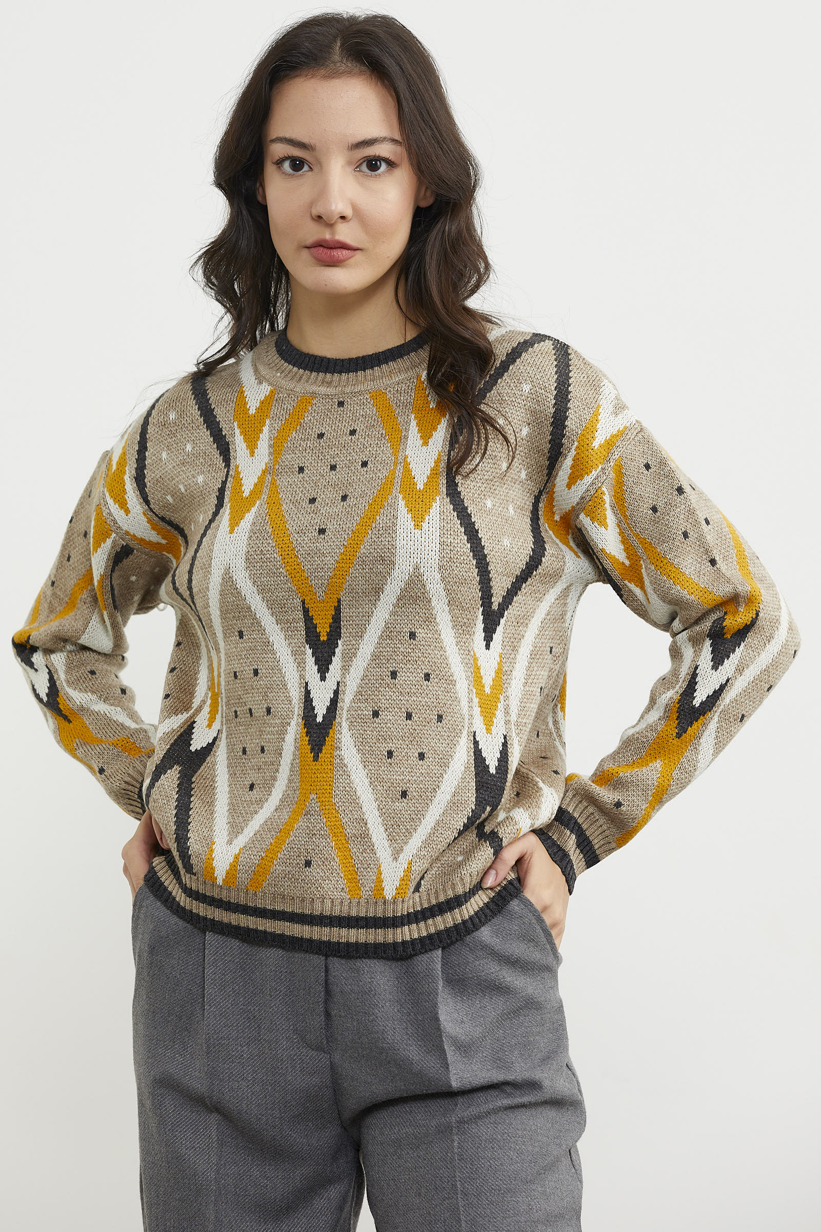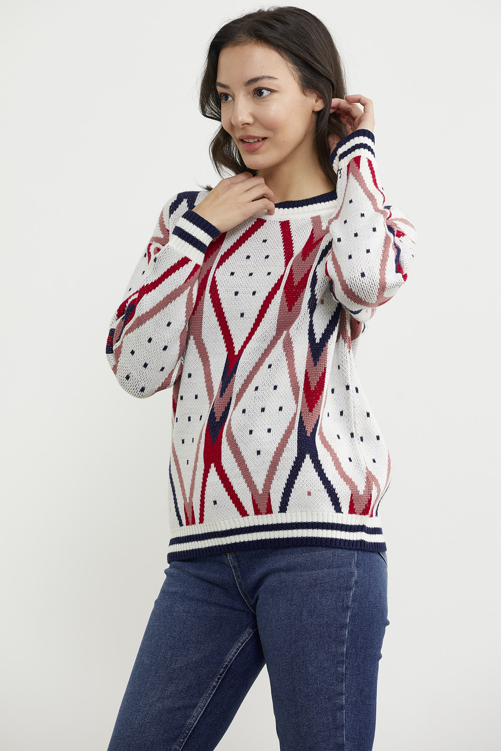 The wool knitted sweater, which will draw attention to you with its colorful diamond patterns and add energy to your look with its vibrant colors, is an indispensable part of your sophisticated look.