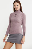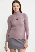 Turtleneck, long sleeves, button accessory details on the front and cuffs, derby knit sweater.