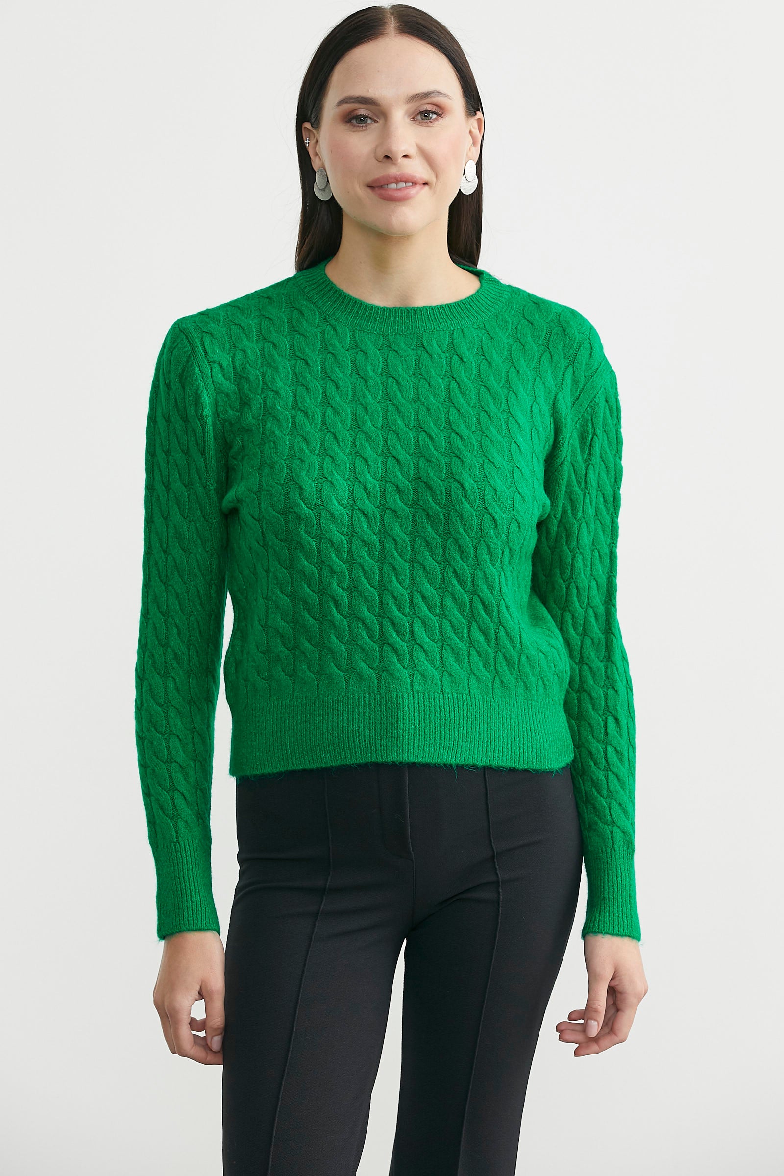 Yumoş Saç Örgü Motifli Triko Kazak - Benetton Yeşil