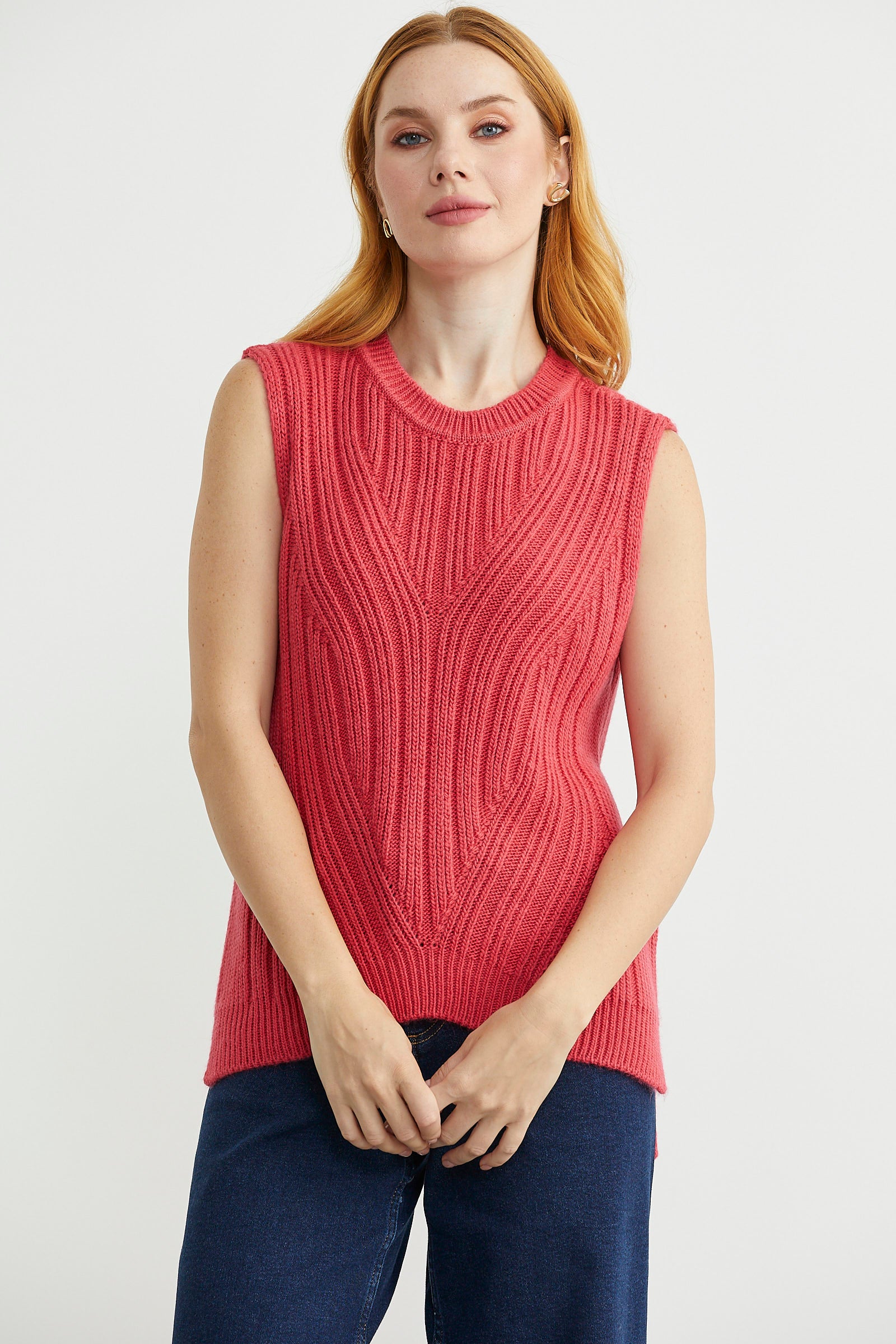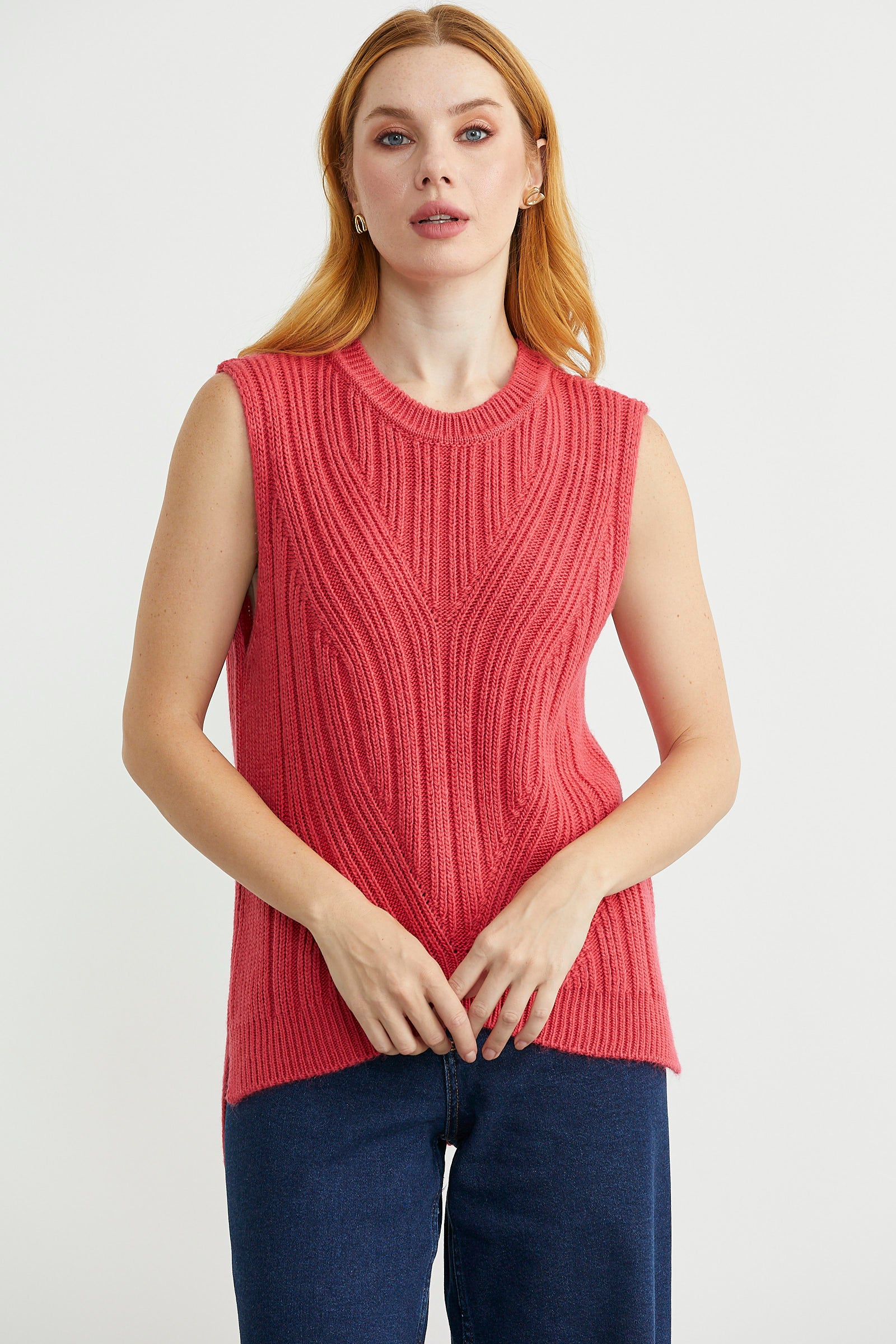 Arkası Uzun Bisiklet Yaka Yünlü Triko Süveter - Mercan