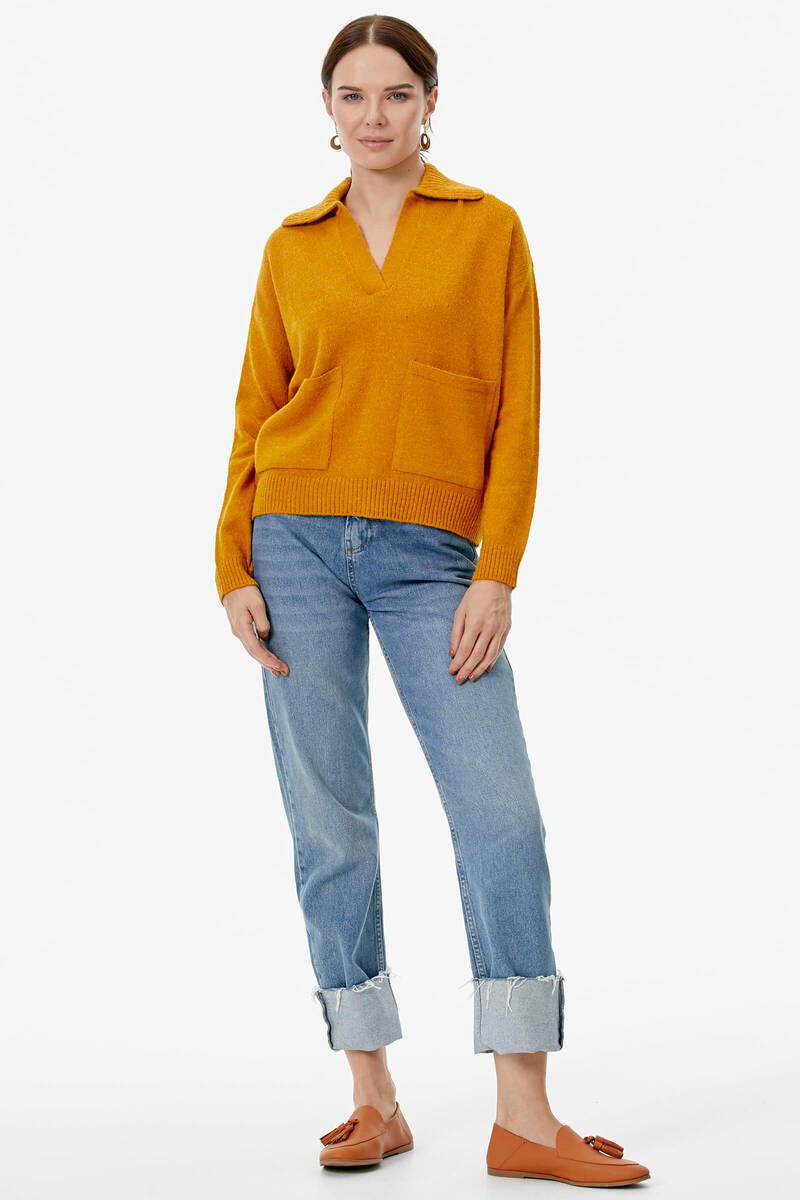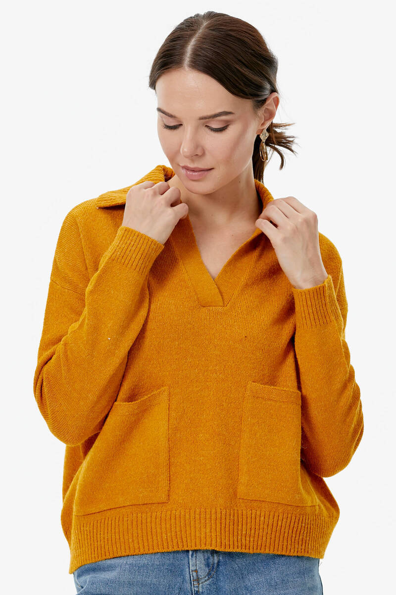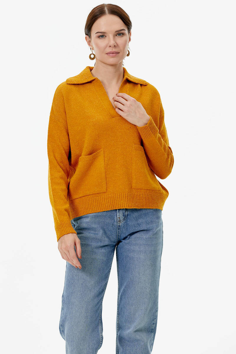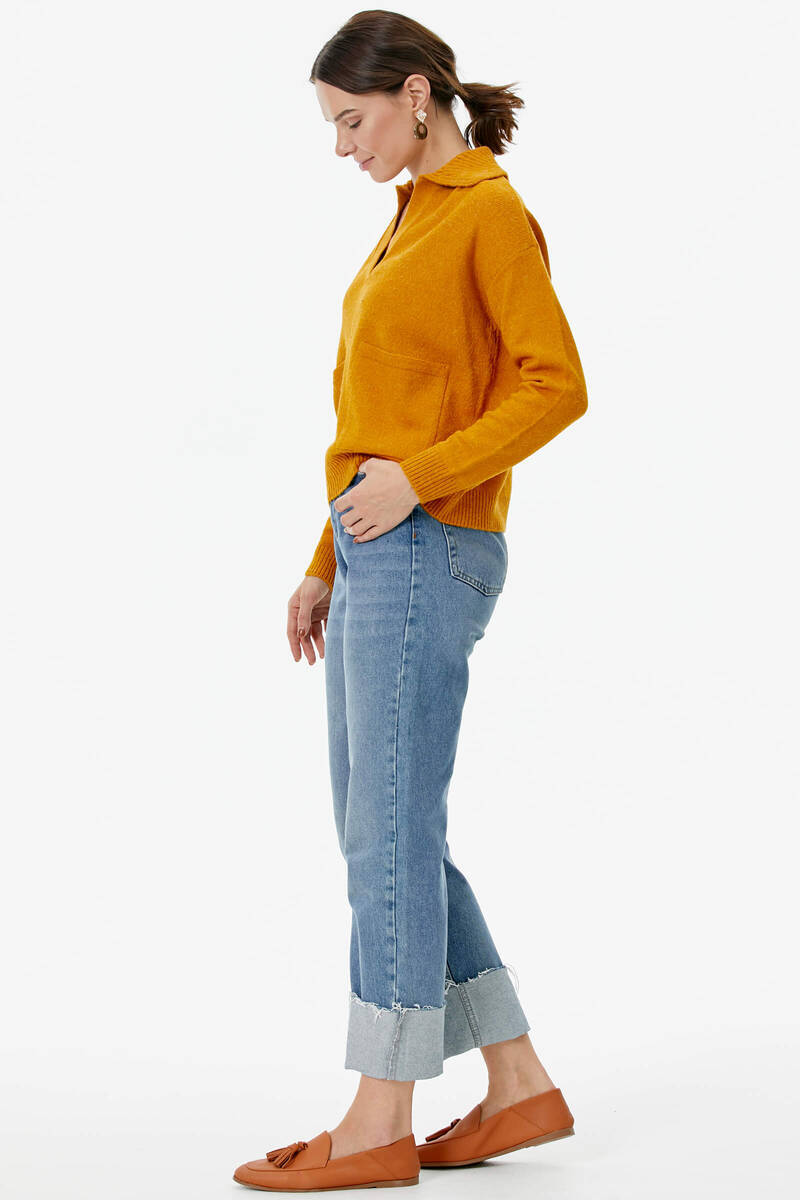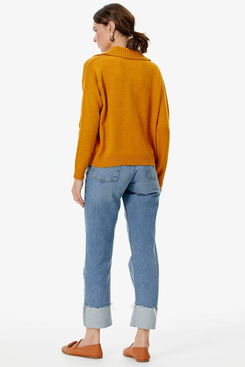 Full turtleneck, soft textured, flowing sweater designed as moon sleeves. Enlivened with motif details..