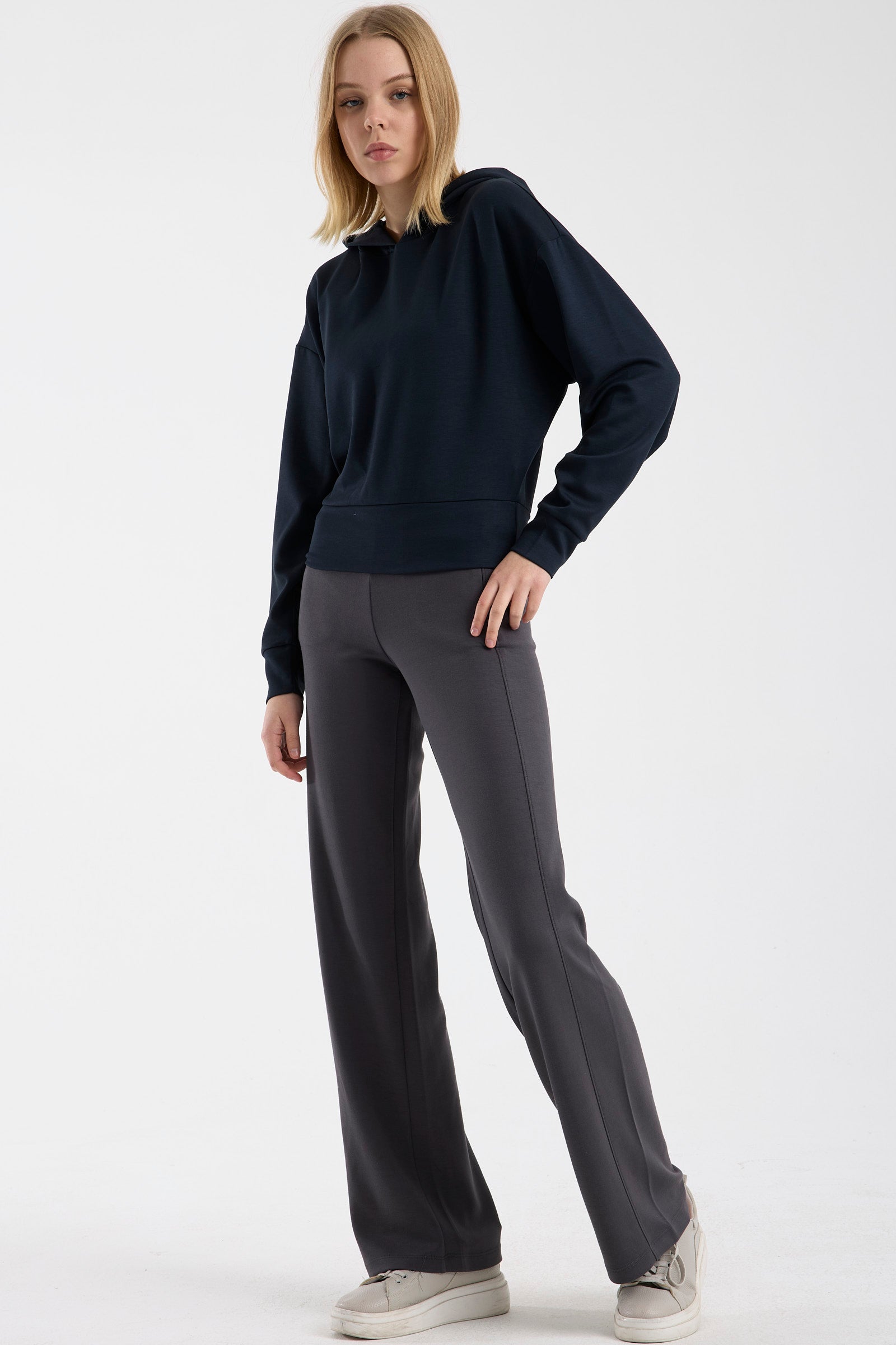 Kapüşonlu, uzun kollu crop sweatshirt. Sırtında plise detaylı, düşük kollu, nefes alabilen kumaştan üretilmiştir.