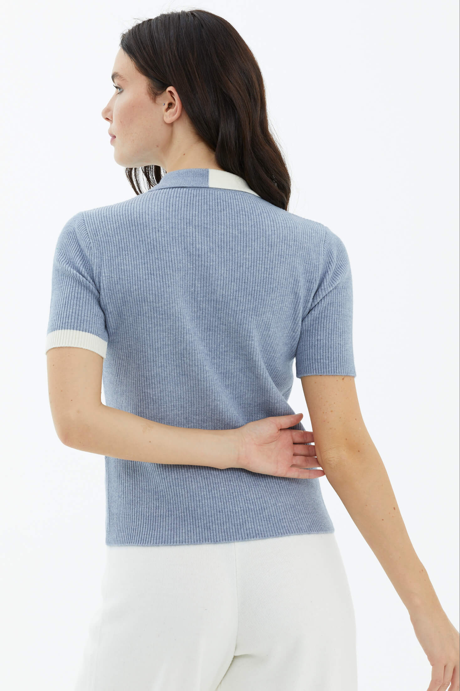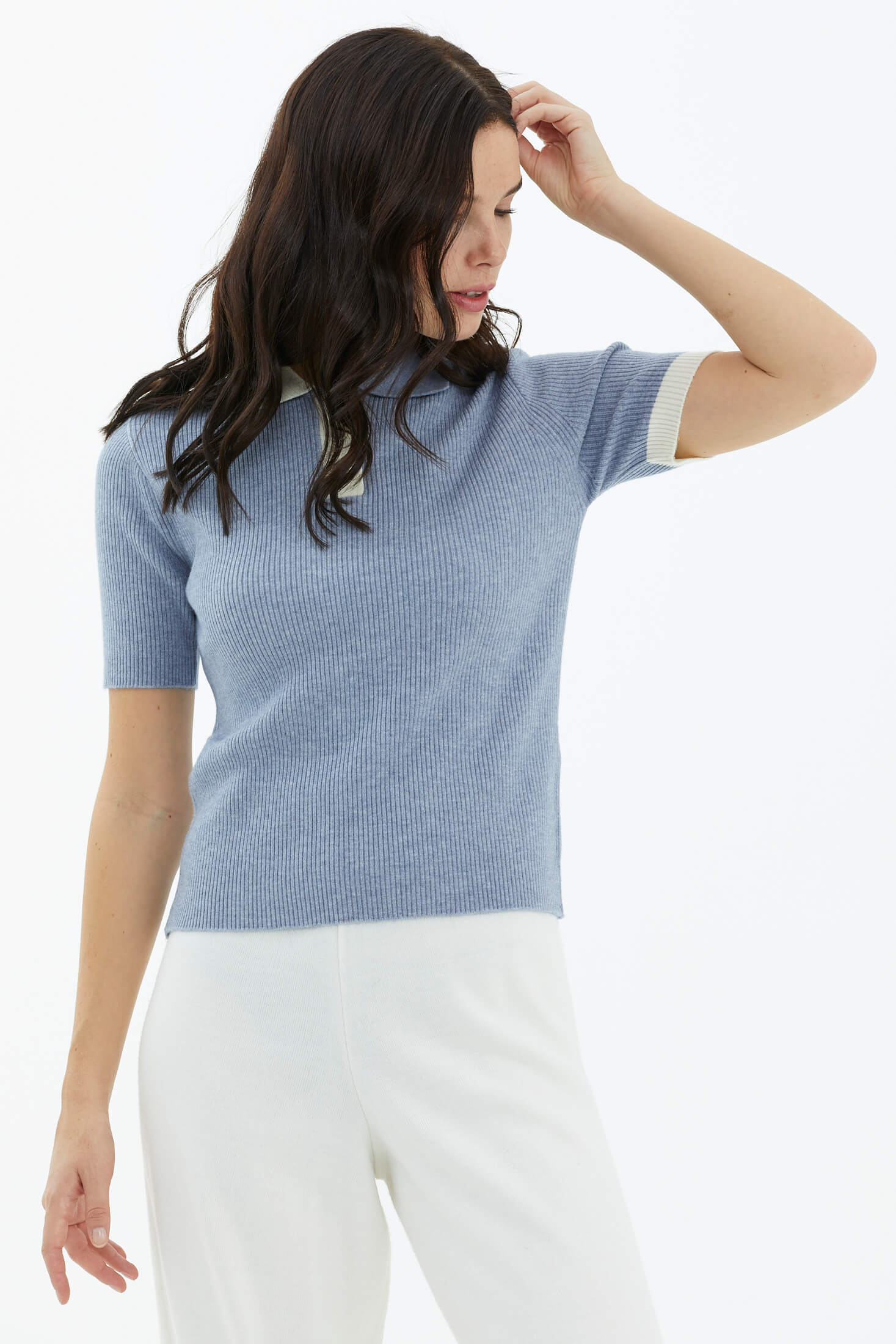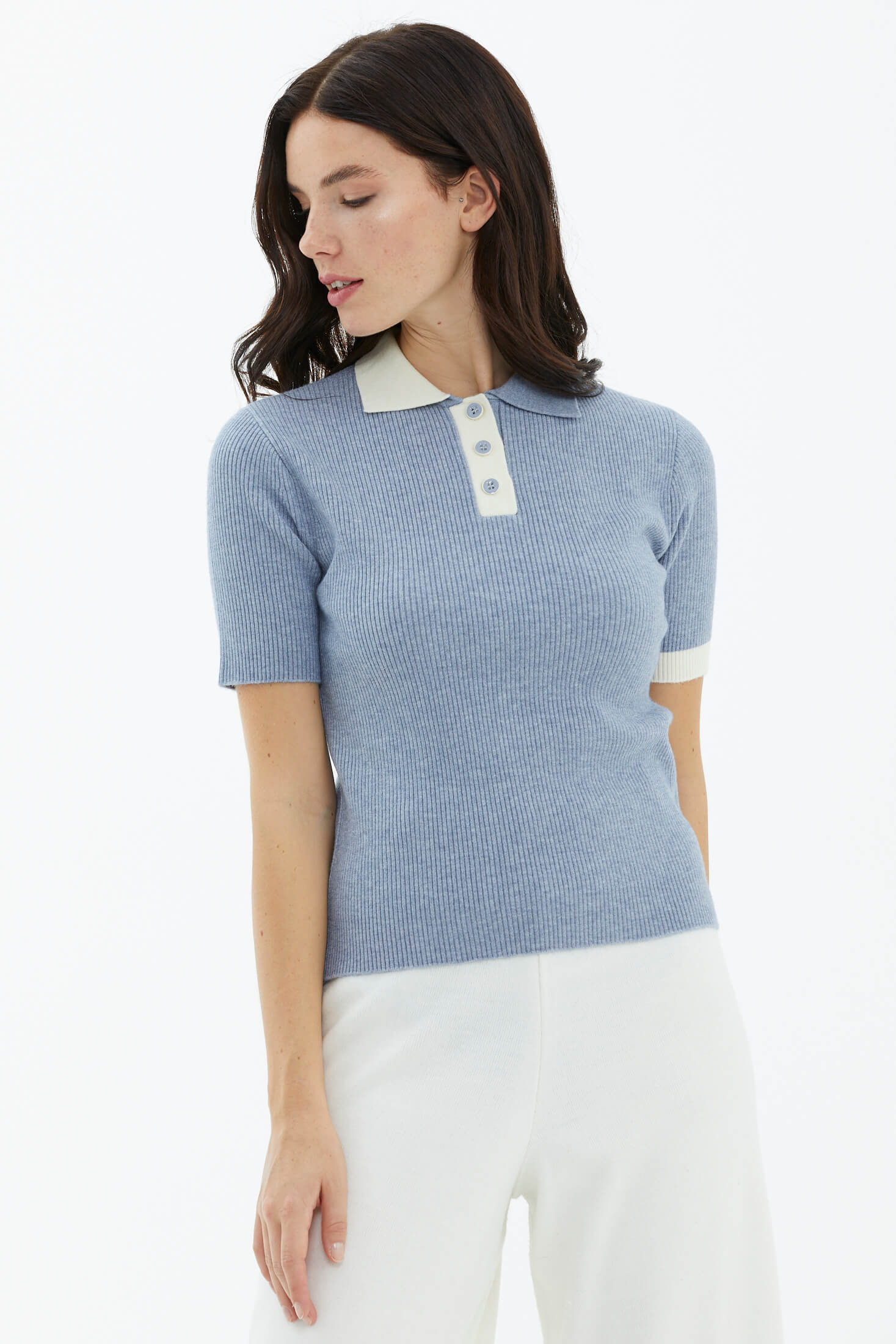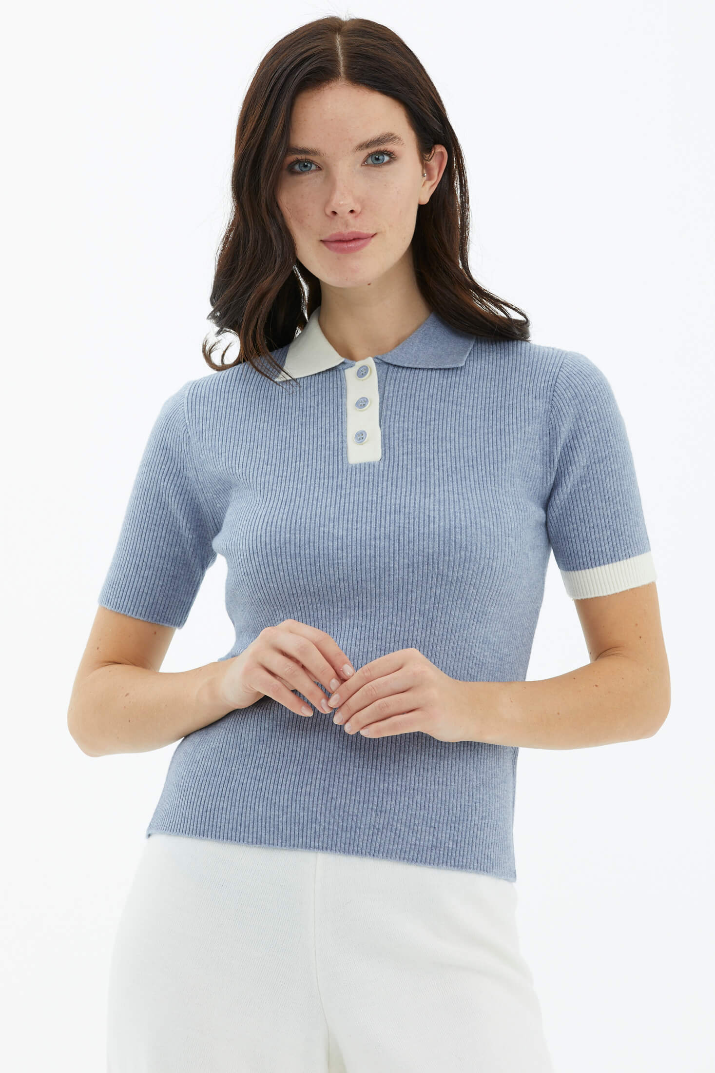 Fitted derby knit sweater with a polo collar, short sleeves, button fastening.