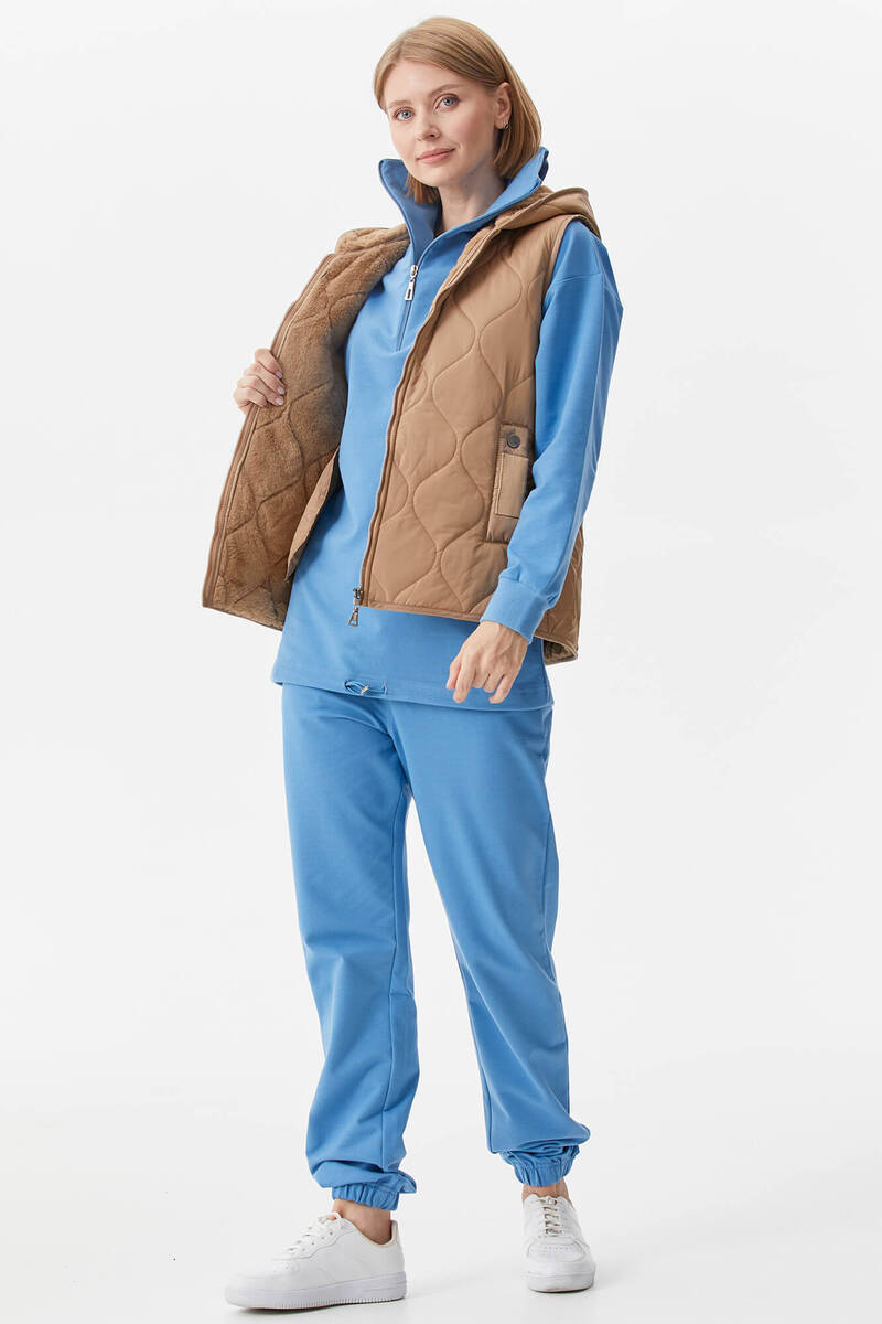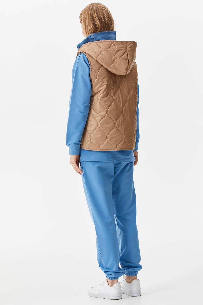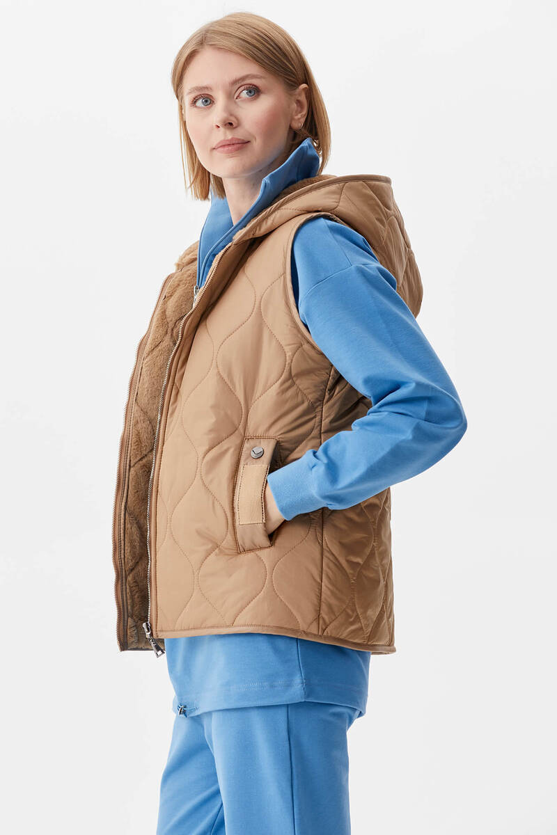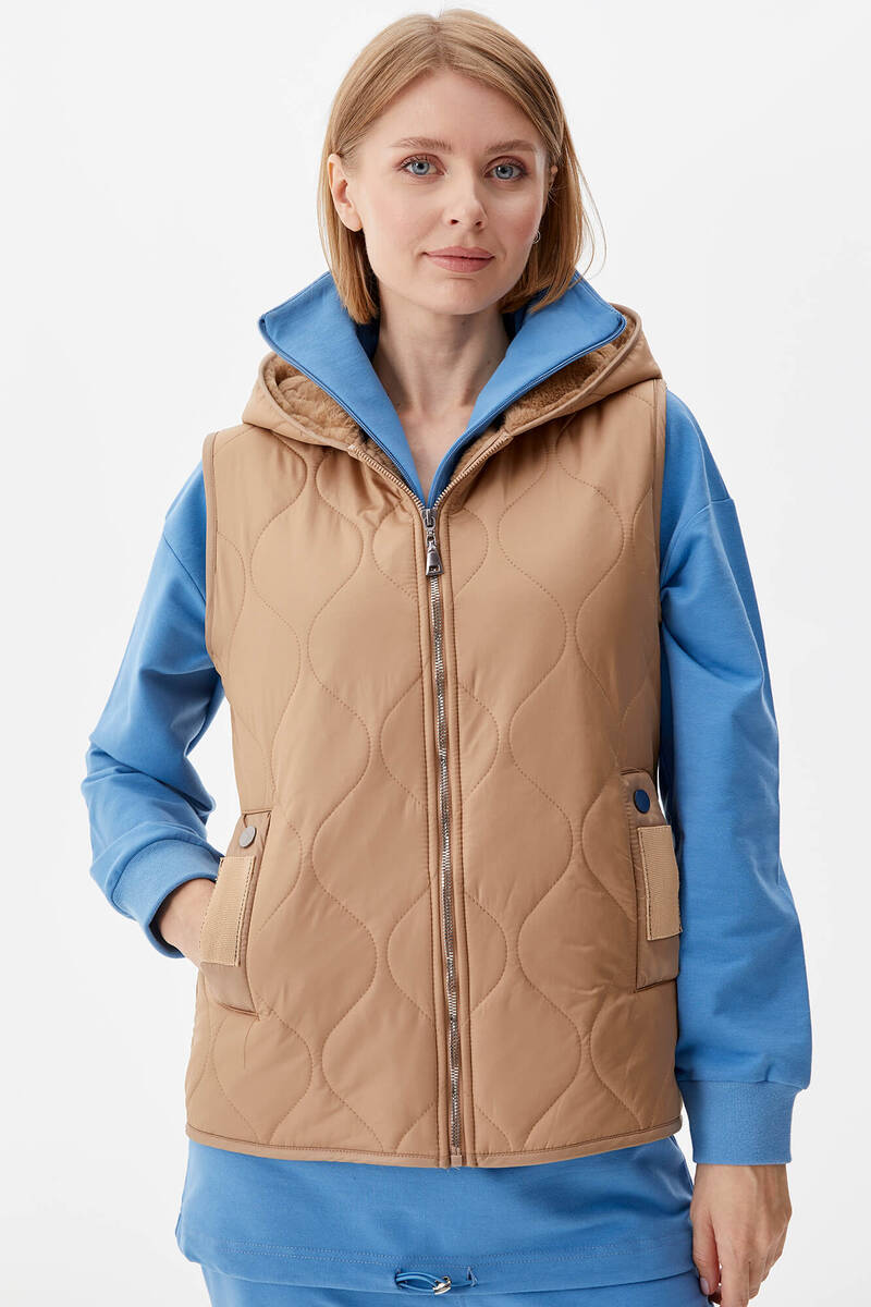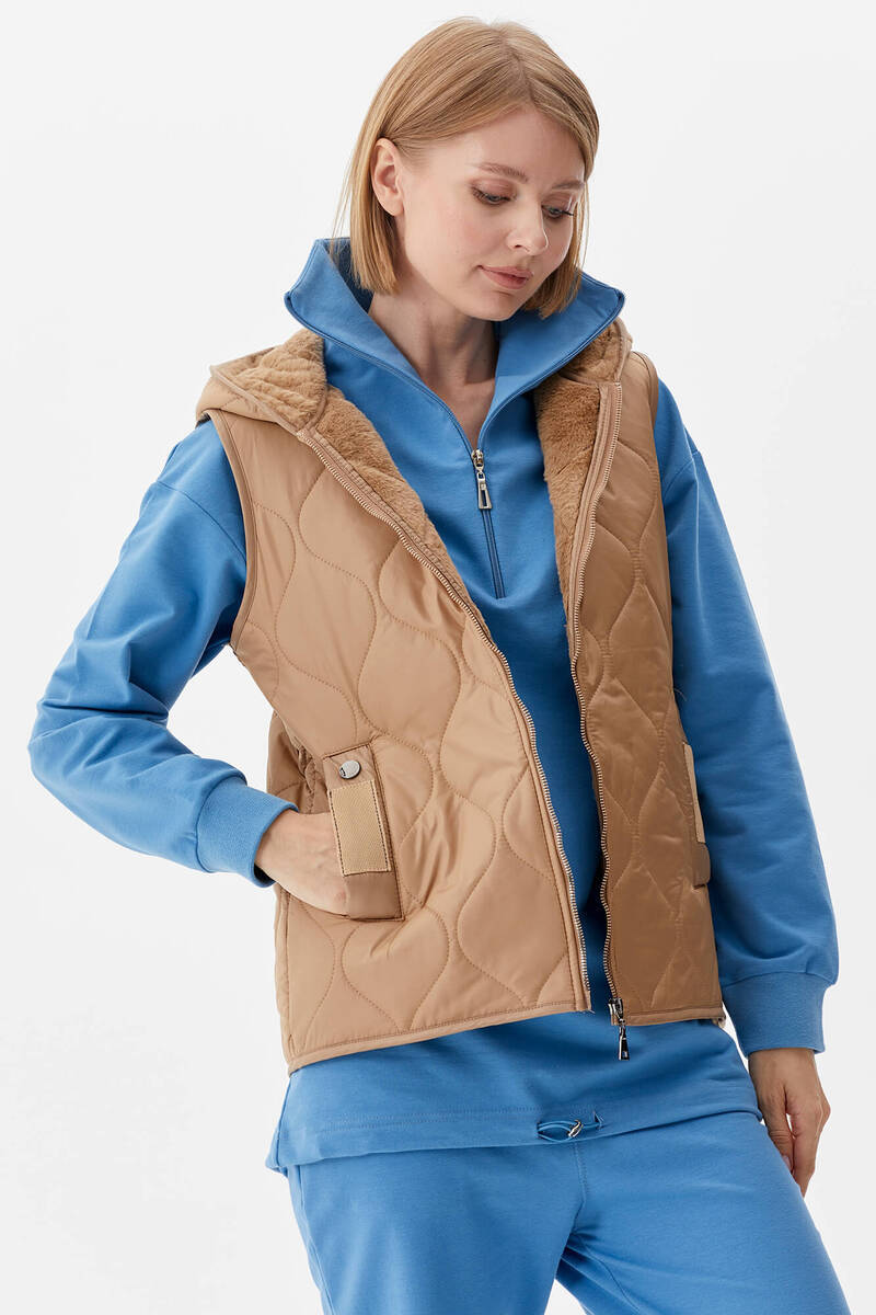 The vest, which is made of woven quilted fabric, has a zipper closure on the front, draws attention with its hooded form and plush shearling design, has a pocket on the side surface.
