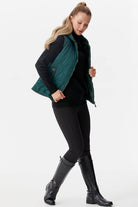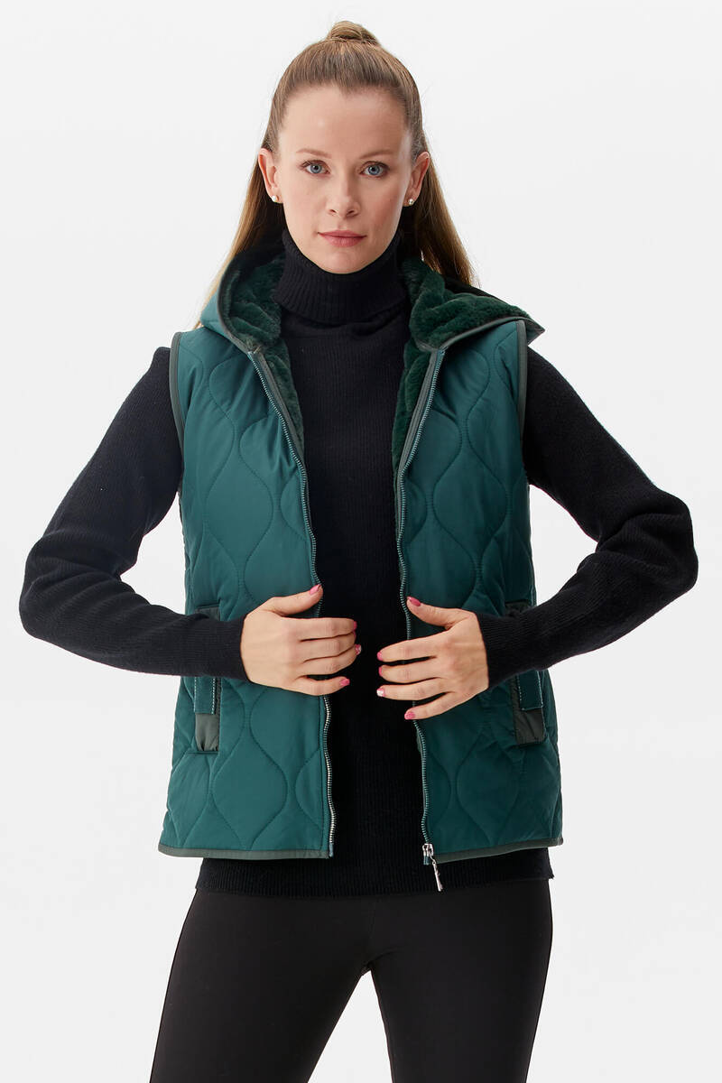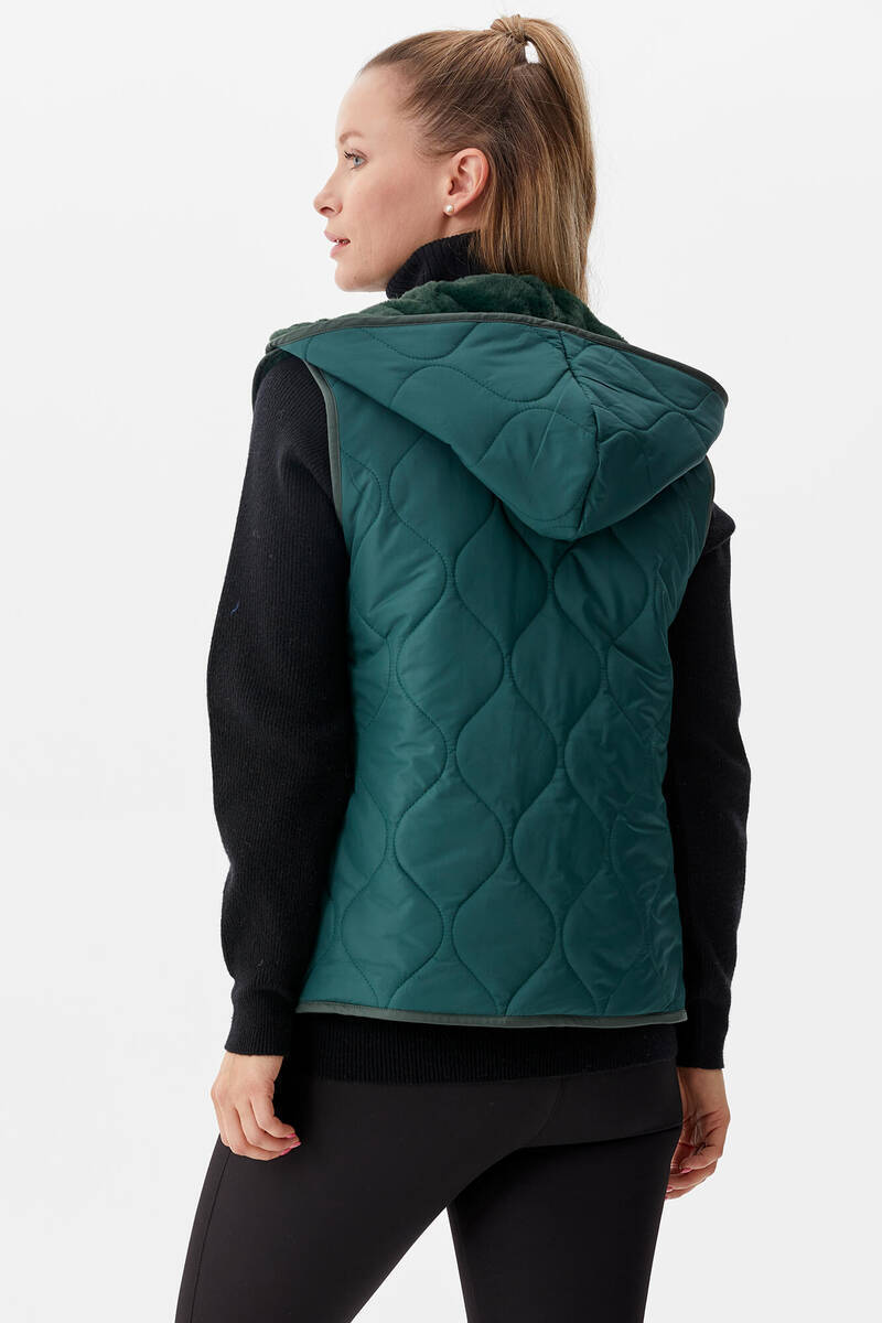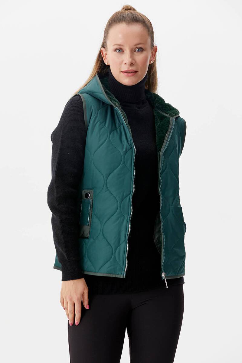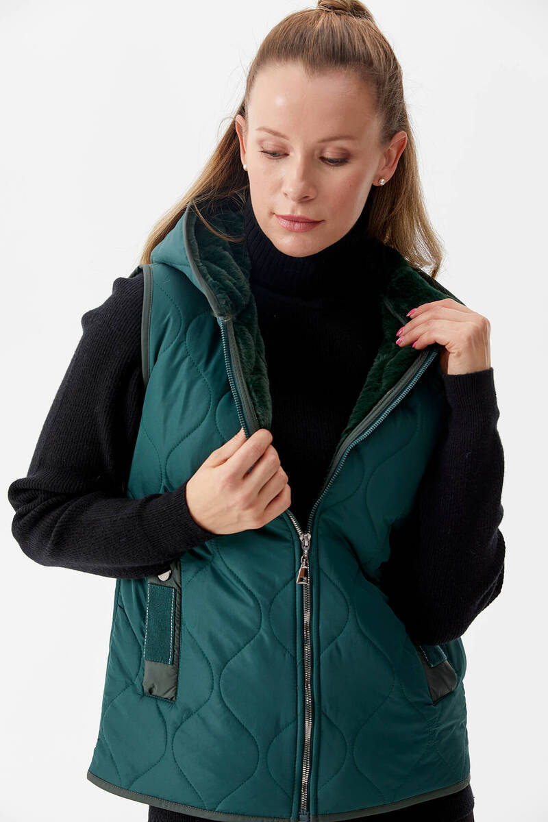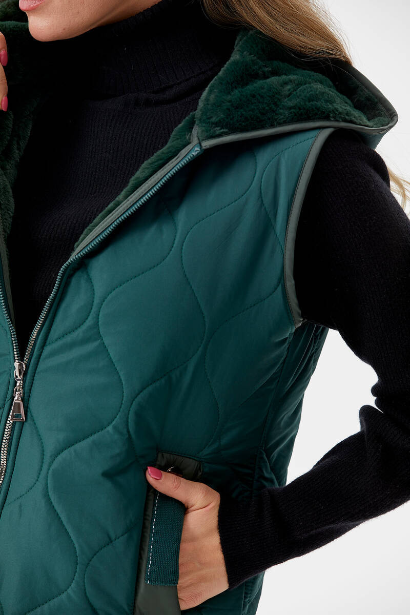 The vest, which is made of woven quilted fabric, has a zipper closure on the front, draws attention with its hooded form and plush sheepskin design. There is a pocket on the side surface.