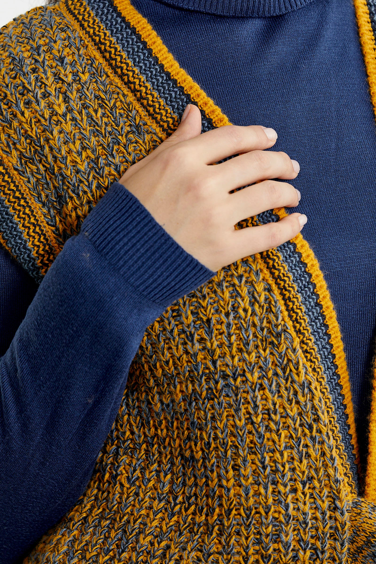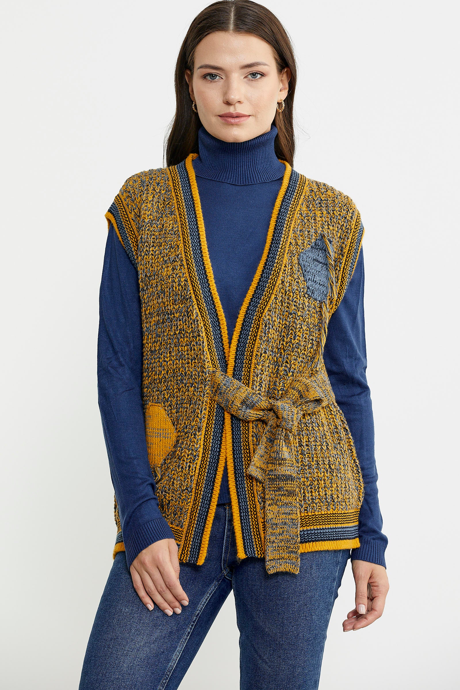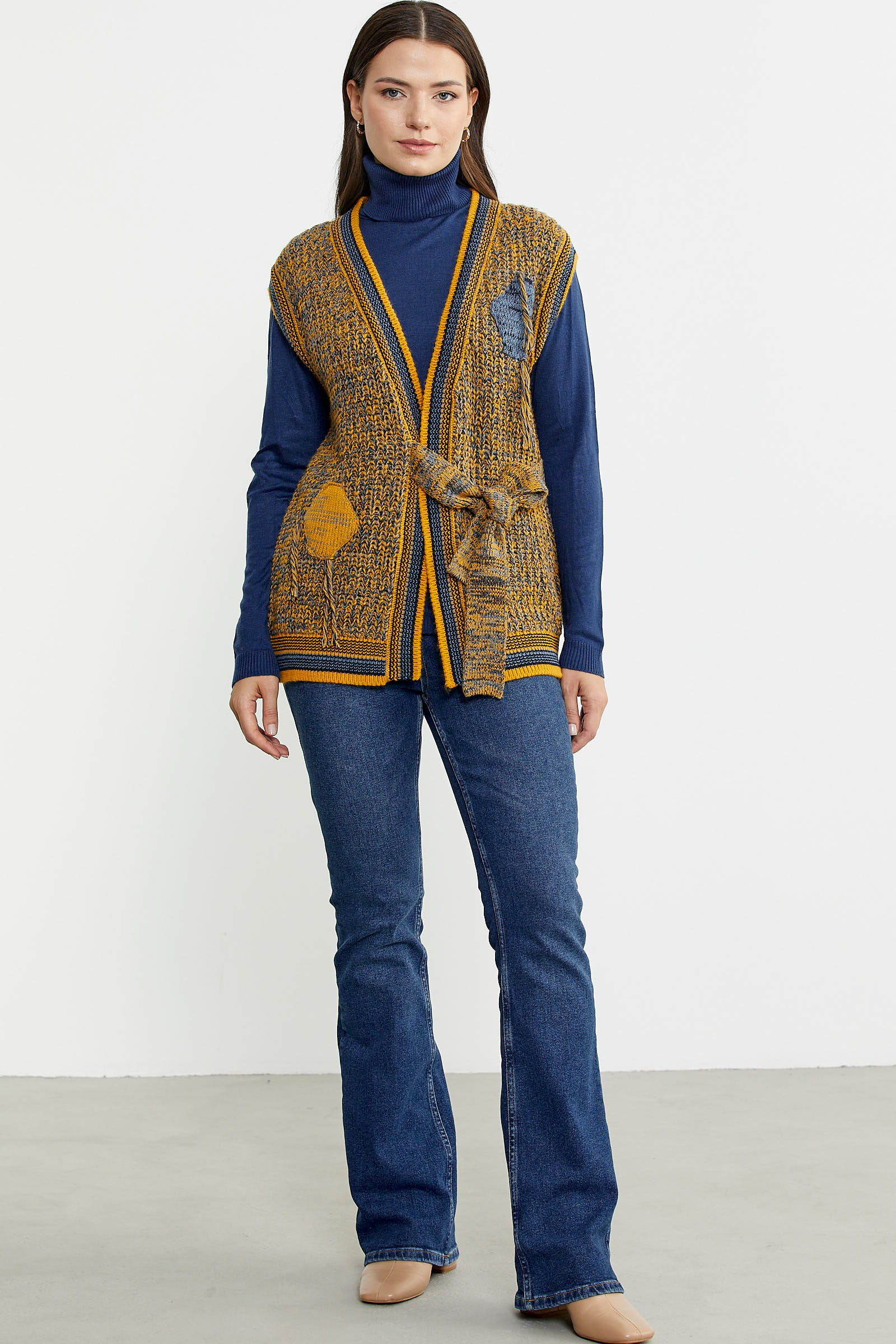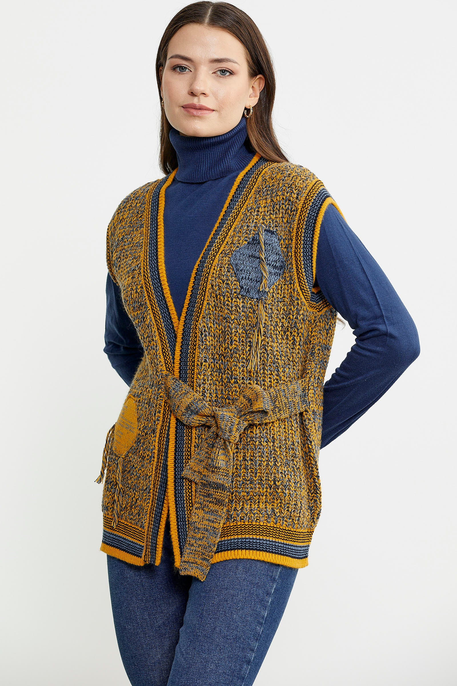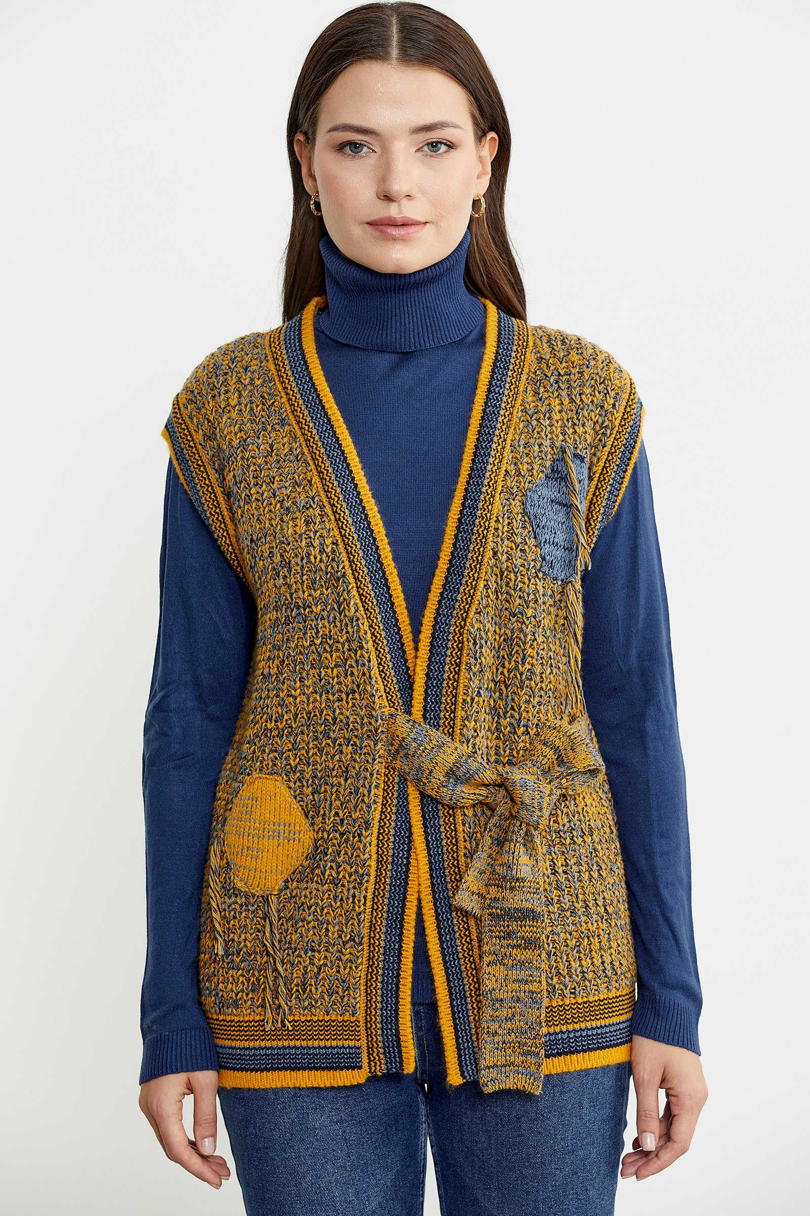 Knitted mainly from wool, the knitted vest stands out with its tied belt detail. It is colorful and mottled.