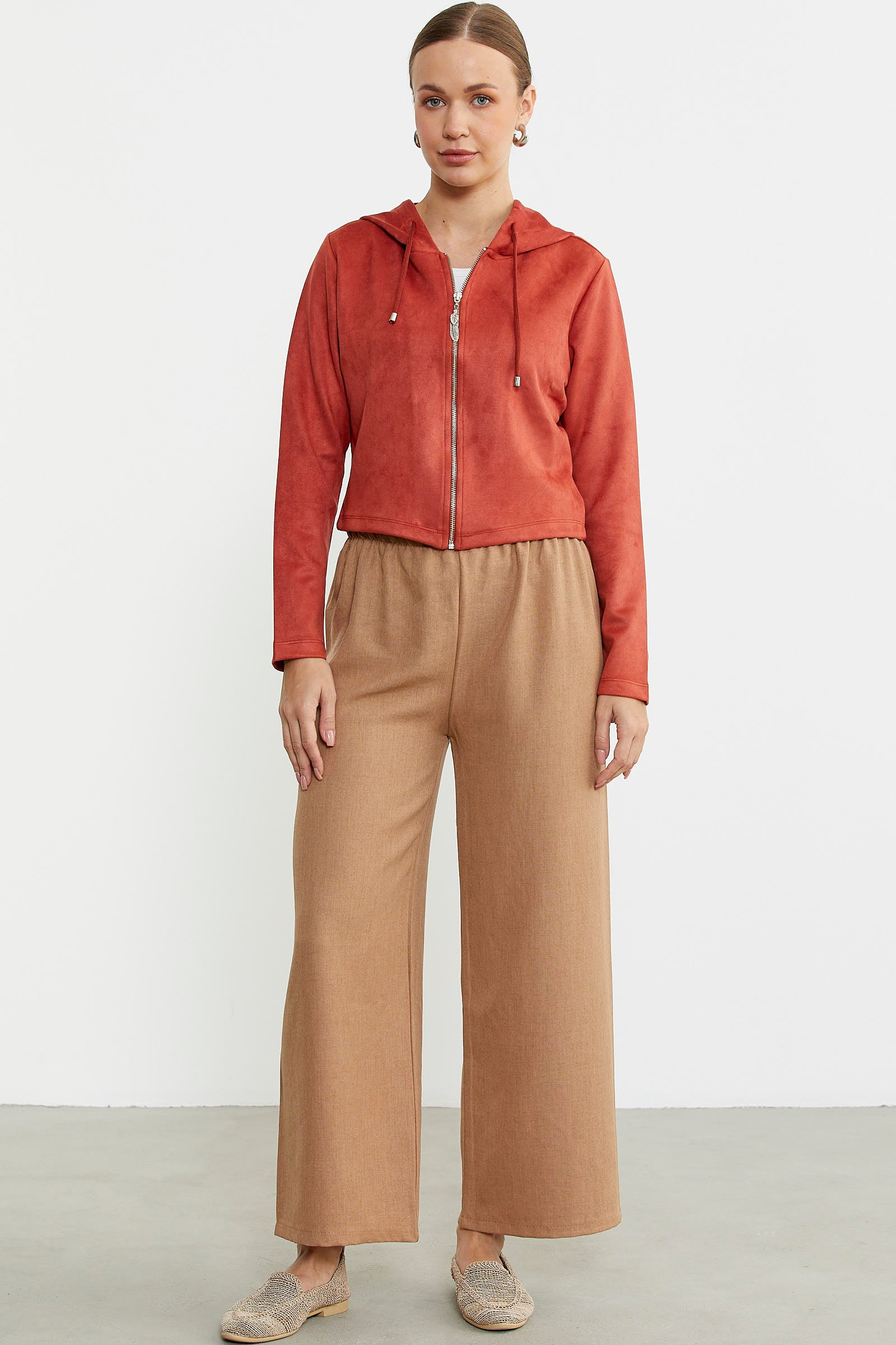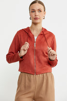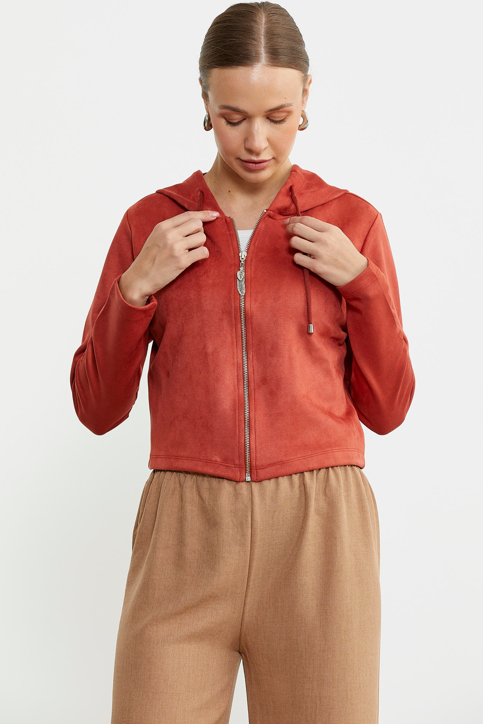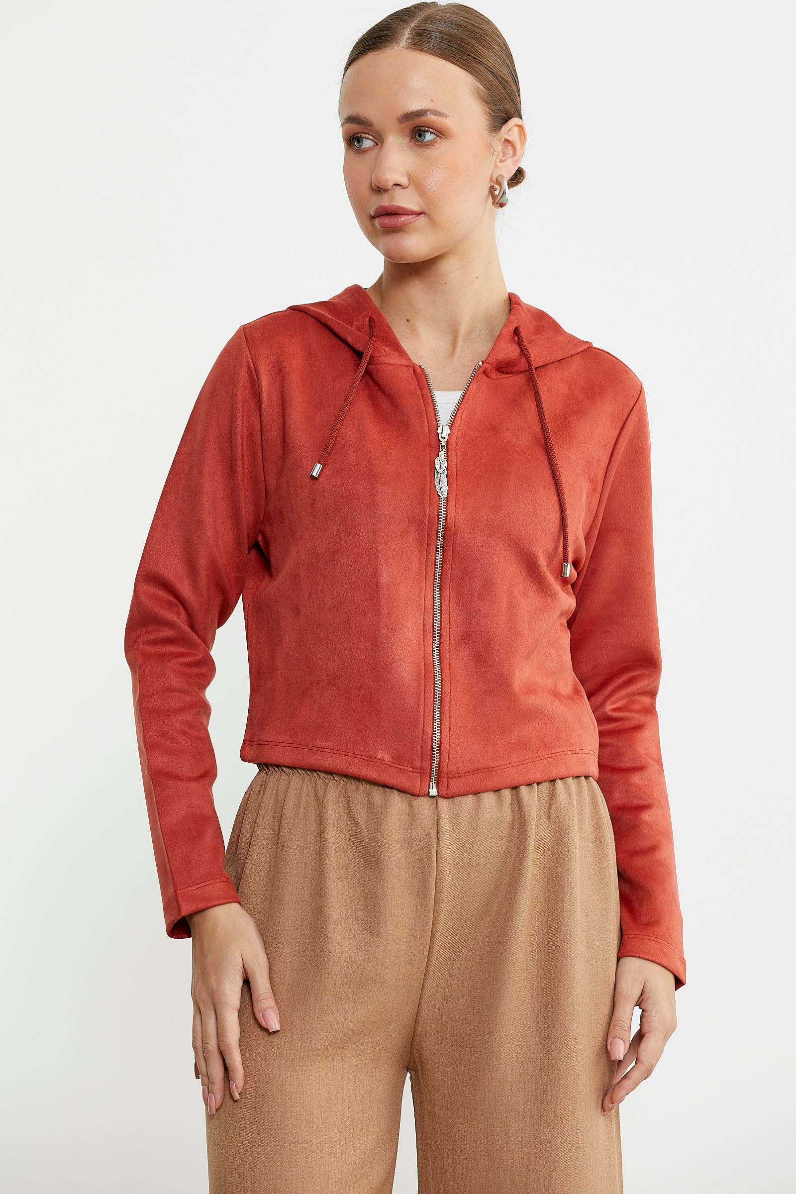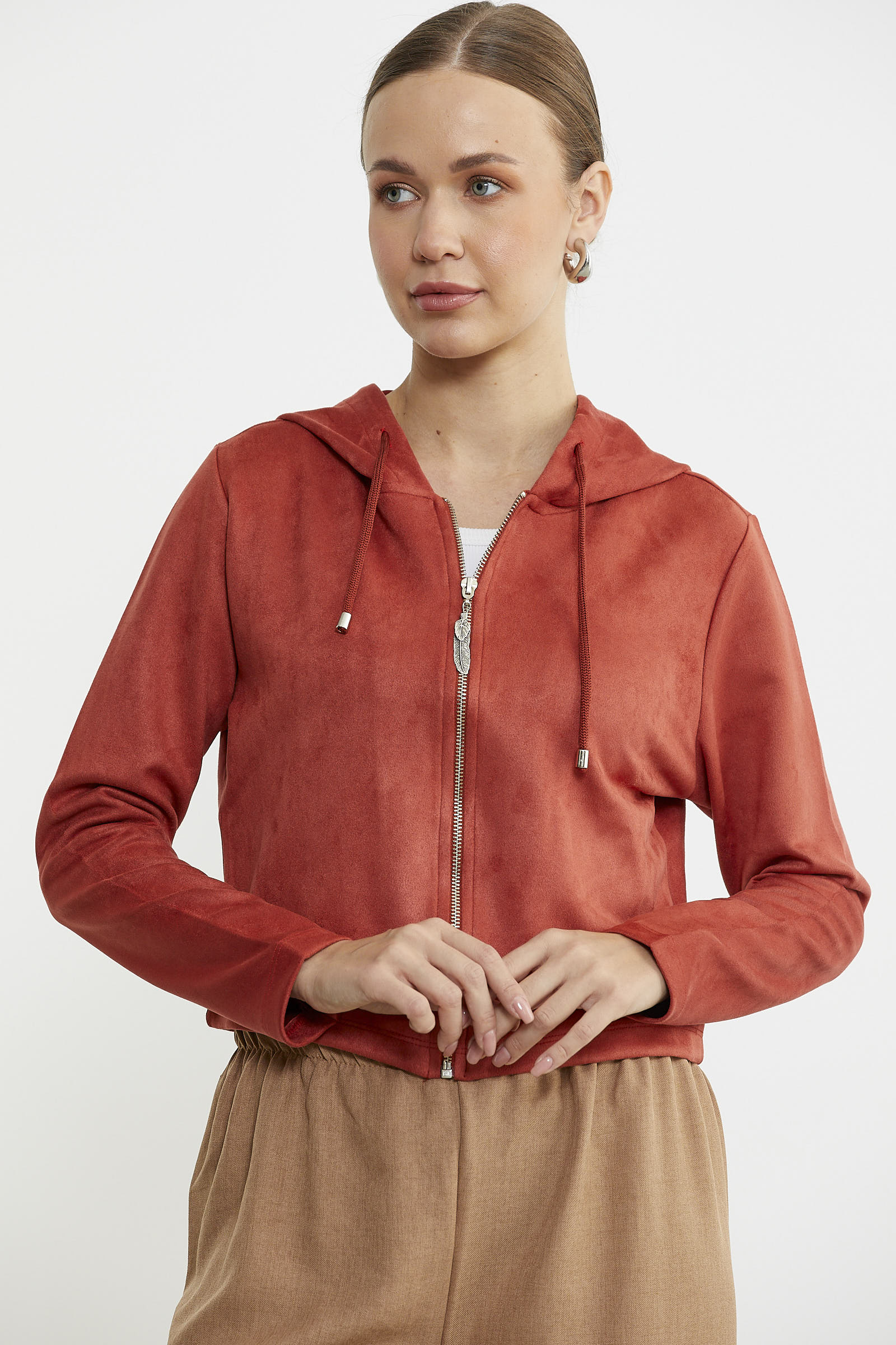 Faux suede bomber jacket. Zippered front. Hooded. Slim fit.