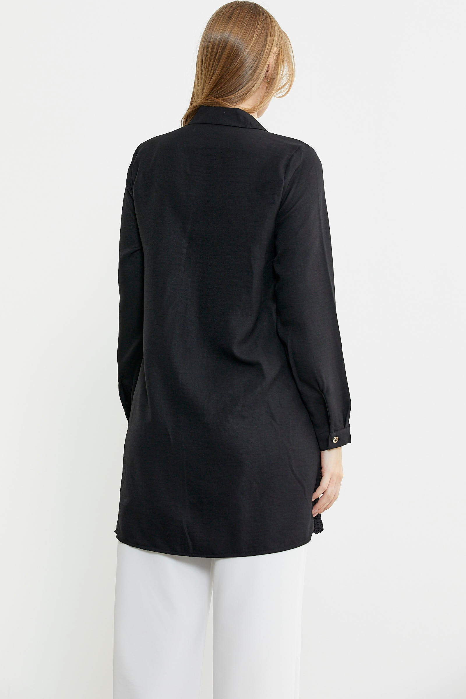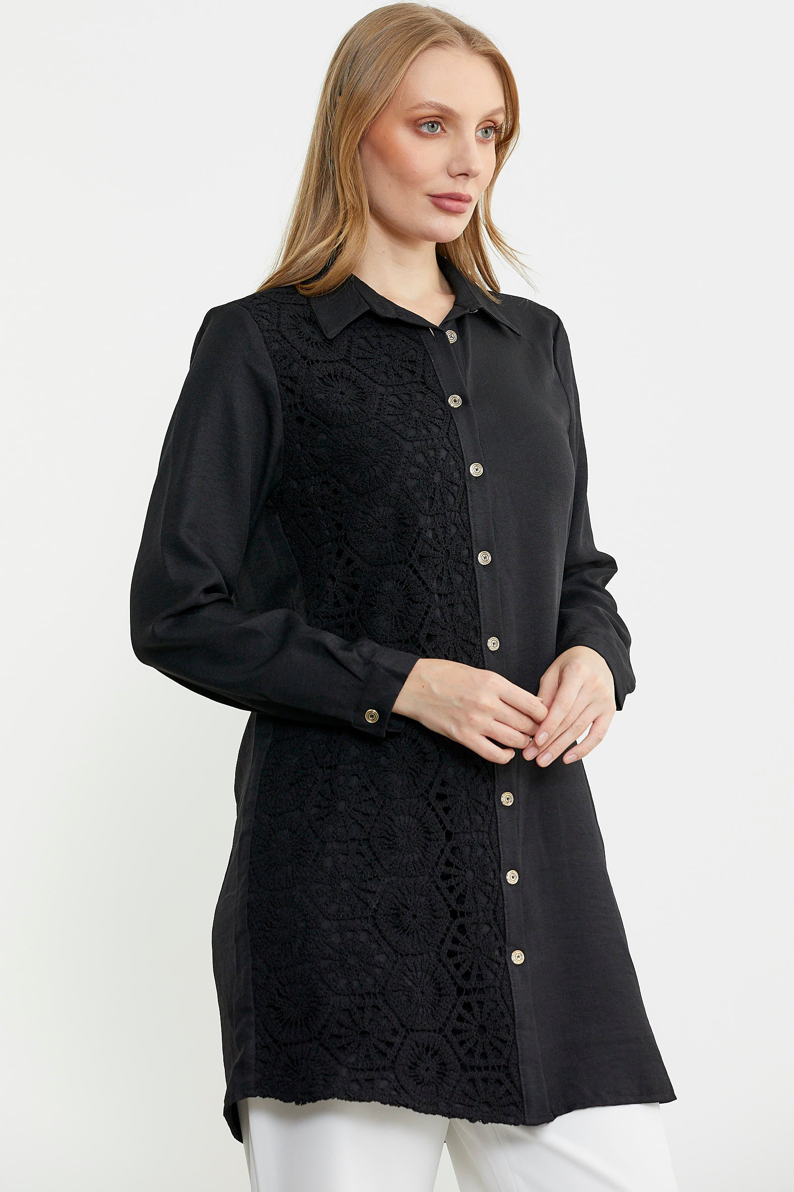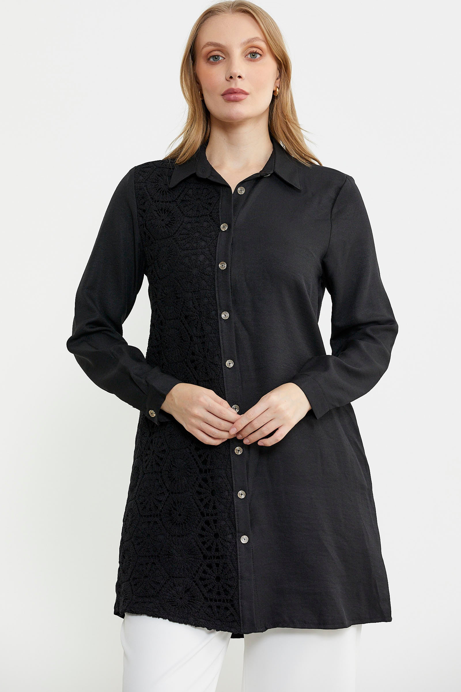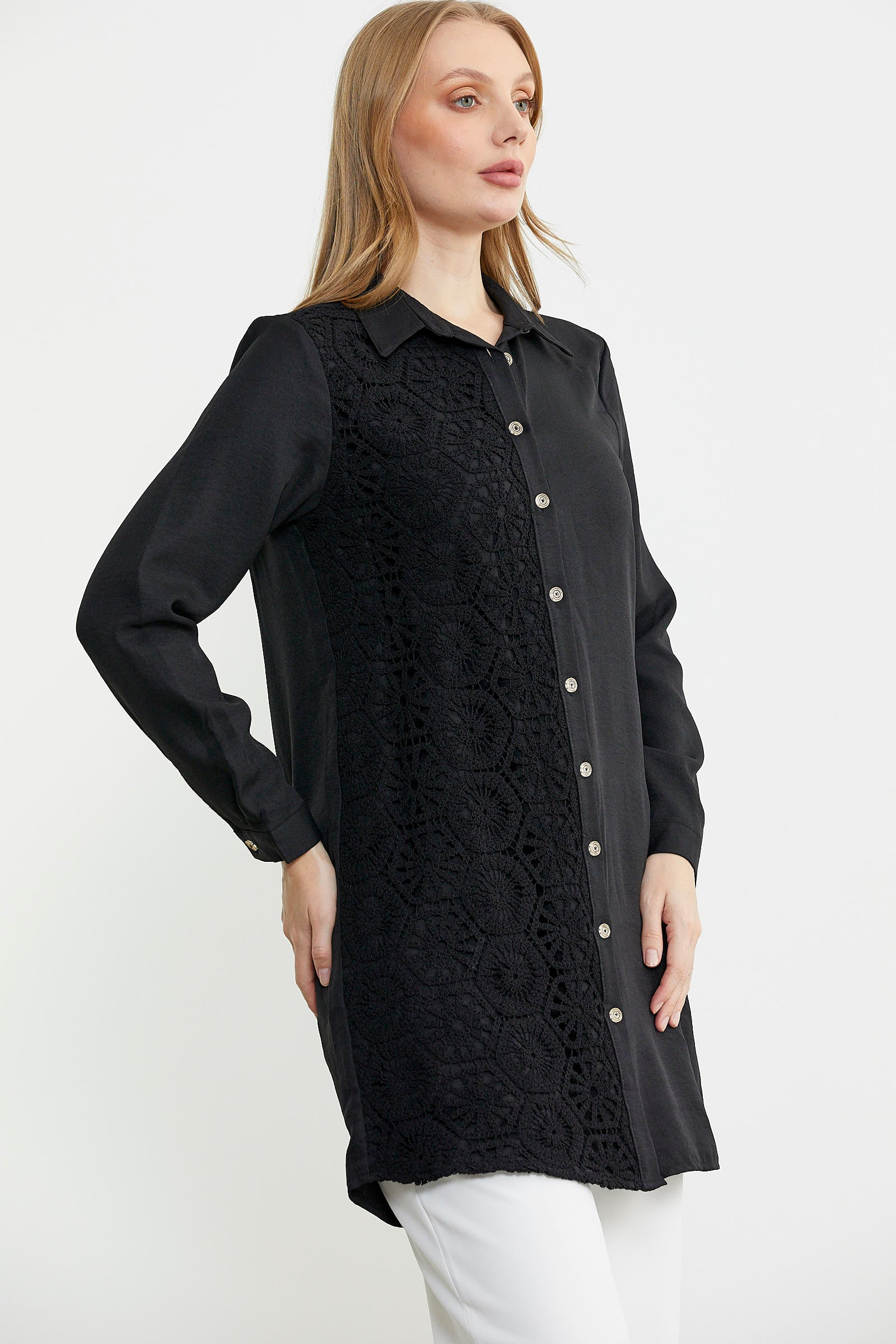 The shirt, which is enlivened with the colorful lace detail used on the front single piece, is produced as a tunic length and comfortable fit.