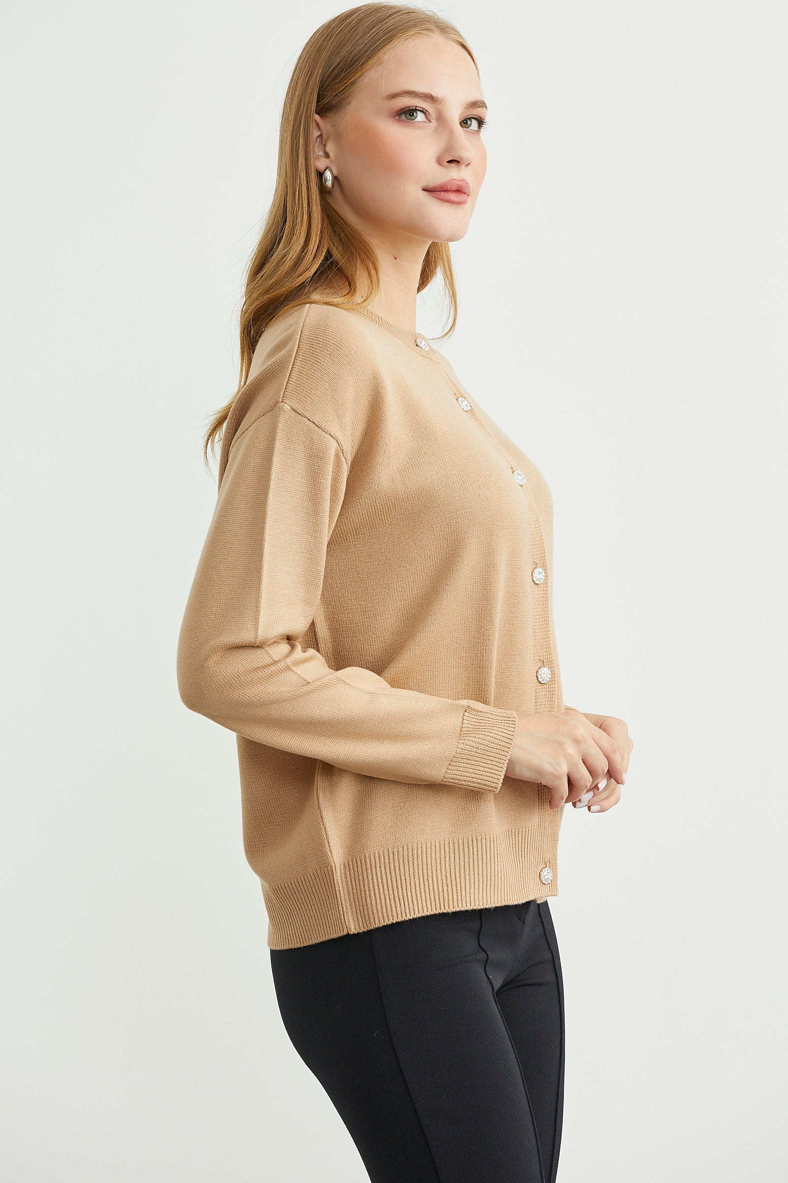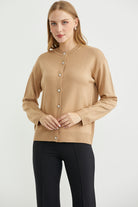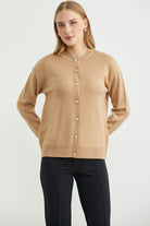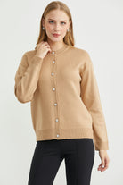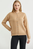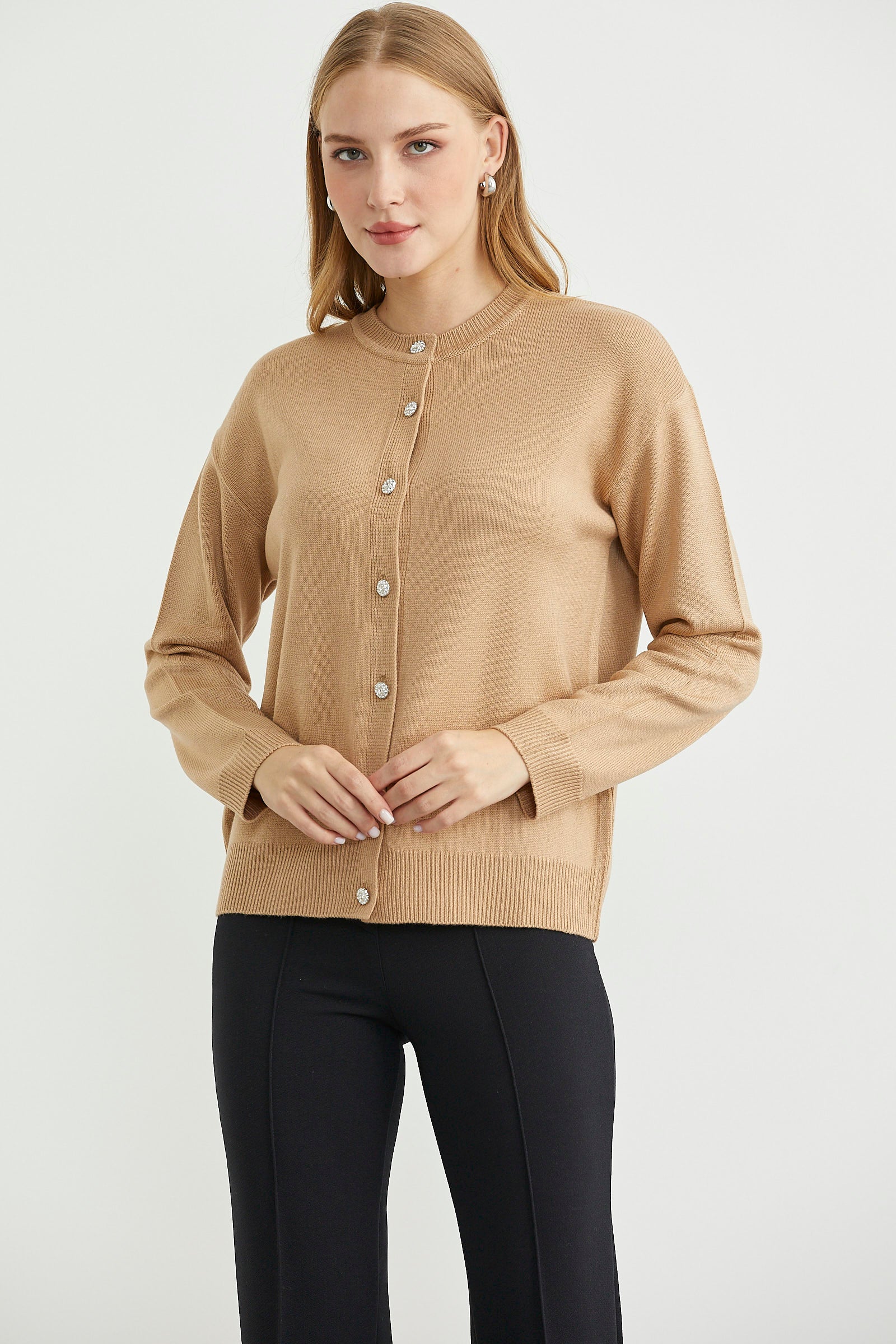 Düğme Detaylı Sıfır Yaka Triko Hırka - Kamel