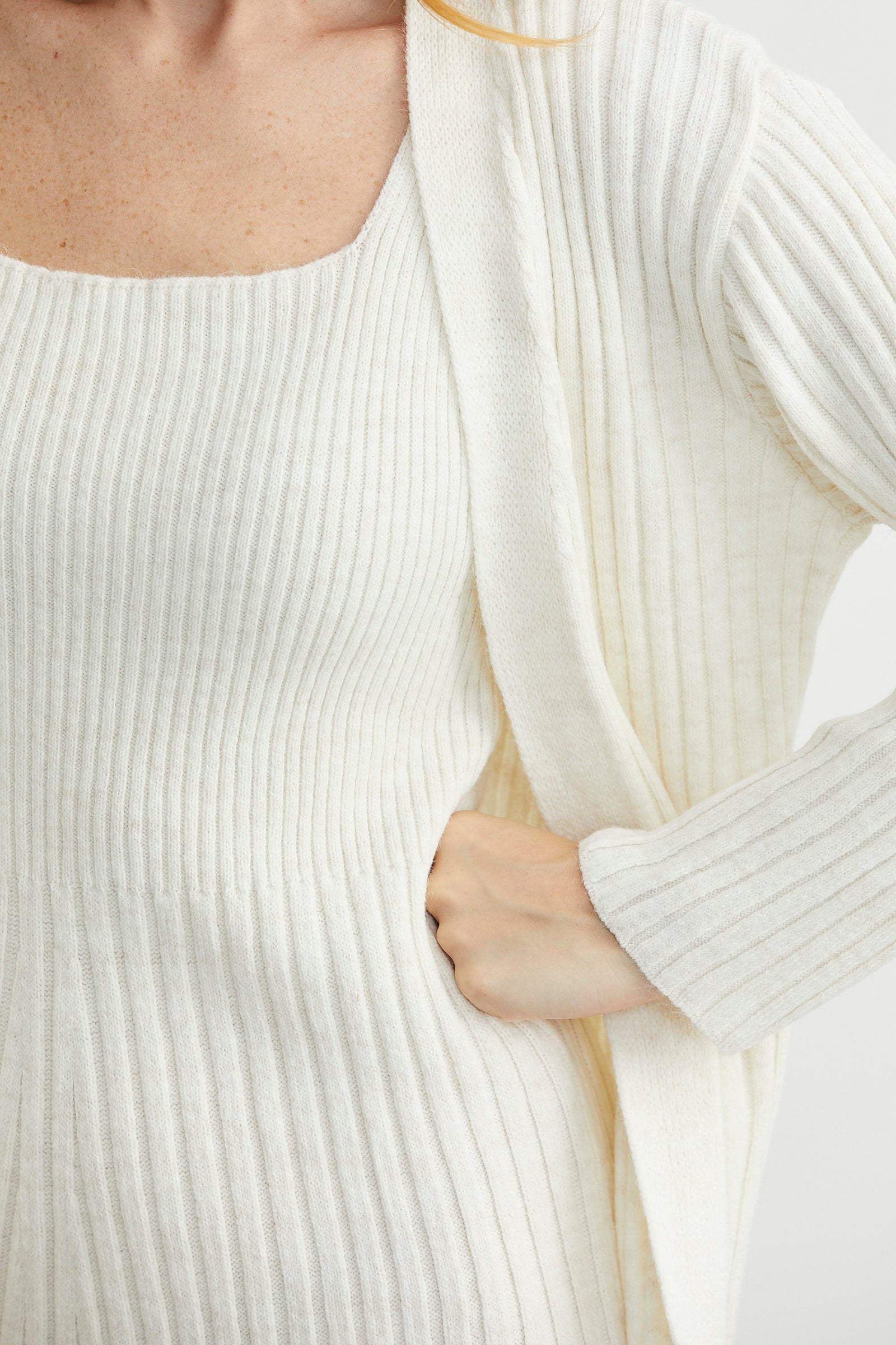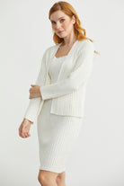 Yumuşak, lastik örgülü elbise takım. Diz boy. Aynı dokuda renge renk triko hırka ile birlikte üretilmiştir.