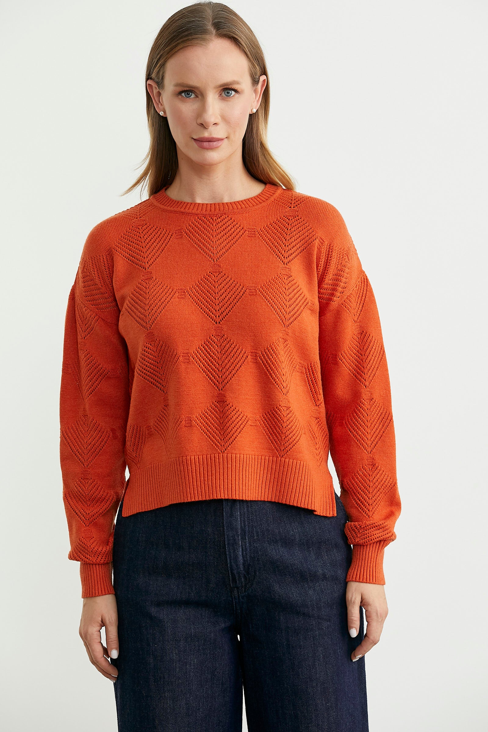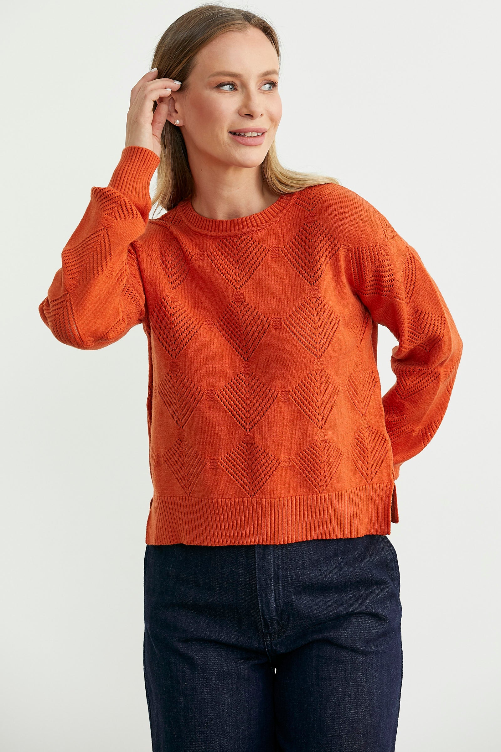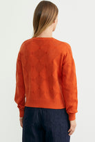 Yuvarlak yakalı, delik desenli, düşük omuzlu, ince triko kazak.